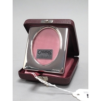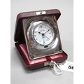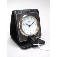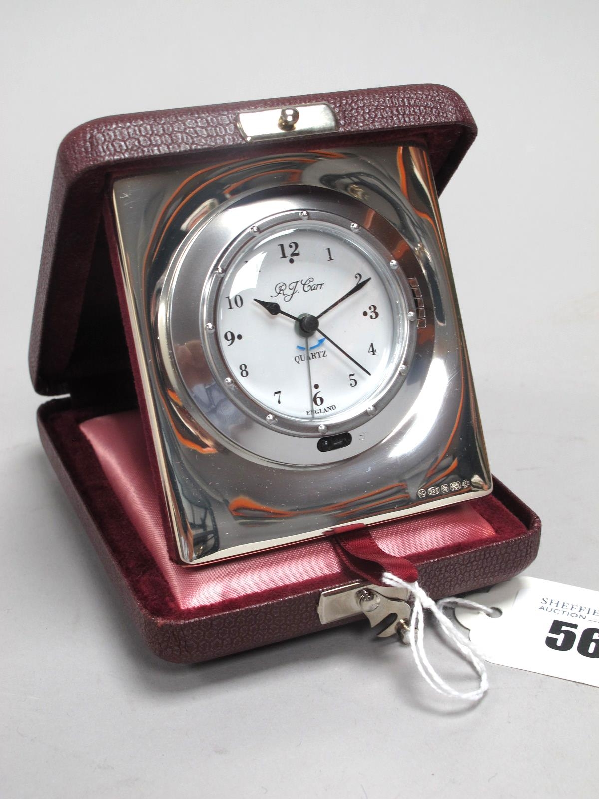 A Modern Hallmarked Silver Mounted Travelling Clock, RC (Carrs), Sheffield 2000, the rectangular frame fitted with circular quartz clock, within plush lined folding case, boxed.