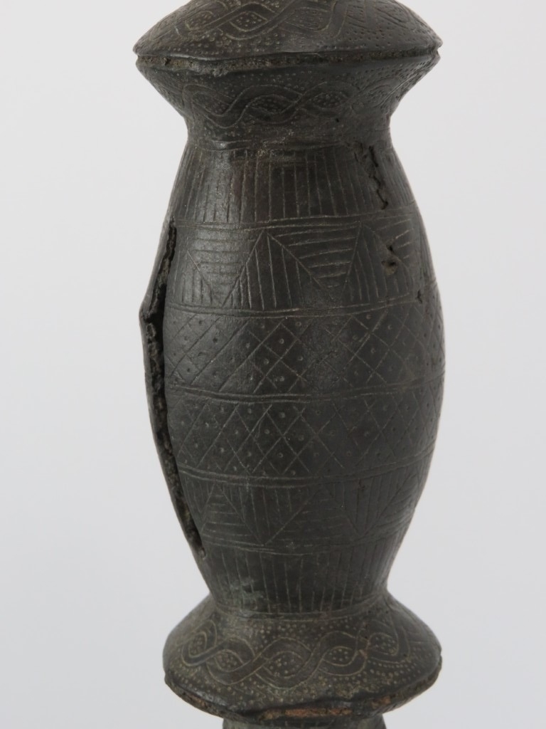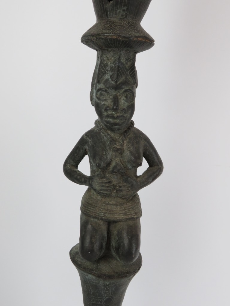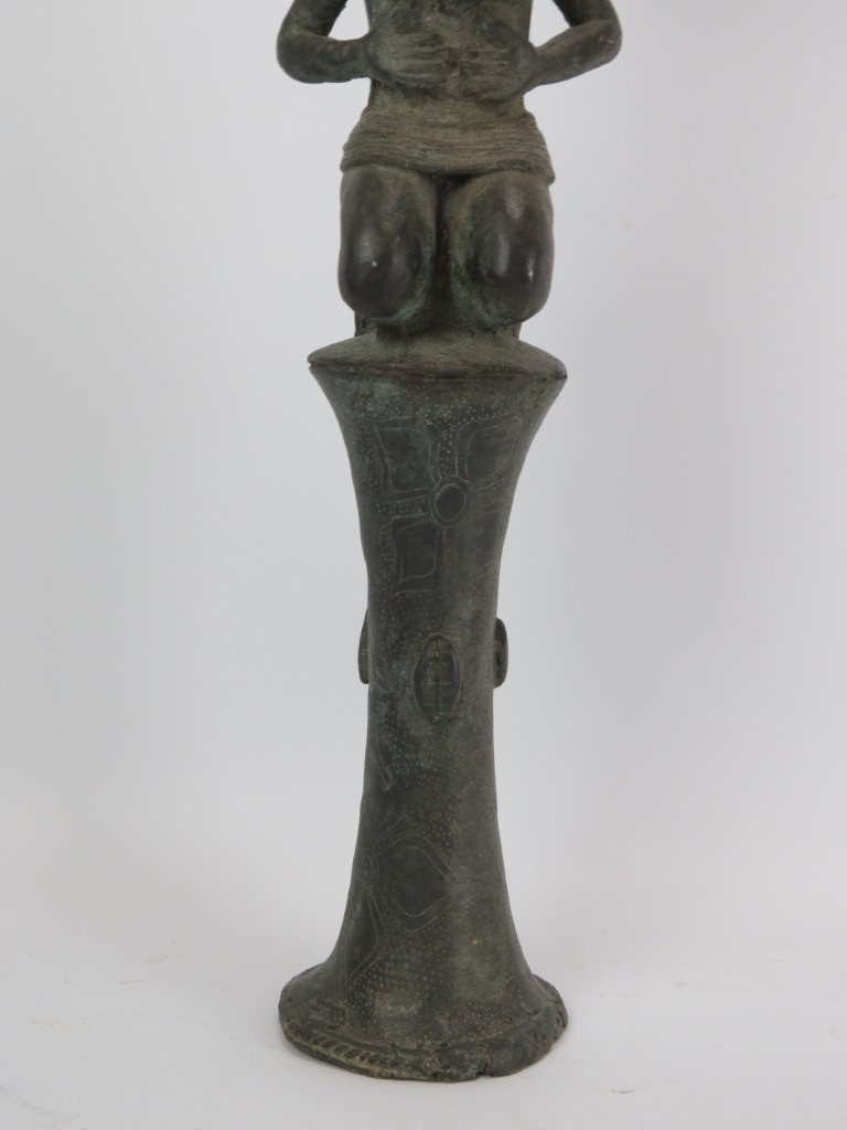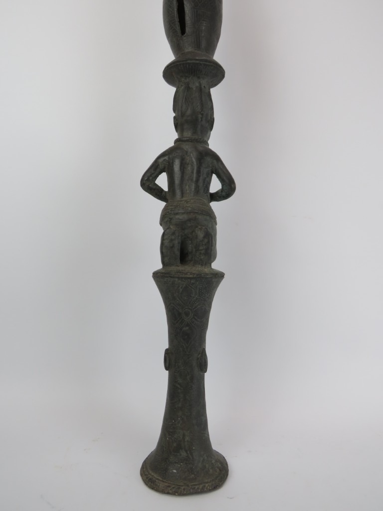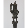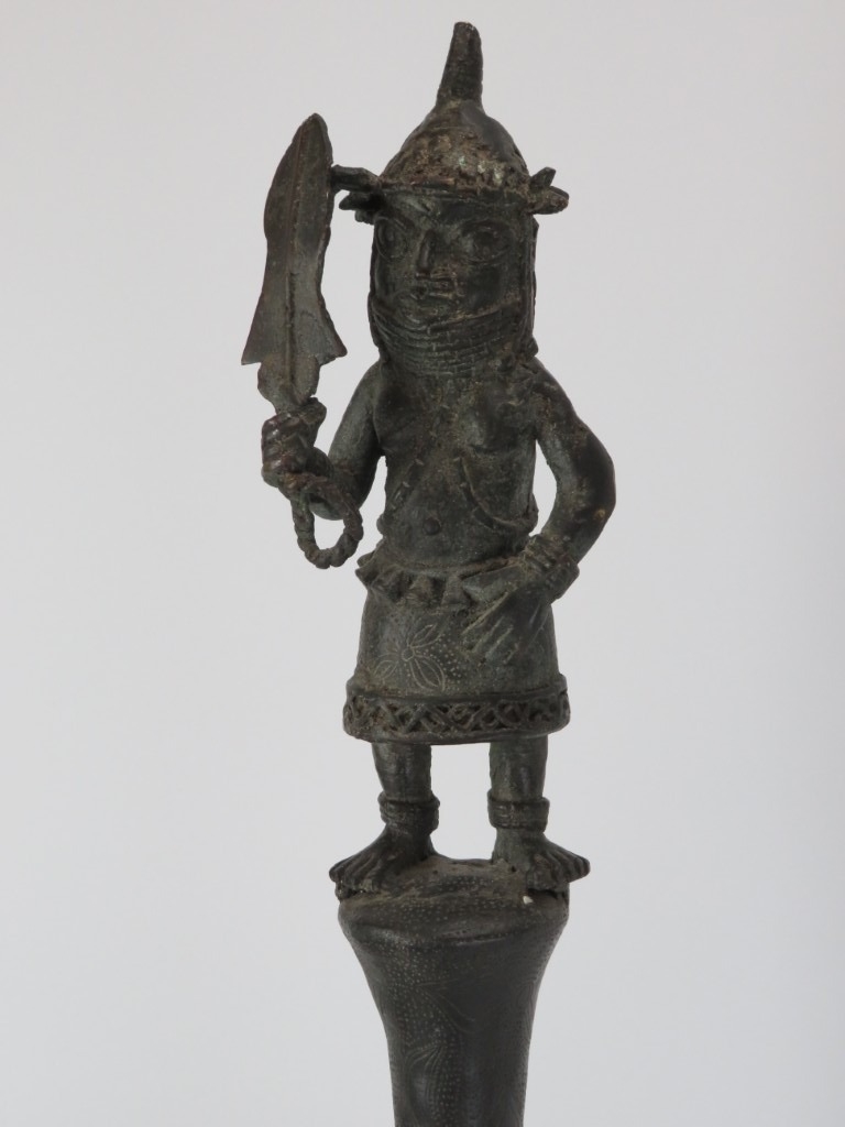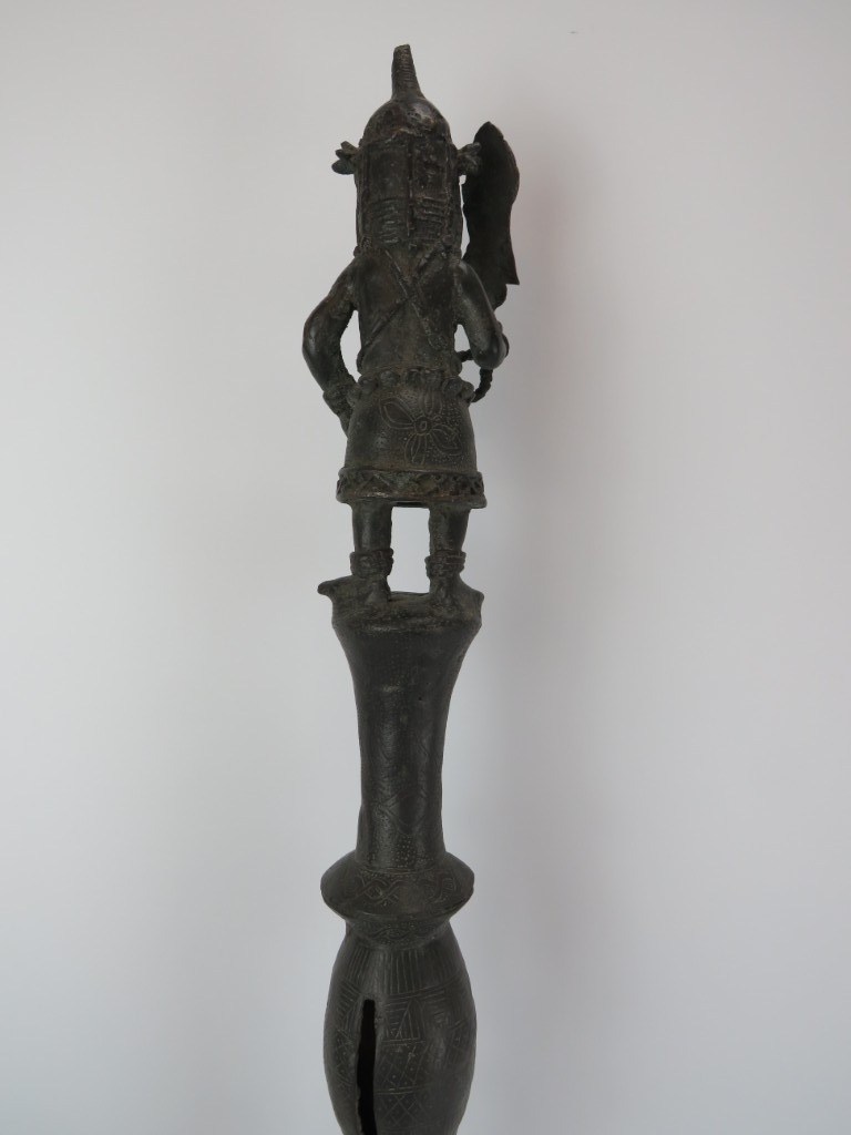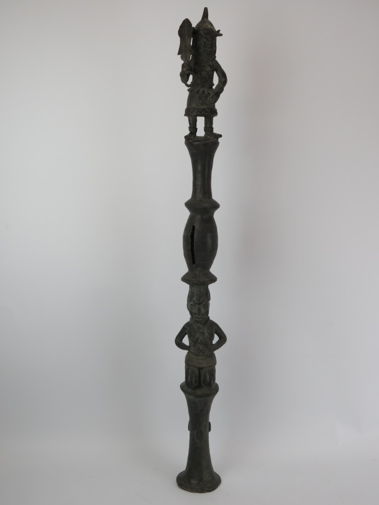 An African Benin bronze ceremonial ‘ukhurhe’ rattle staff, probably 19th century. Provenance: From the private collection of Alfred Spinnler in Switzerland. 90 cm height.