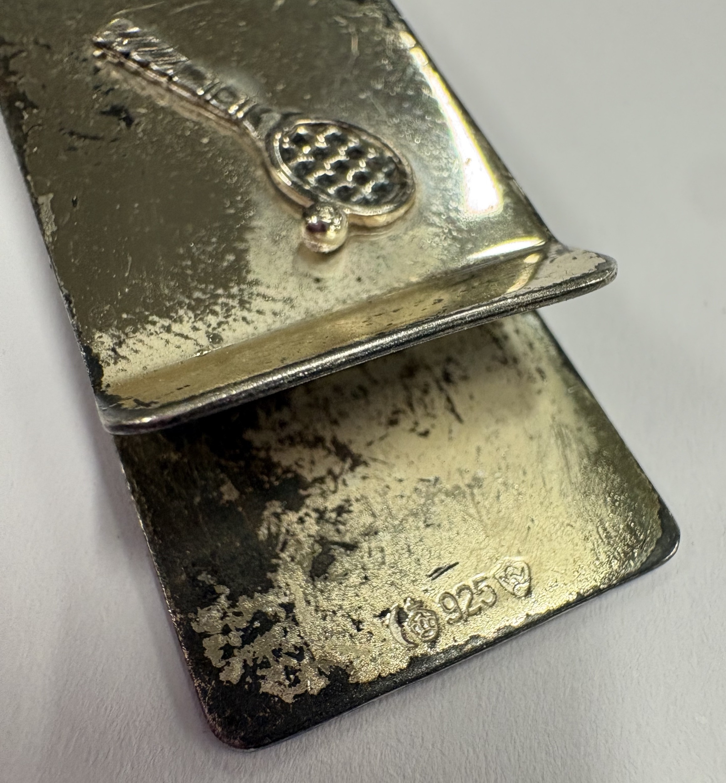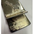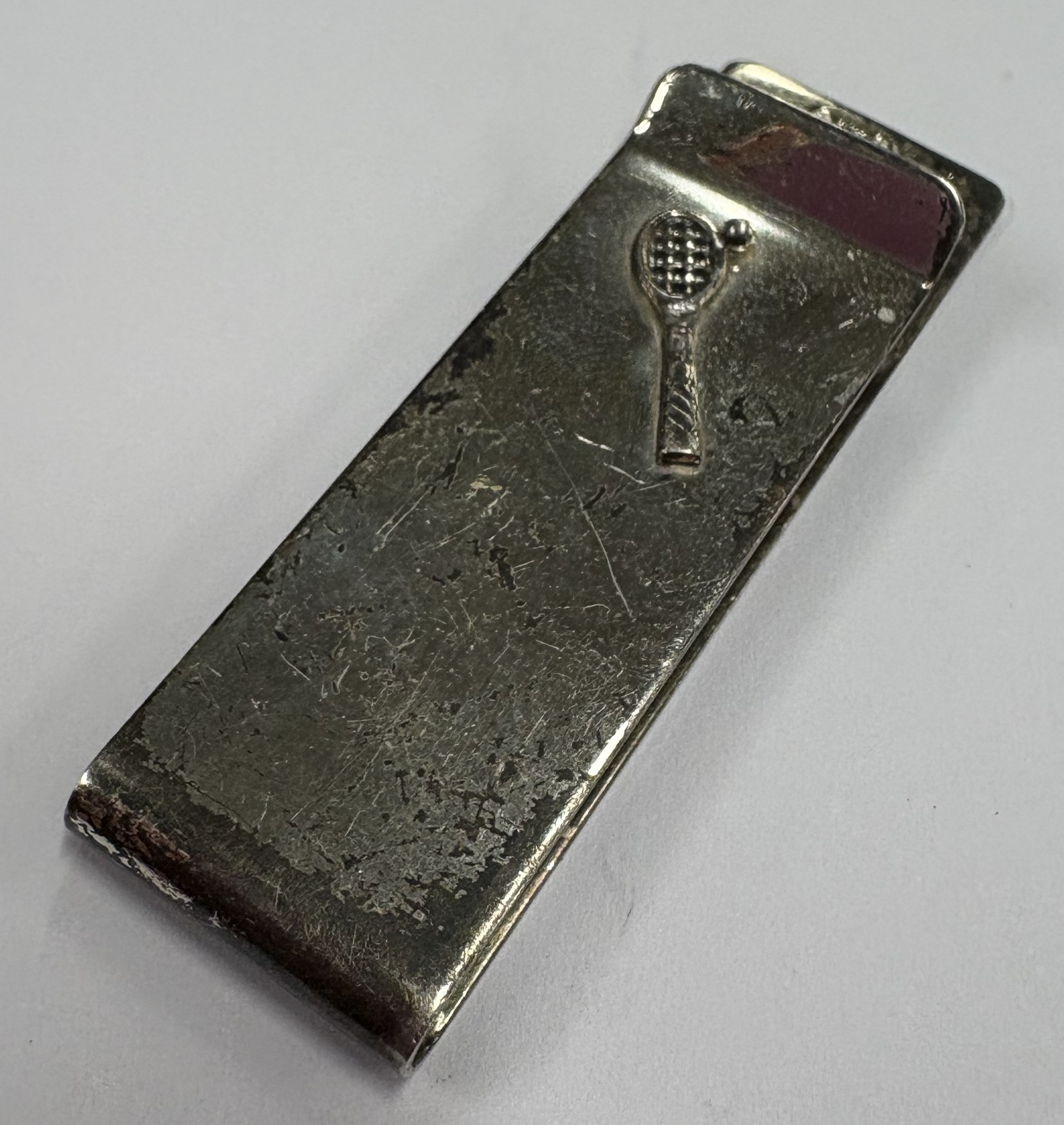 A Sterling silver money clip with applied tennis decoration, marked 925. Approx. 15 grams. Est. £50 - £80.