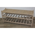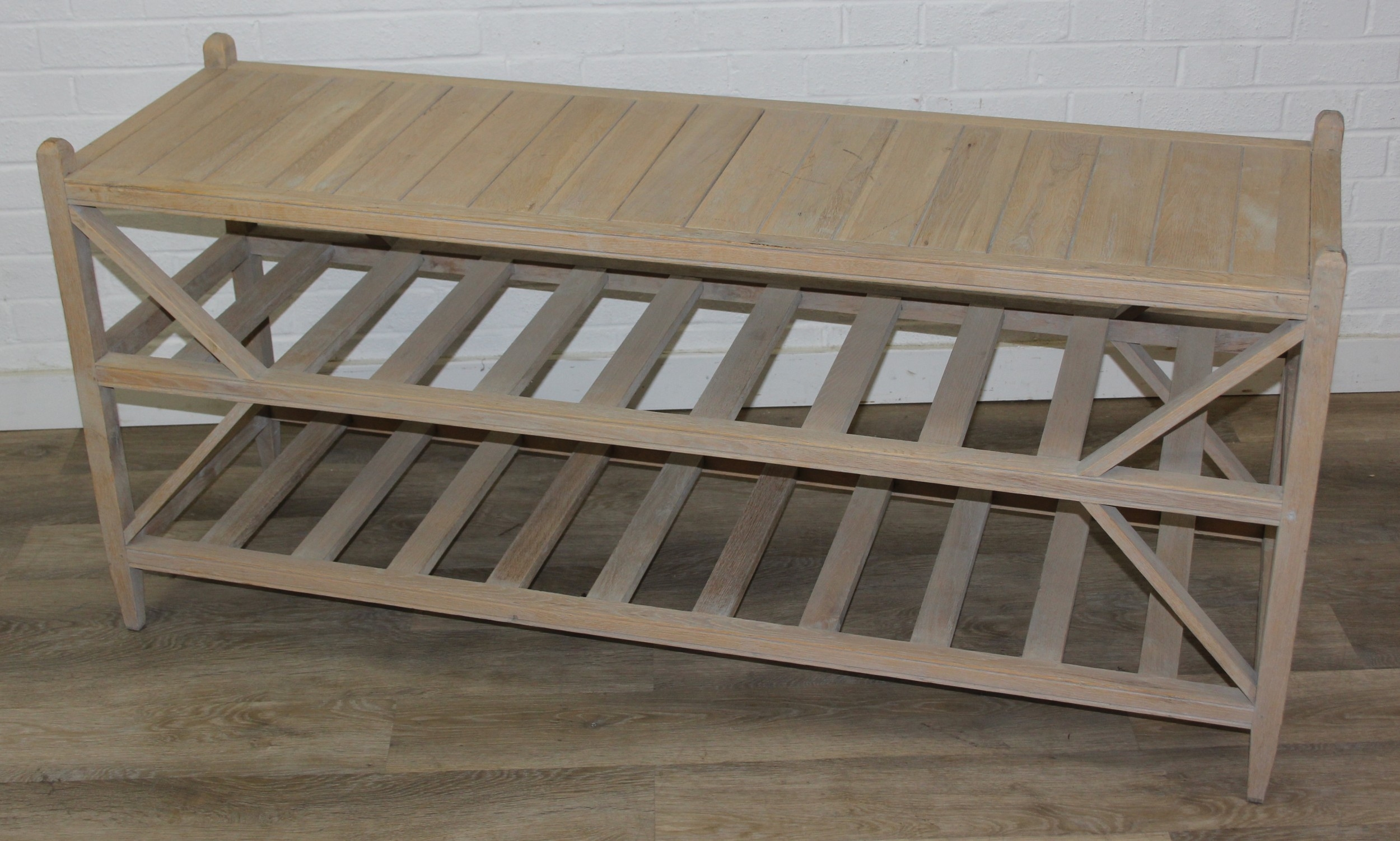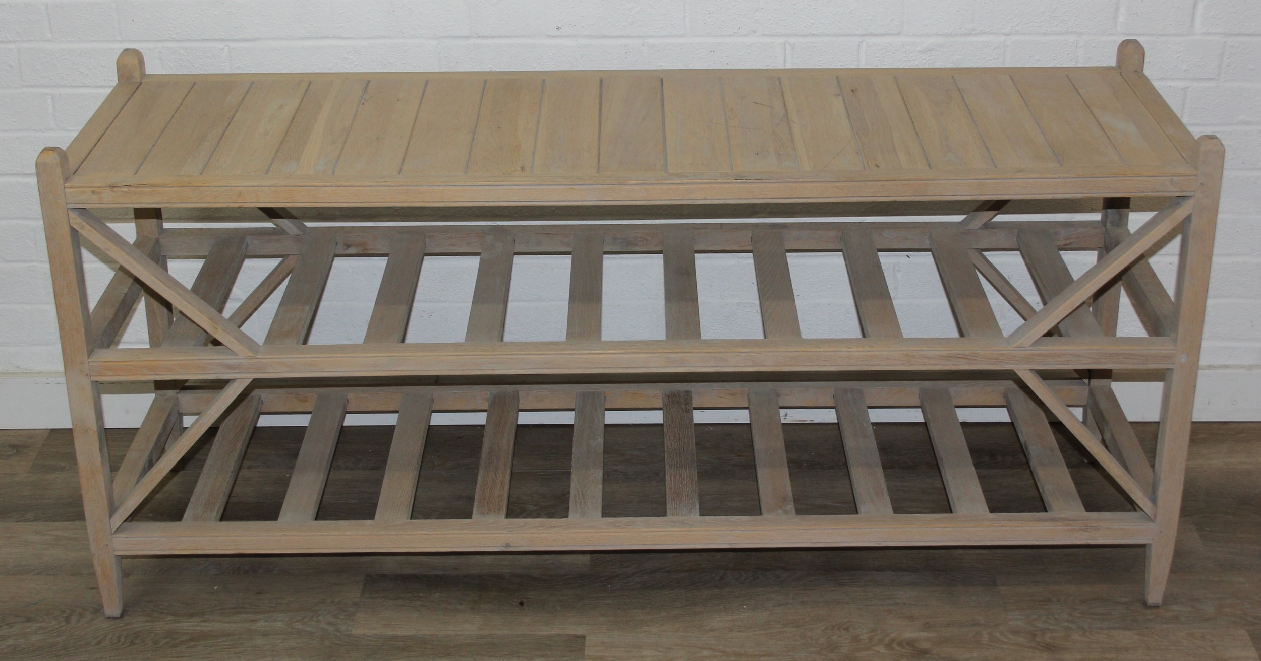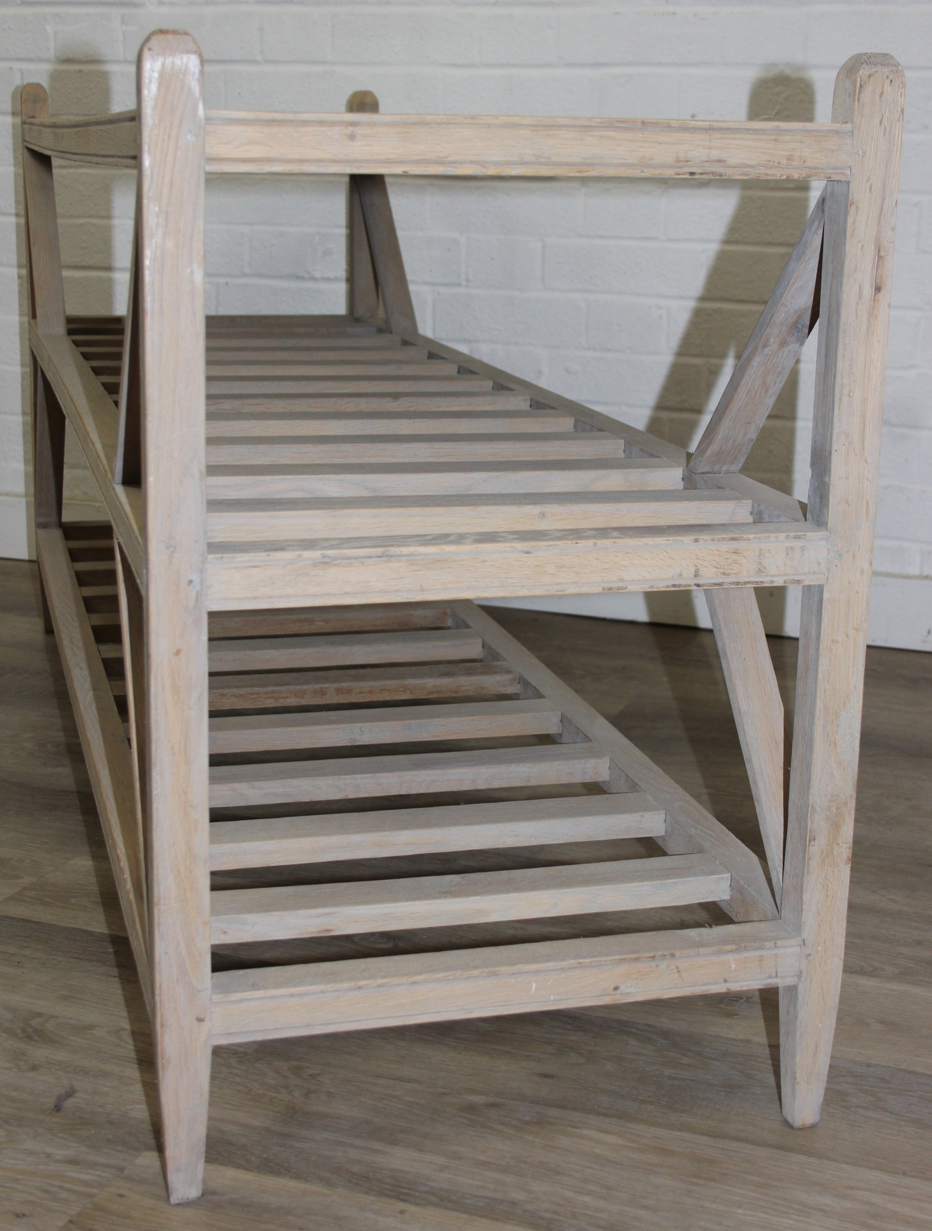 A modern limed light oak side table with three tiers, a solid top tier and two slatted tiers under, no makers mark but a hand stamped brass numbered plaque to base, 150cm x 45cm x 70cm