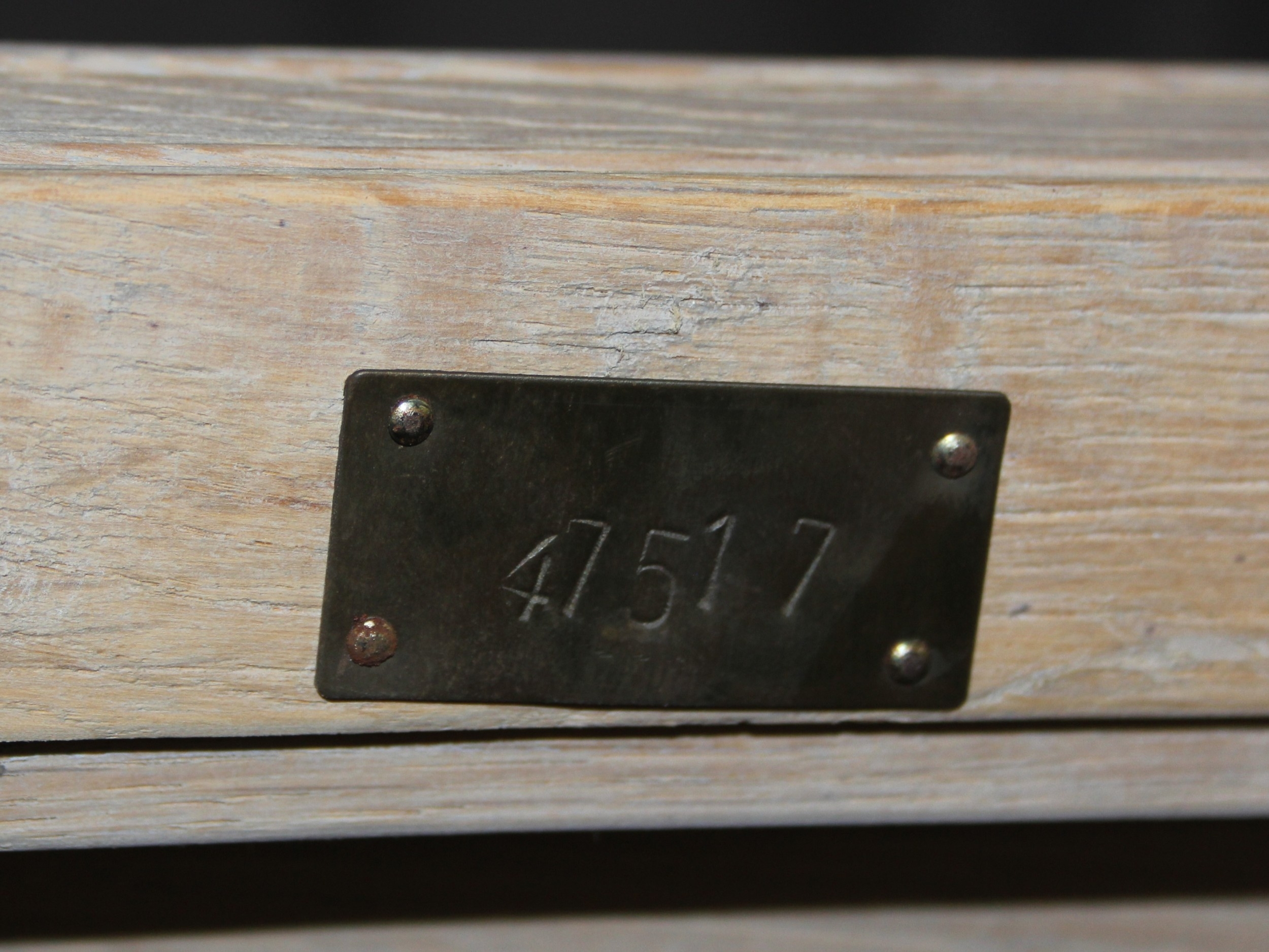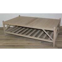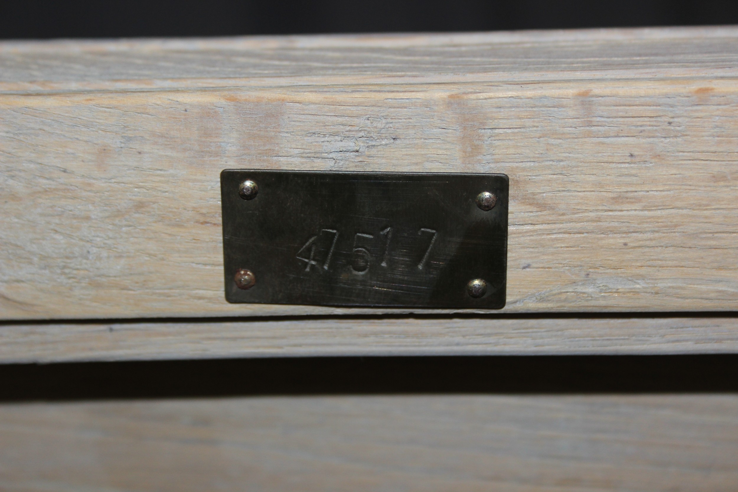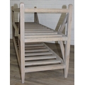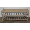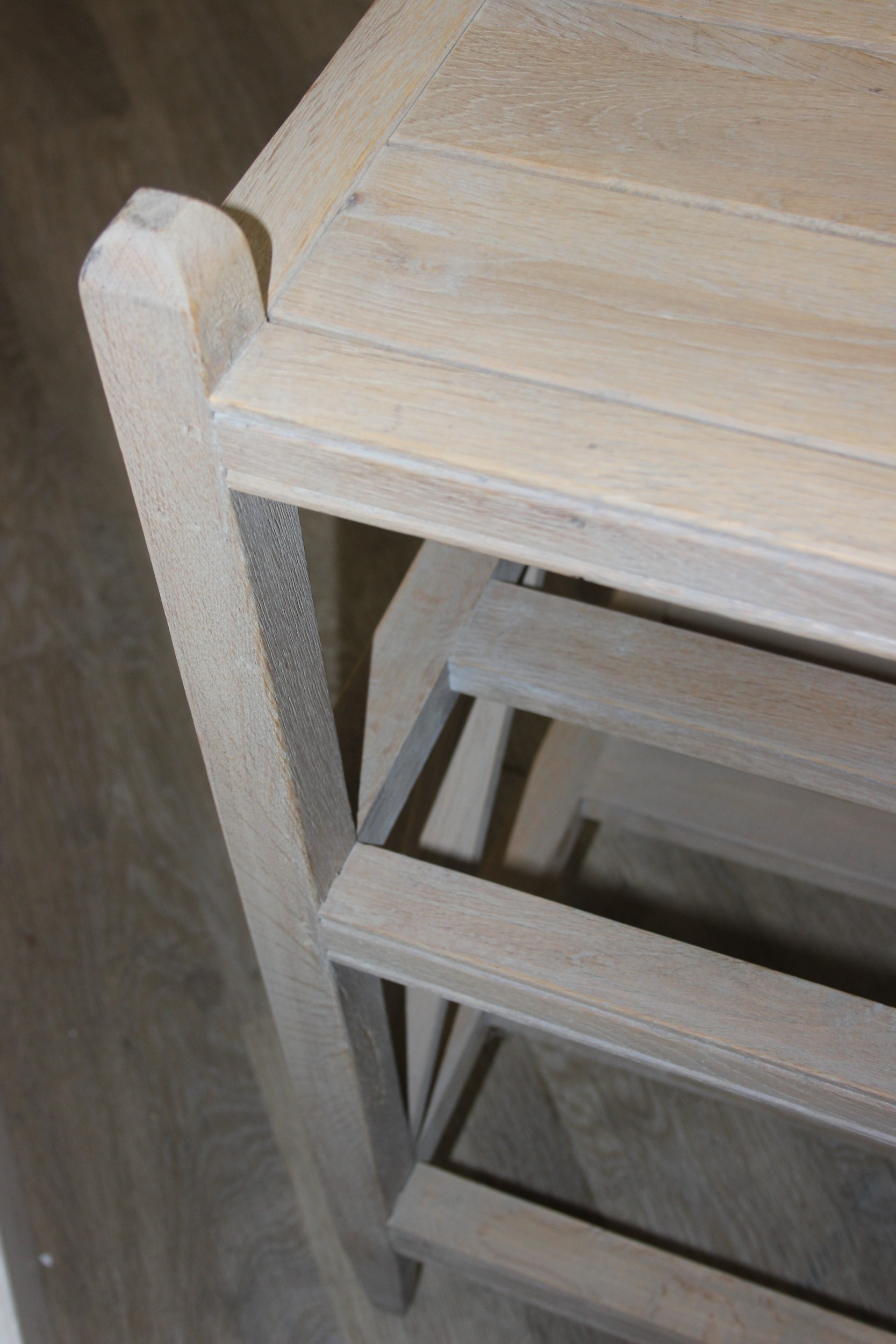 A modern limed light oak side table with three tiers, a solid top tier and two slatted tiers under, no makers mark but a hand stamped brass numbered plaque to base, 150cm x 45cm x 70cm