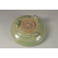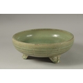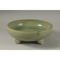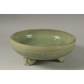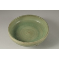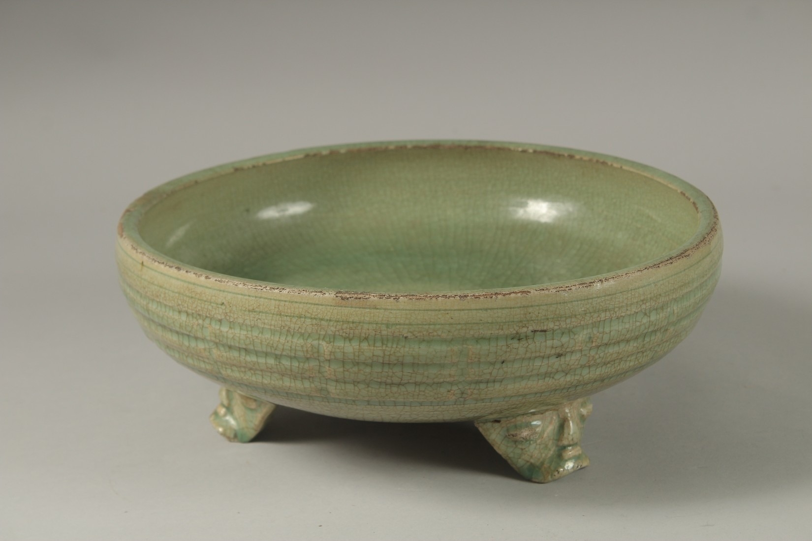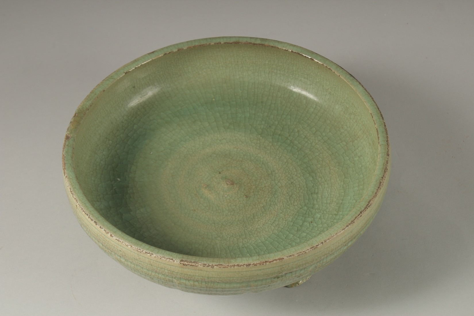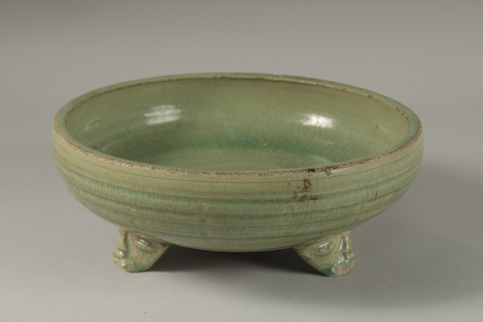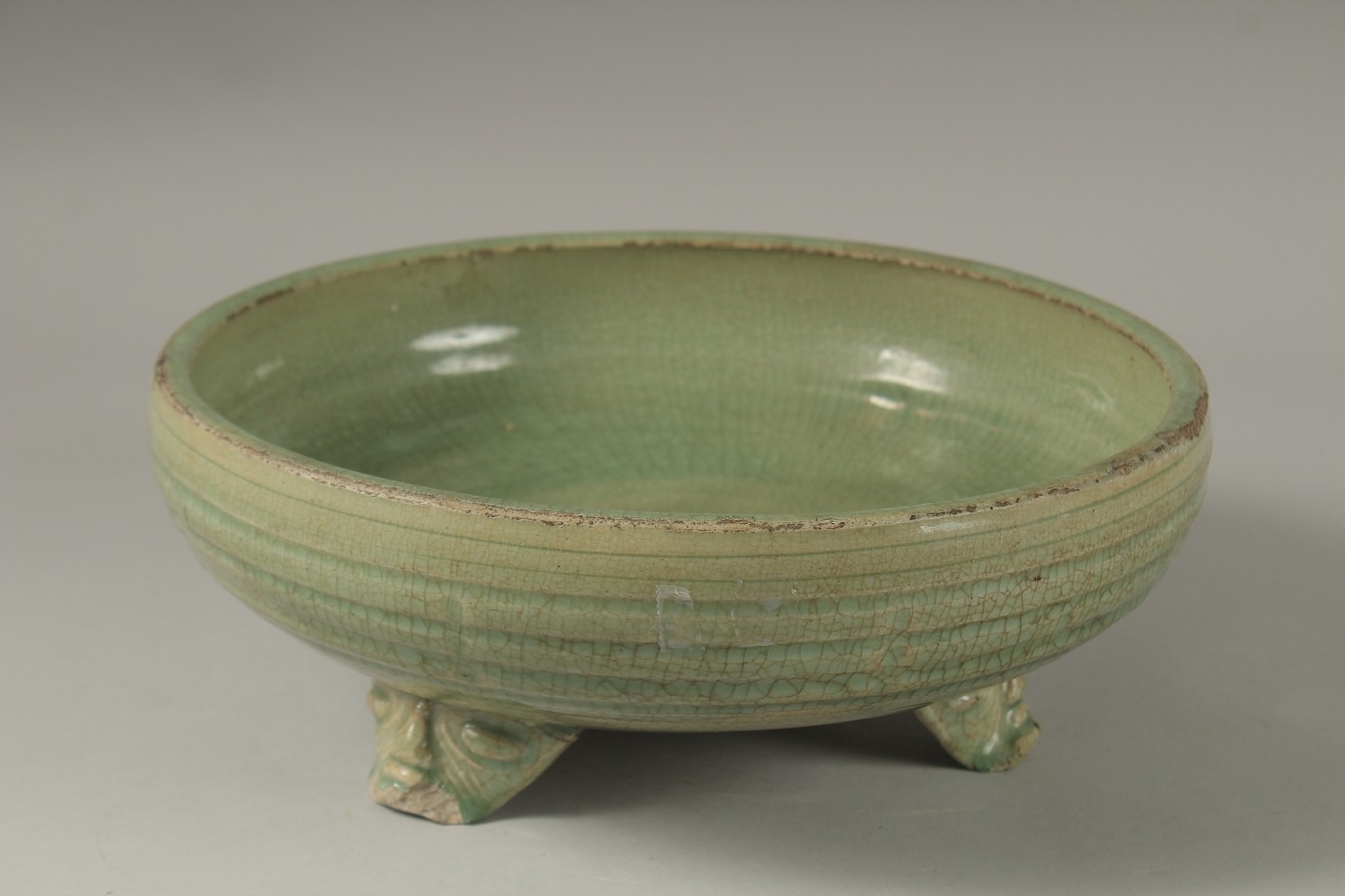 A 16TH CENTURY GREEN GLAZED DEEP CIRCULAR BOWL, raised on three lion feet. 13cm high, 30cm wide.