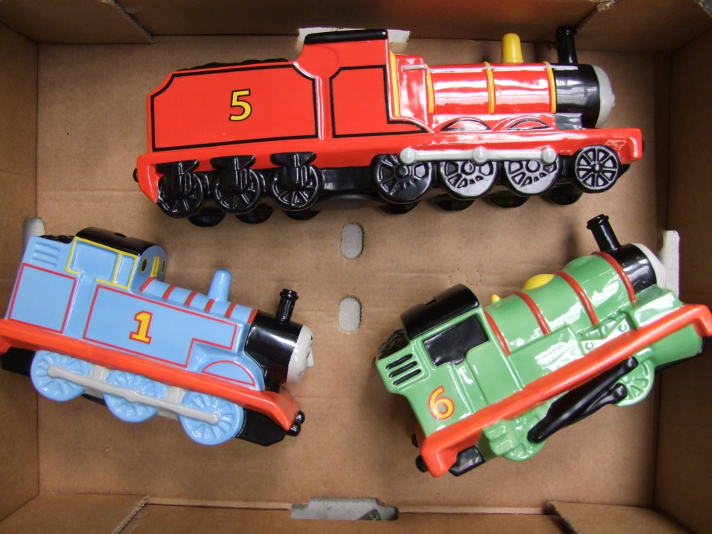 Three Coalport Thomas the Tank Engine moneyboxes, Thomas, James & Percy.