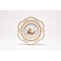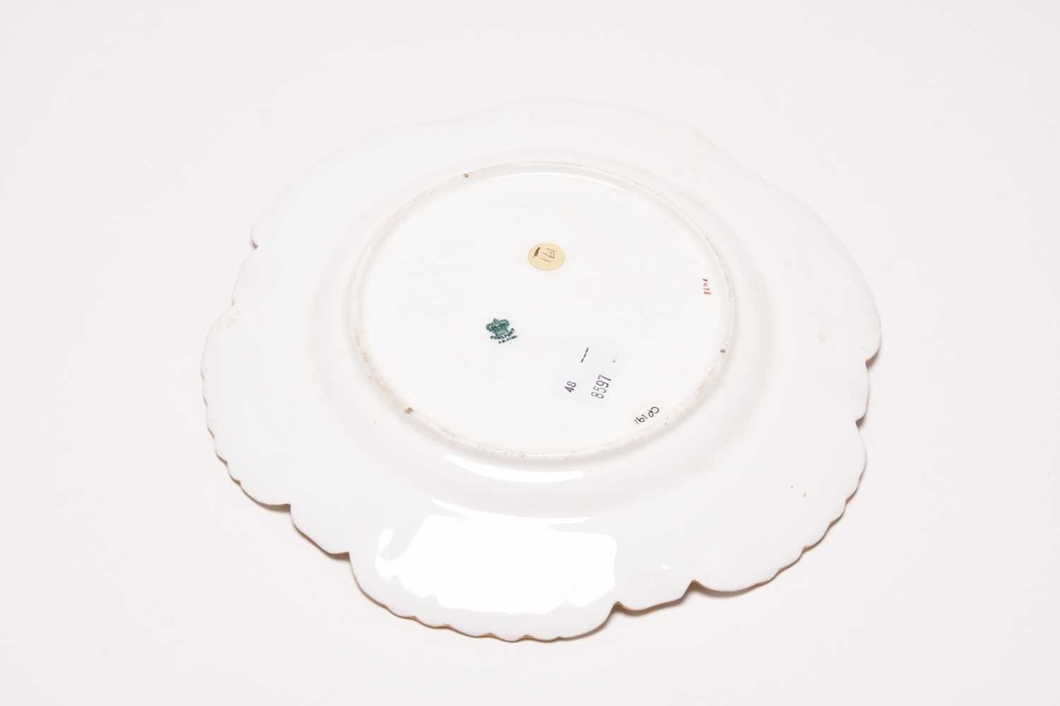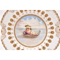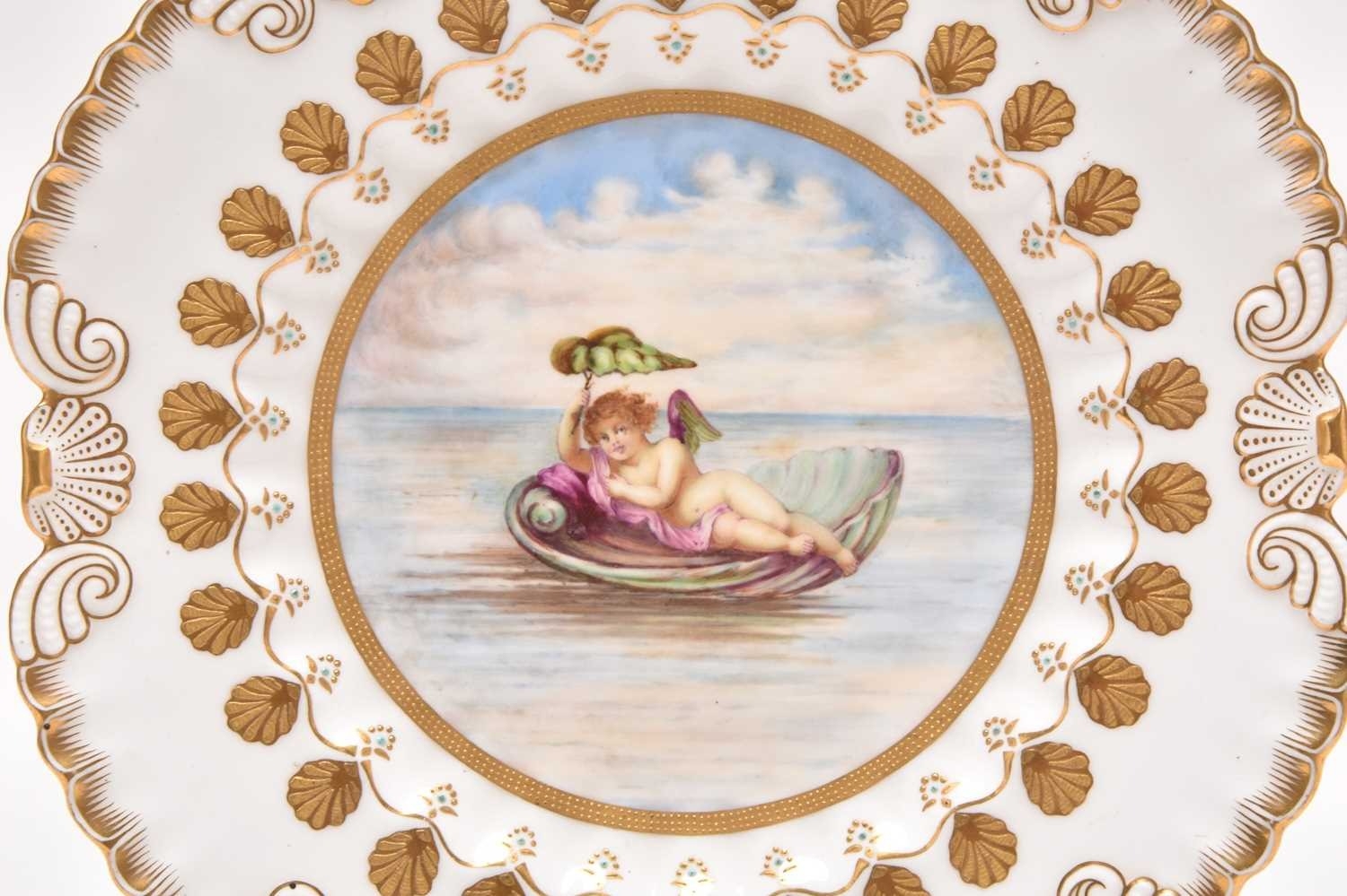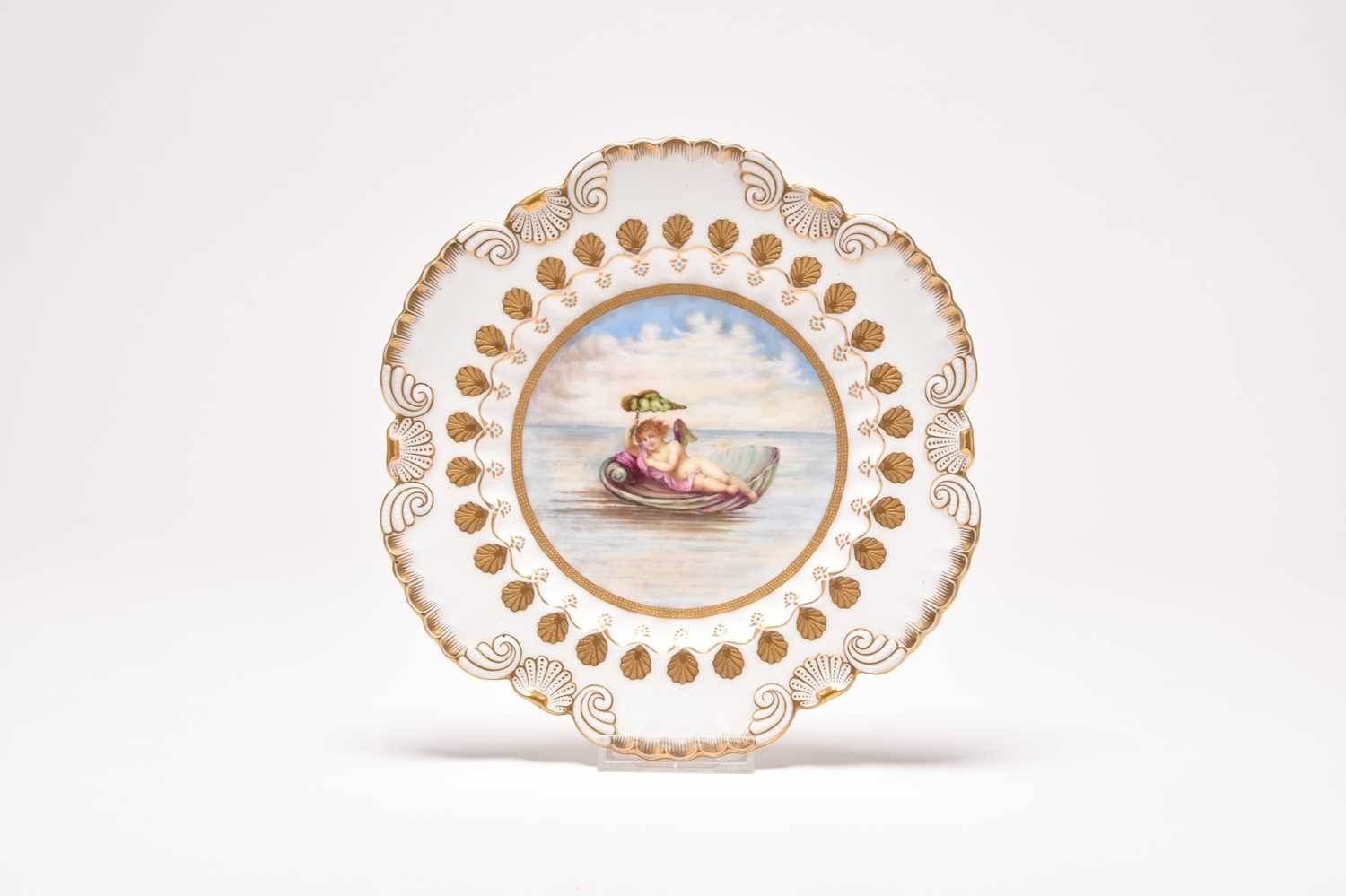 An unusual Coalport plate, circa 1885-90, of circular form with shell-detailed edges in gilt, the centre painted with a winged putto reclining in a seashell serving as a boat or resting place on the sea, holding a large leaf over its head, printed Coalport England Crown mark to reverse, numbered X475 in iron red, 24cm diameter Provenance: The C.R. Pilkington Collection, exhibited at the Coalport China Works Museum. Condition:Good condition with no damages or repairs.