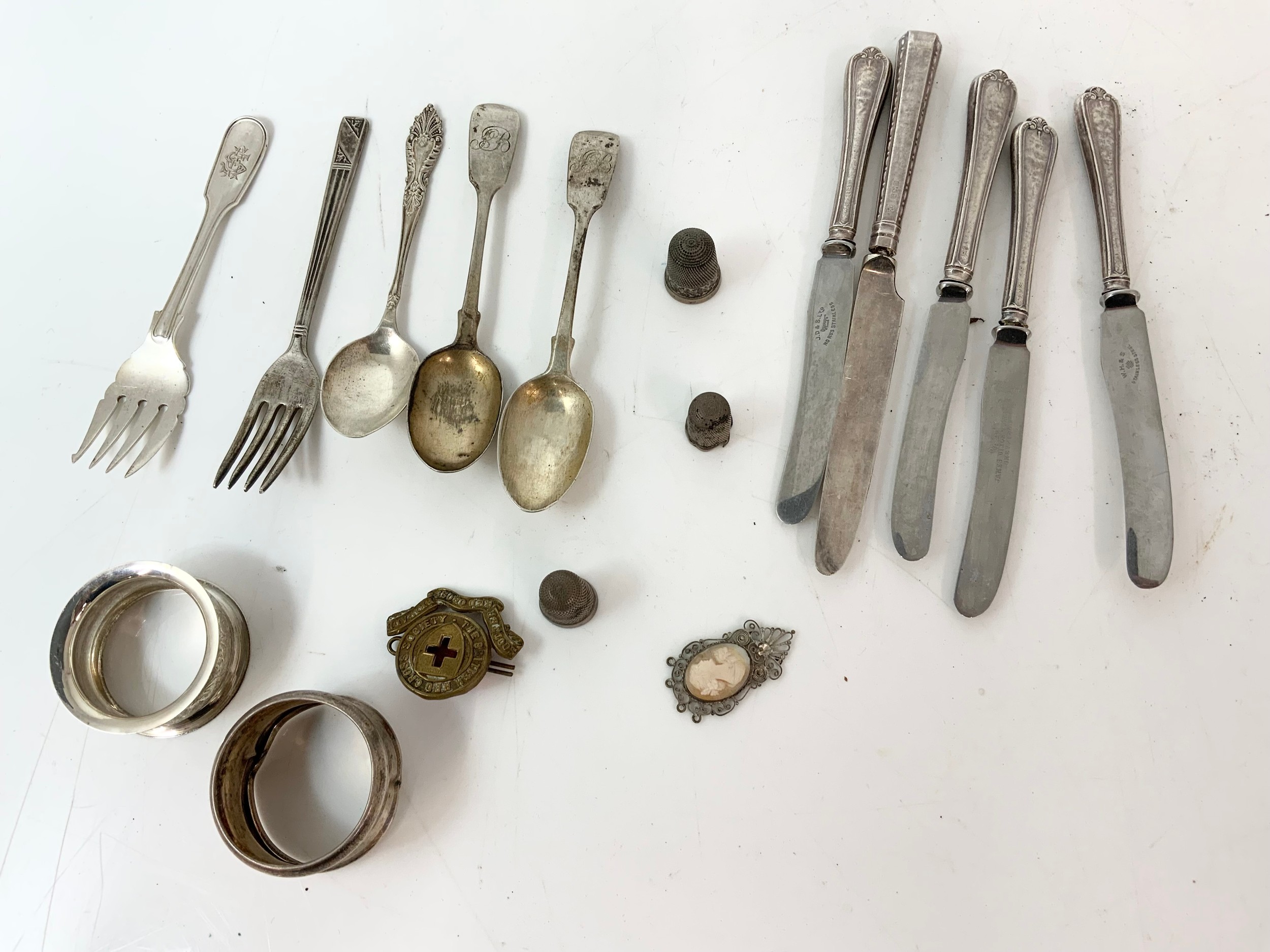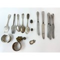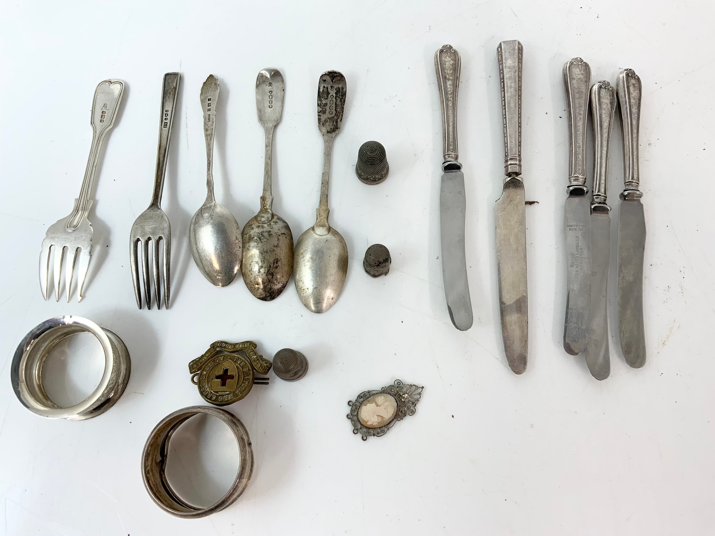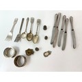 HALLMARKED SILVER SPOONS, FORK, SERVETTE RINGS , SILVER HANDLED KNIVES ETC