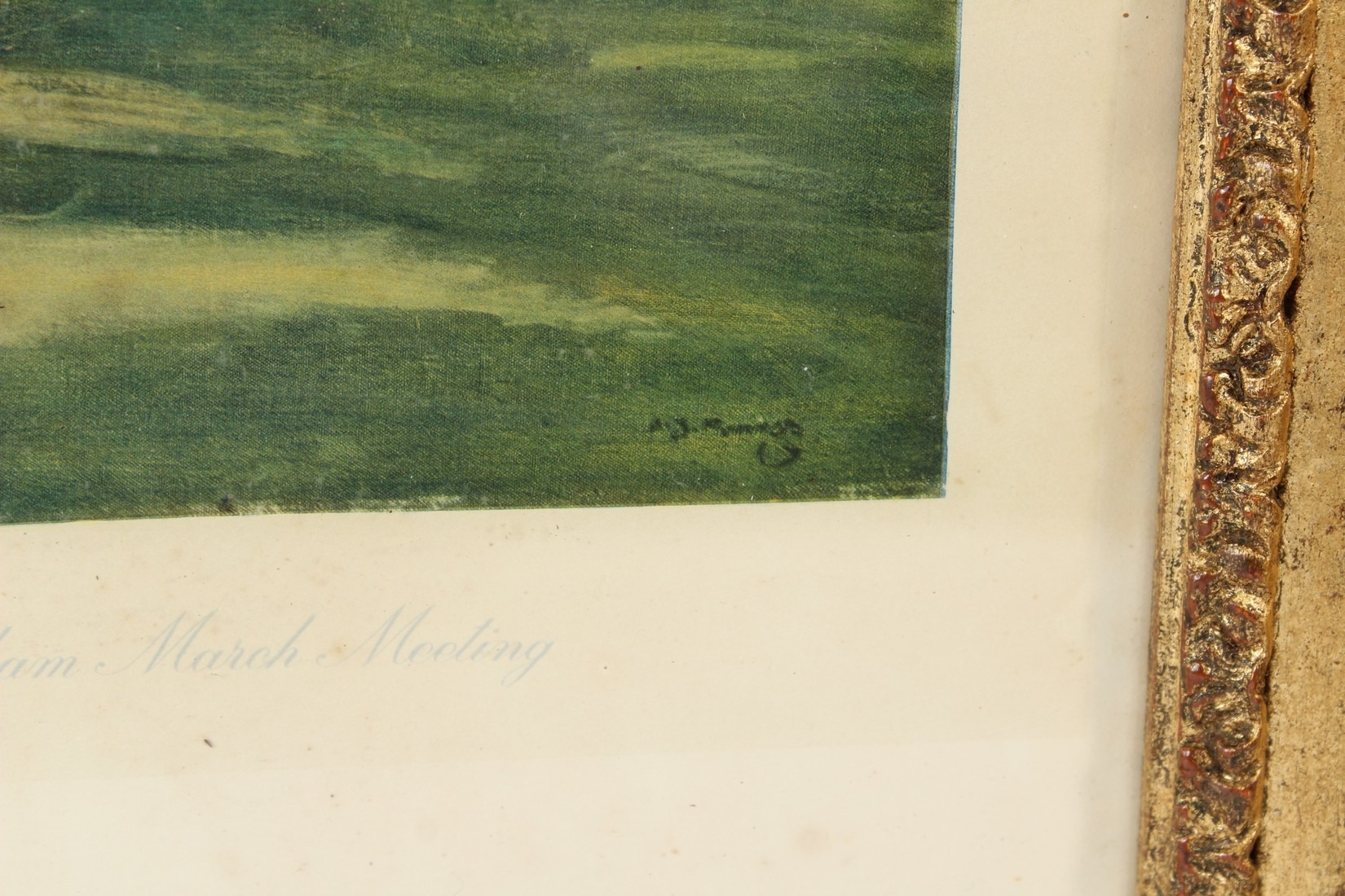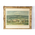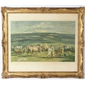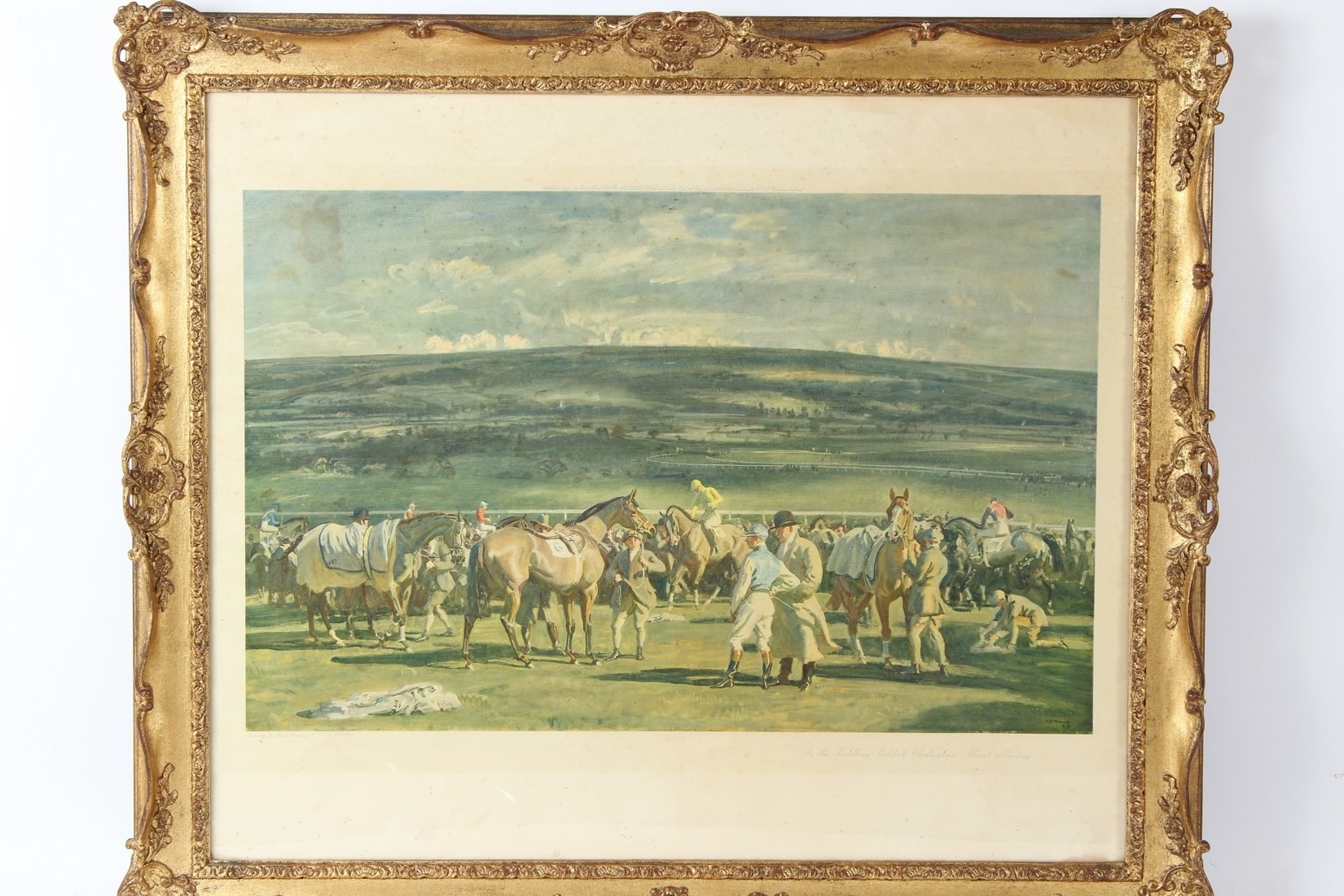 AFTER ALFRED MUNNINGS 'In The Saddling Paddock, Cheltenham - March Meeting' colour print (a/f) in a gilt swept frame 40 x 63cm (image)