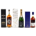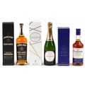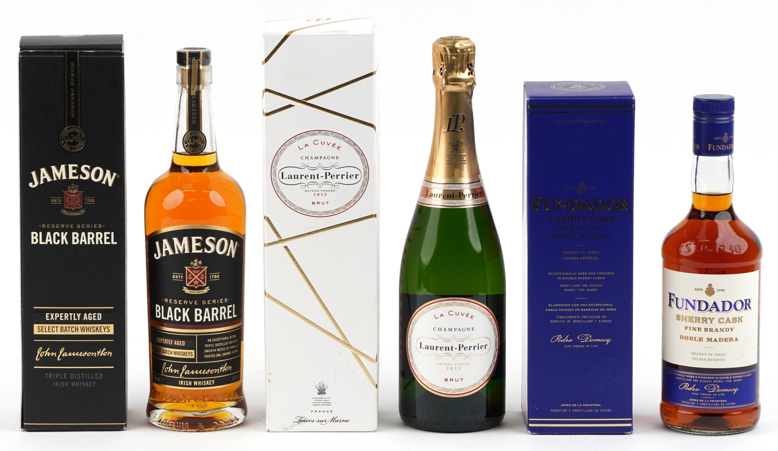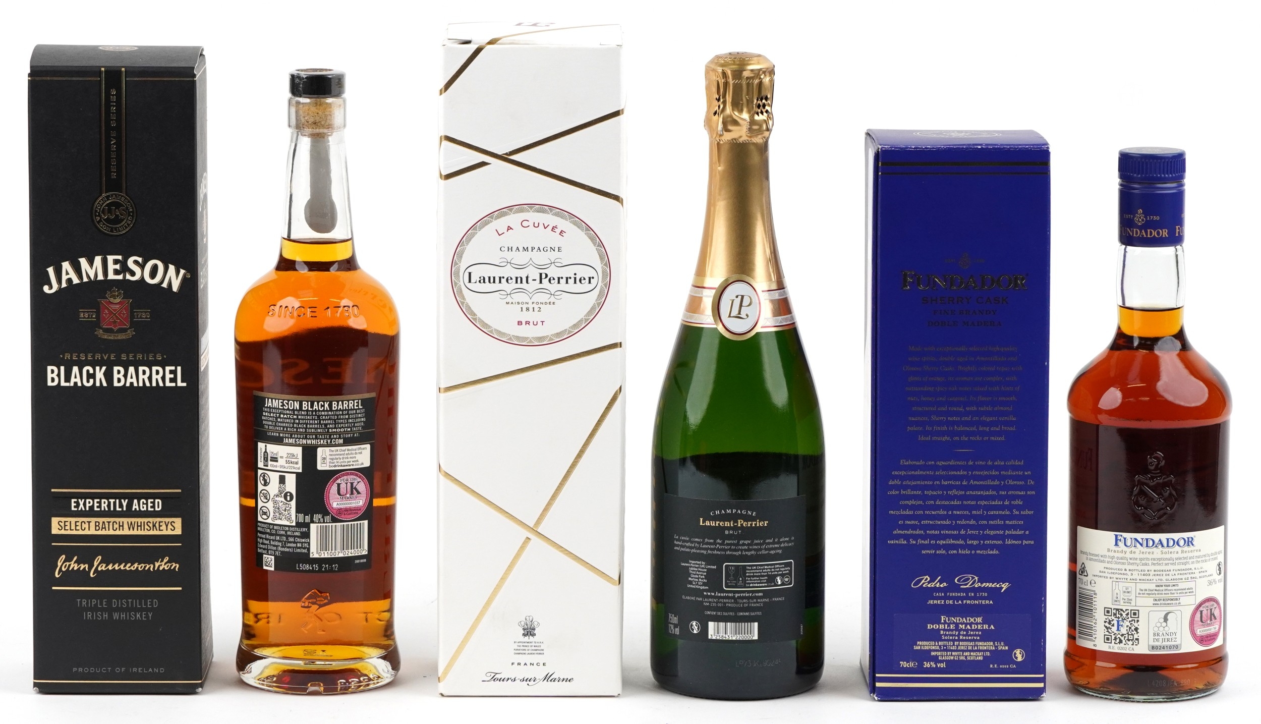 Three bottles of alcohol comprising Jamieson Black Barrel Irish whisky, Fundador Sherry Cask fine brandy and Laurent-Perrier Champagne.