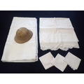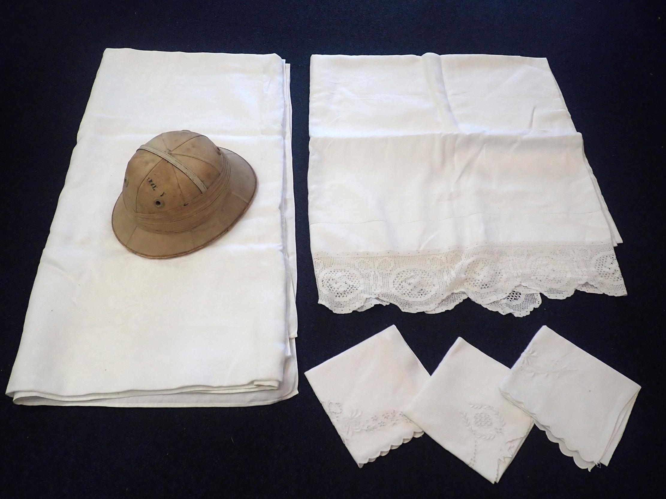 AN OLD DAMASK TABLECLOTHanother with lace edge, napkins, and a solar topee /pith helmet by Herbert Johnson