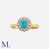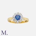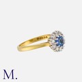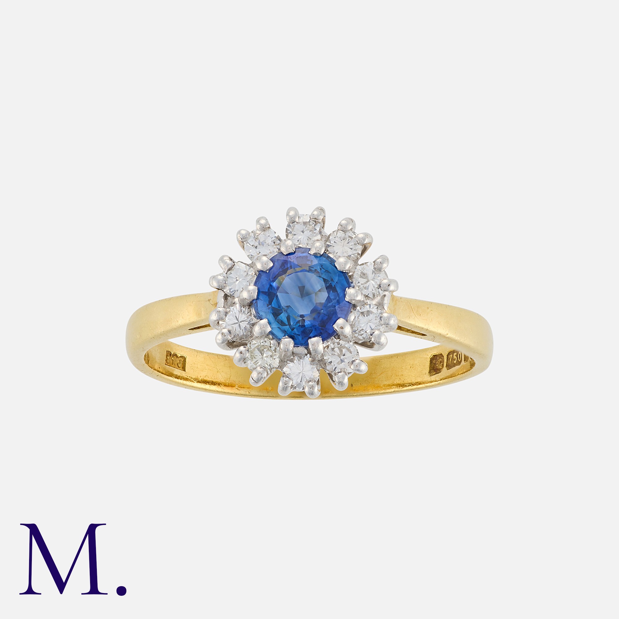 A Sapphire and Diamond Cluster Ring in 18 carat gold, set with a principal round cut sapphire within a border of round cut diamonds. Hallmarked for 18 carat gold.