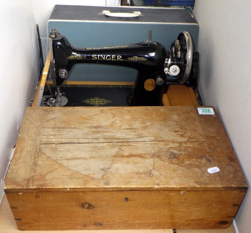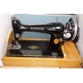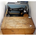 A cased Singer sewing machine together with a wooden box containing accessories