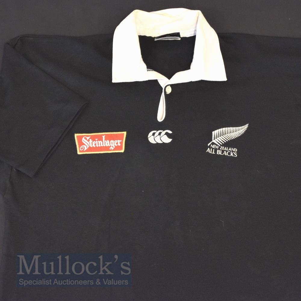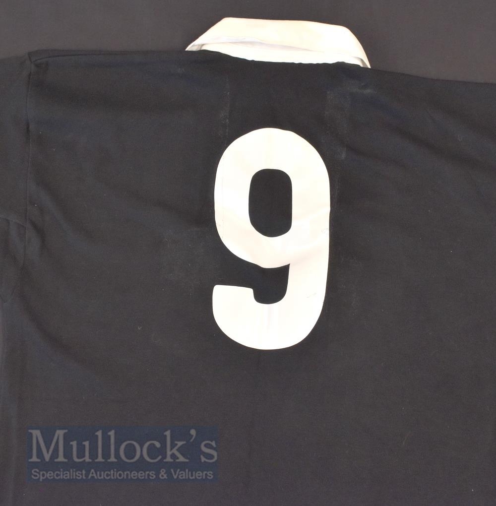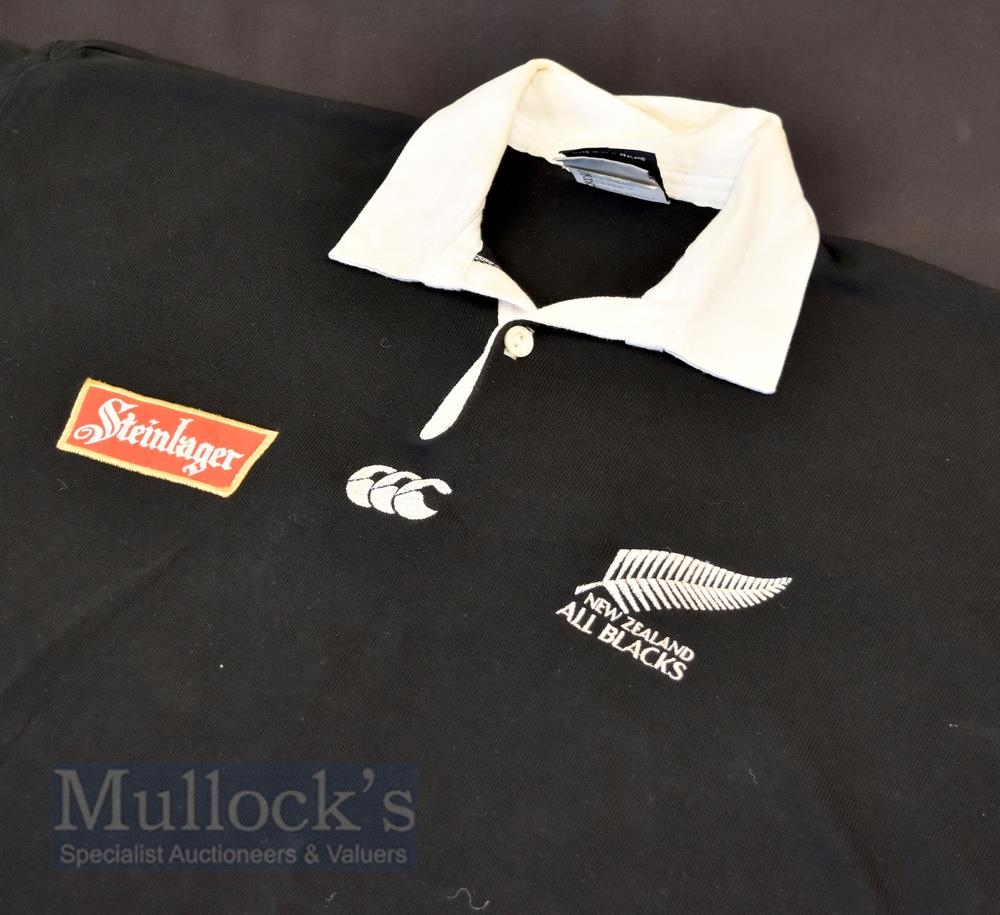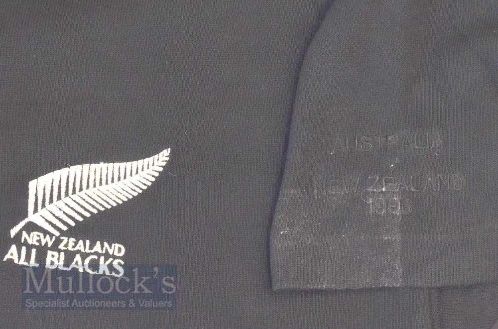 Rare Justin Marshall Matchworn All Black Rugby Jersey: As with its 1998 partner which was so sought-after in our last sale, this comes complete with corroborating embroidered details of the game, All Black, Canterbury and Steinlager logos and white plastic No. 9 to rear, with very minor staining/marks. Scrum-half Justin Marshalls jersey from the match between Australia & NZ in 1996, won 32-25 by NZ inc a try by Marshall! In excellent condition, it was one of the two provided to his Swansea sponsors at the Ospreys during his South Wales stay in 2006. Very desirable memorabilia with great provenance.