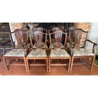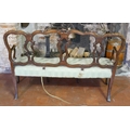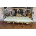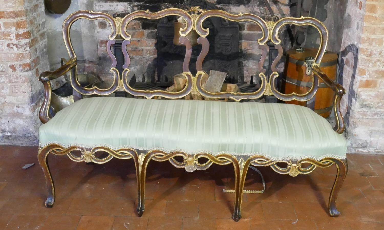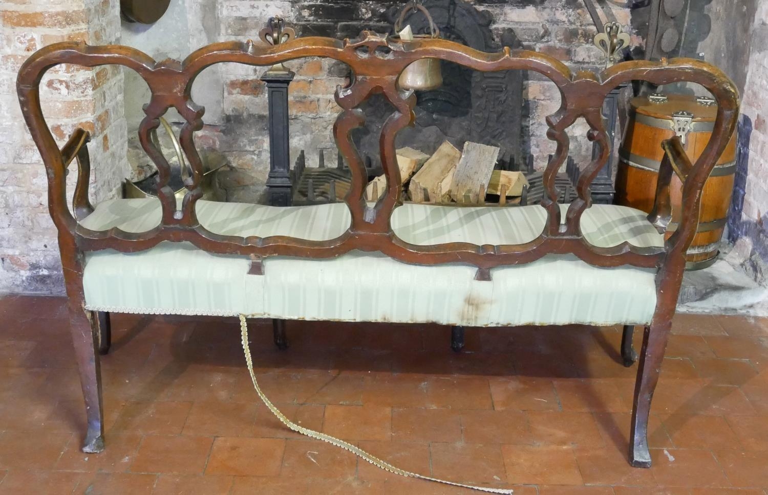 With pierced strap work back and aprons on serpentine rail, pale green fabric upholstery, on cabriole legs with scroll feet.