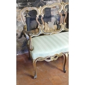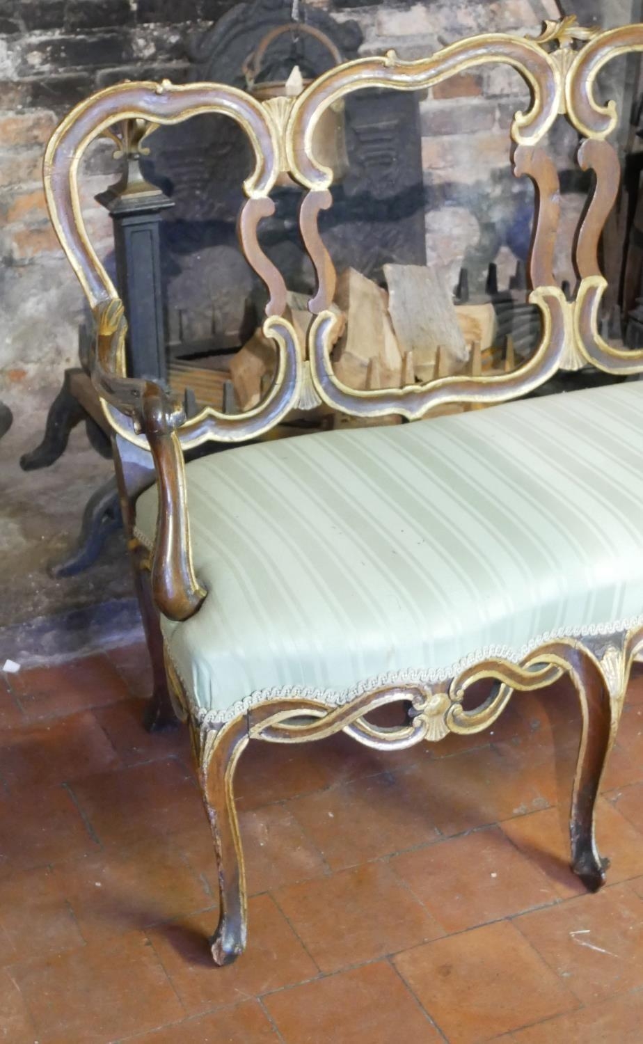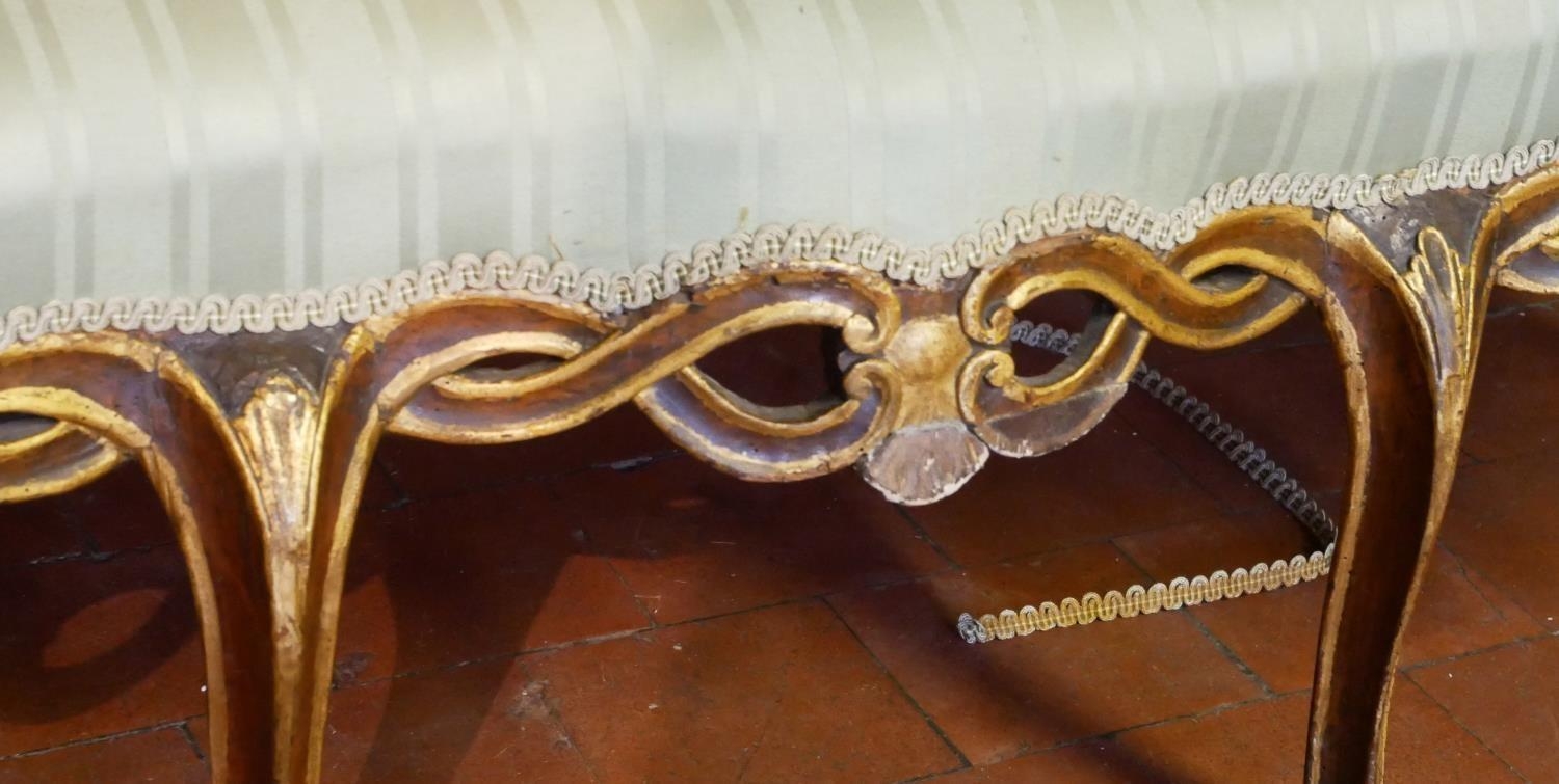 AN 18TH CENTURY ITALIAN WALNUT AND PARCEL GILT OPEN ARM CHAIR SETTEE