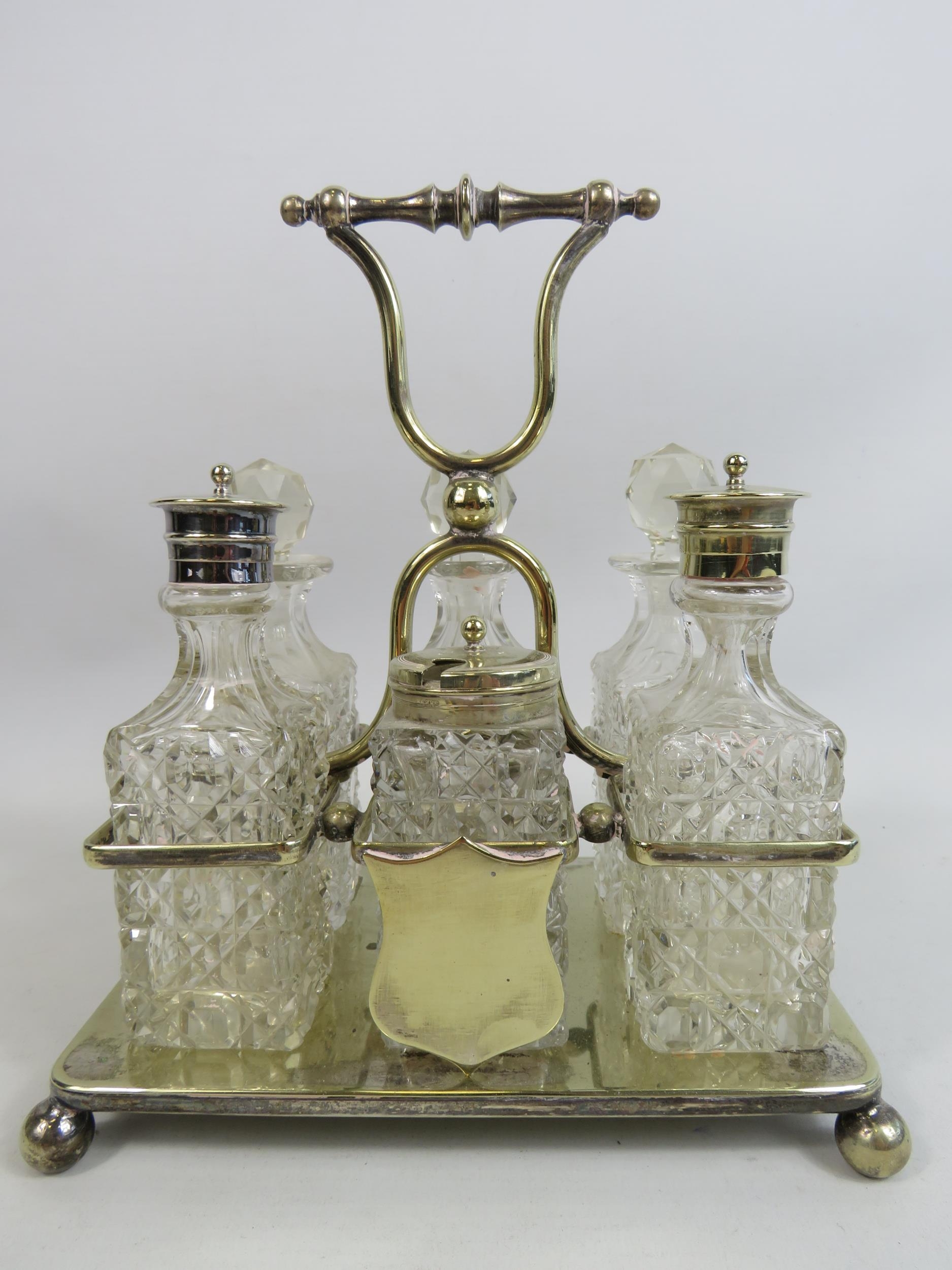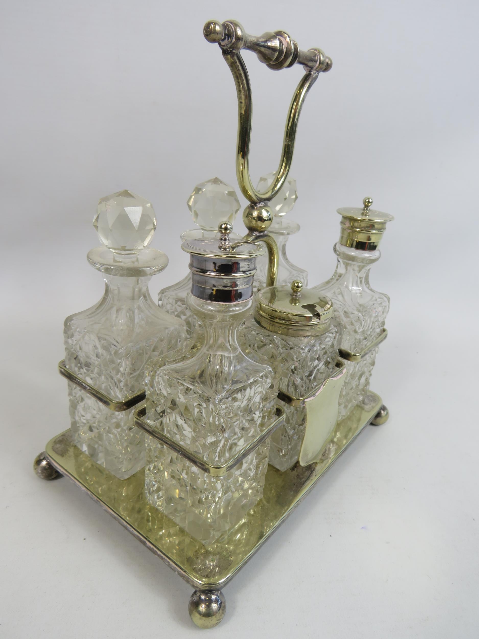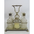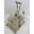 6 piece glass cruet condiment set in silver plated stand.