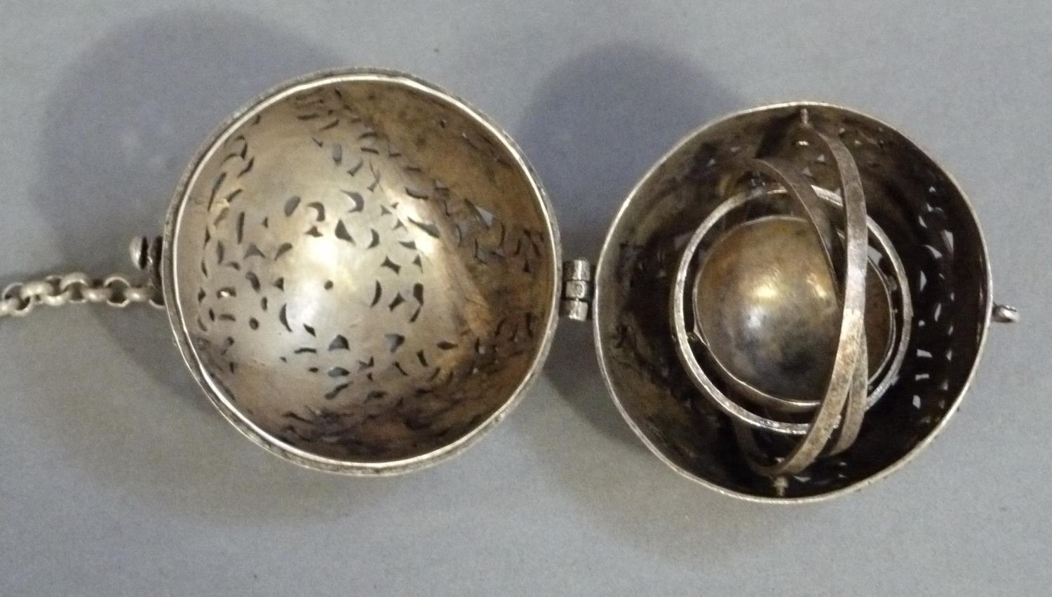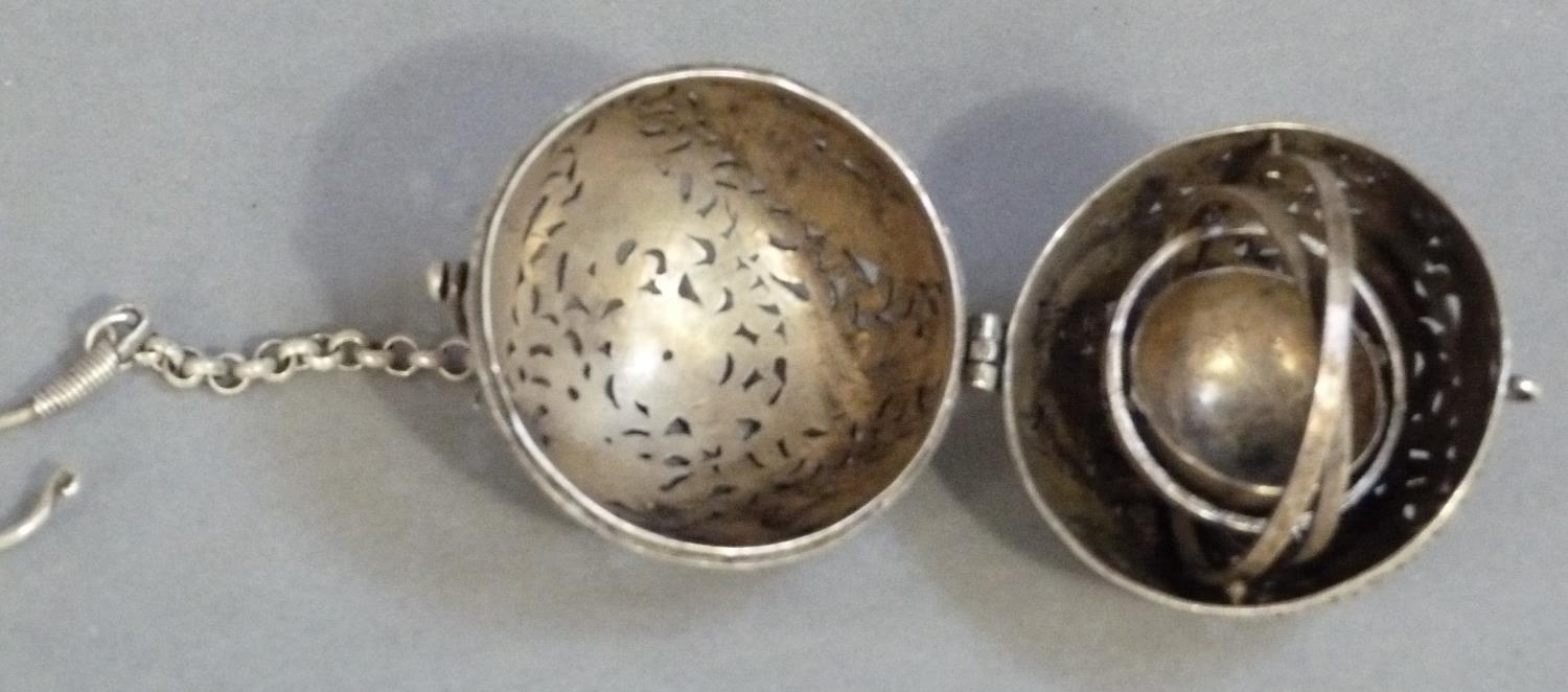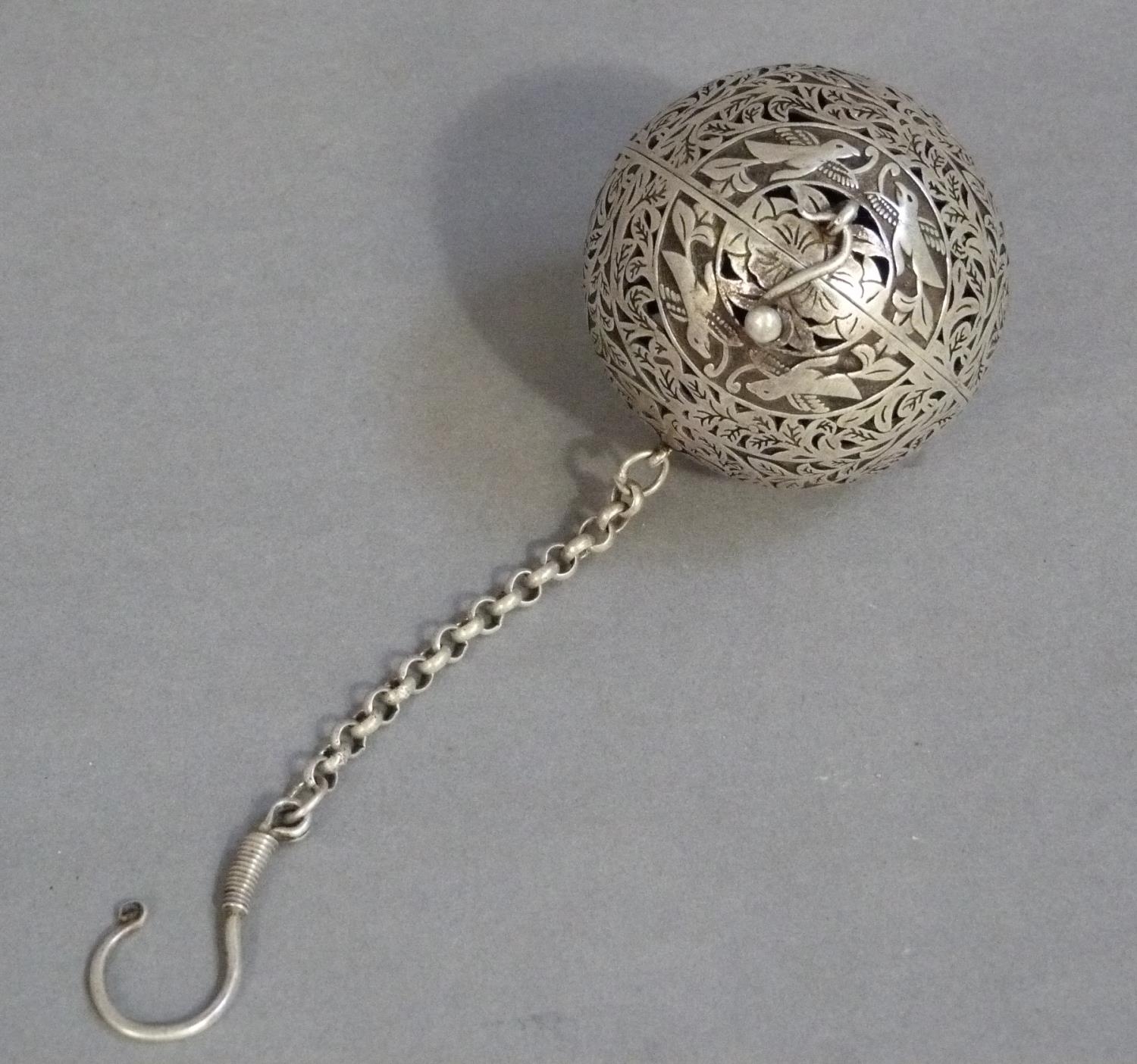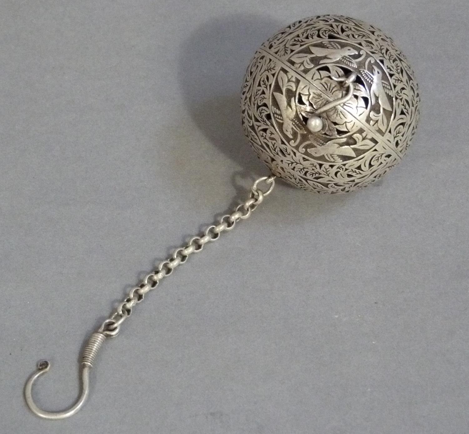 A white metal gimbal incense burner carved with birds and leafage
