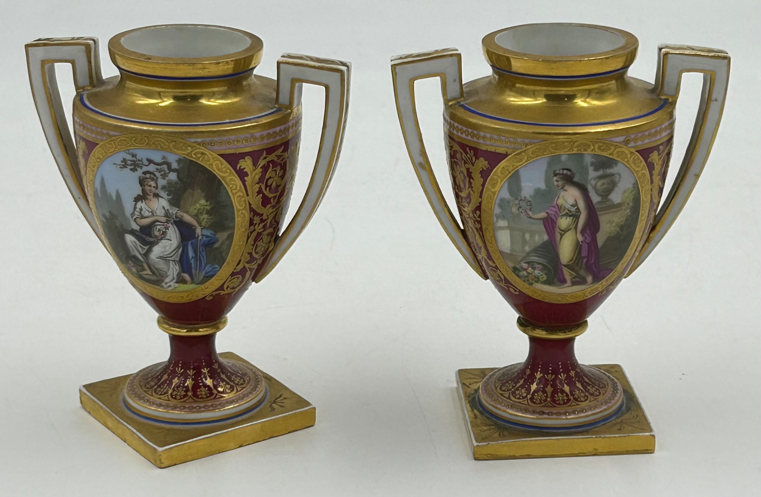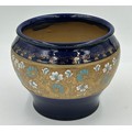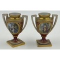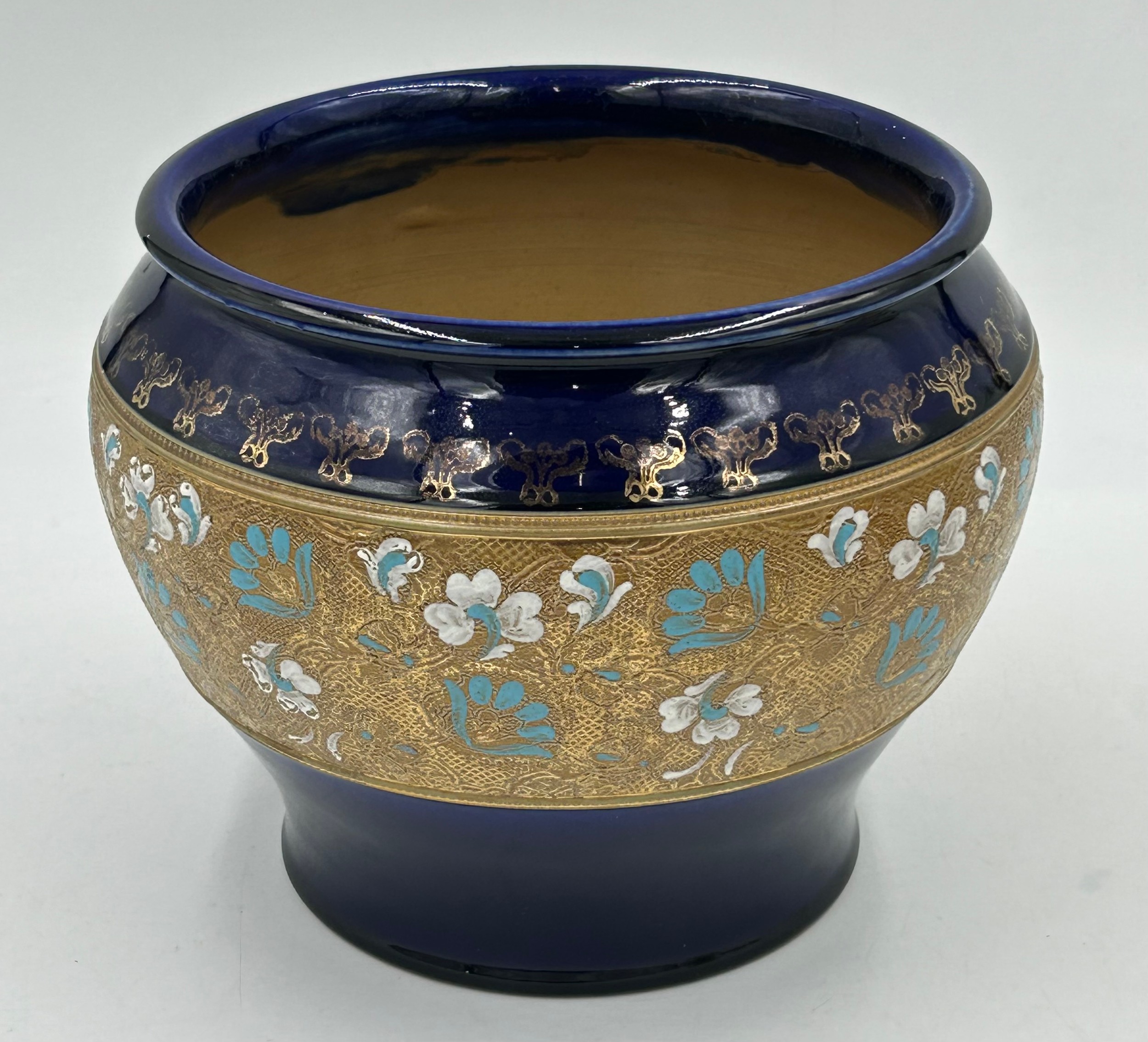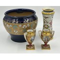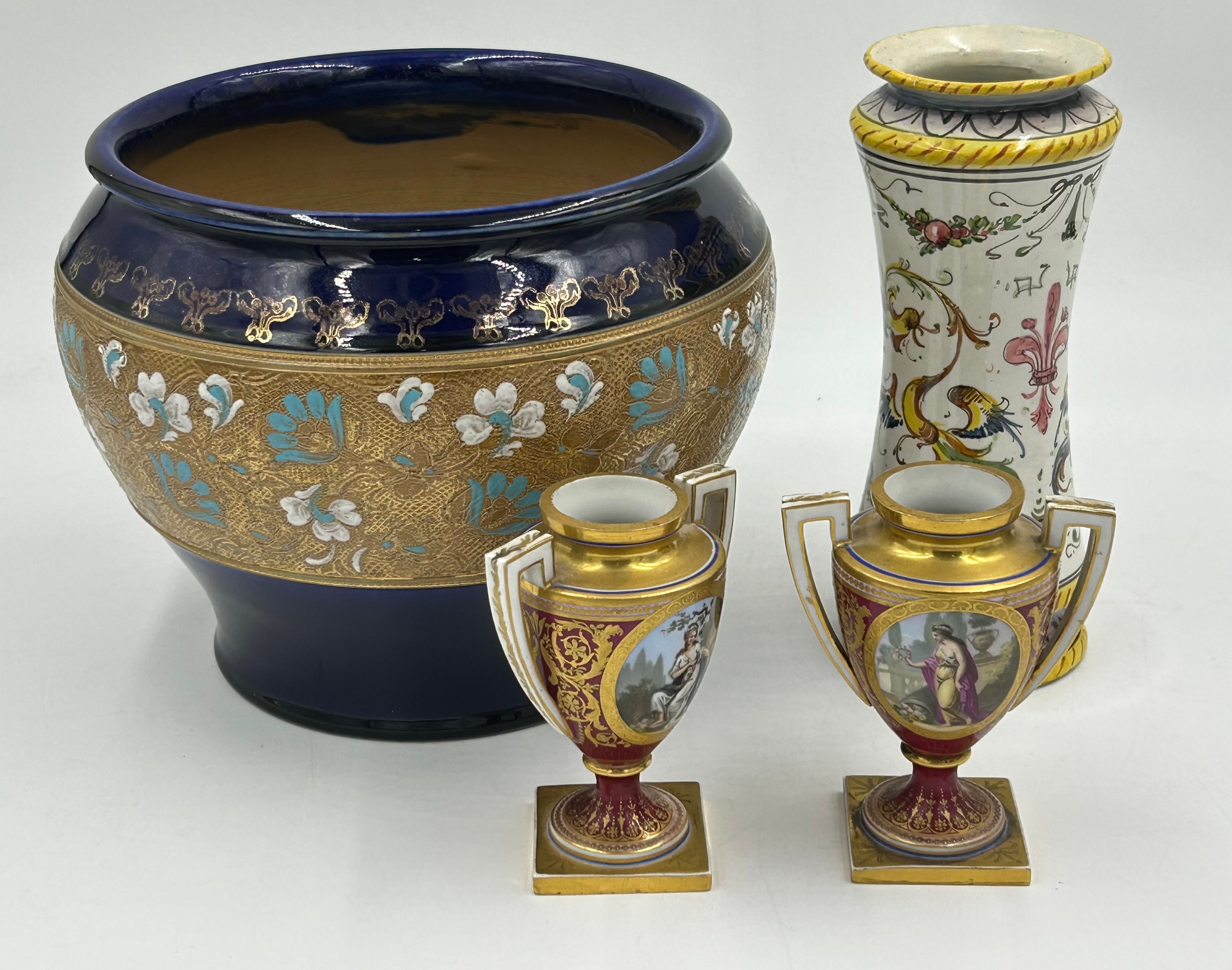 A Doulton Lambeth stoneware chine jardiniere, decorated with flowers, impressed marks to base, 21cm d x 19cm h together with a pair of Royal Vienna twin handled vases with panels depicting classical figures and gilt embellishment and beehive marks to the base, 11cm h and a continental vase 21cm h.