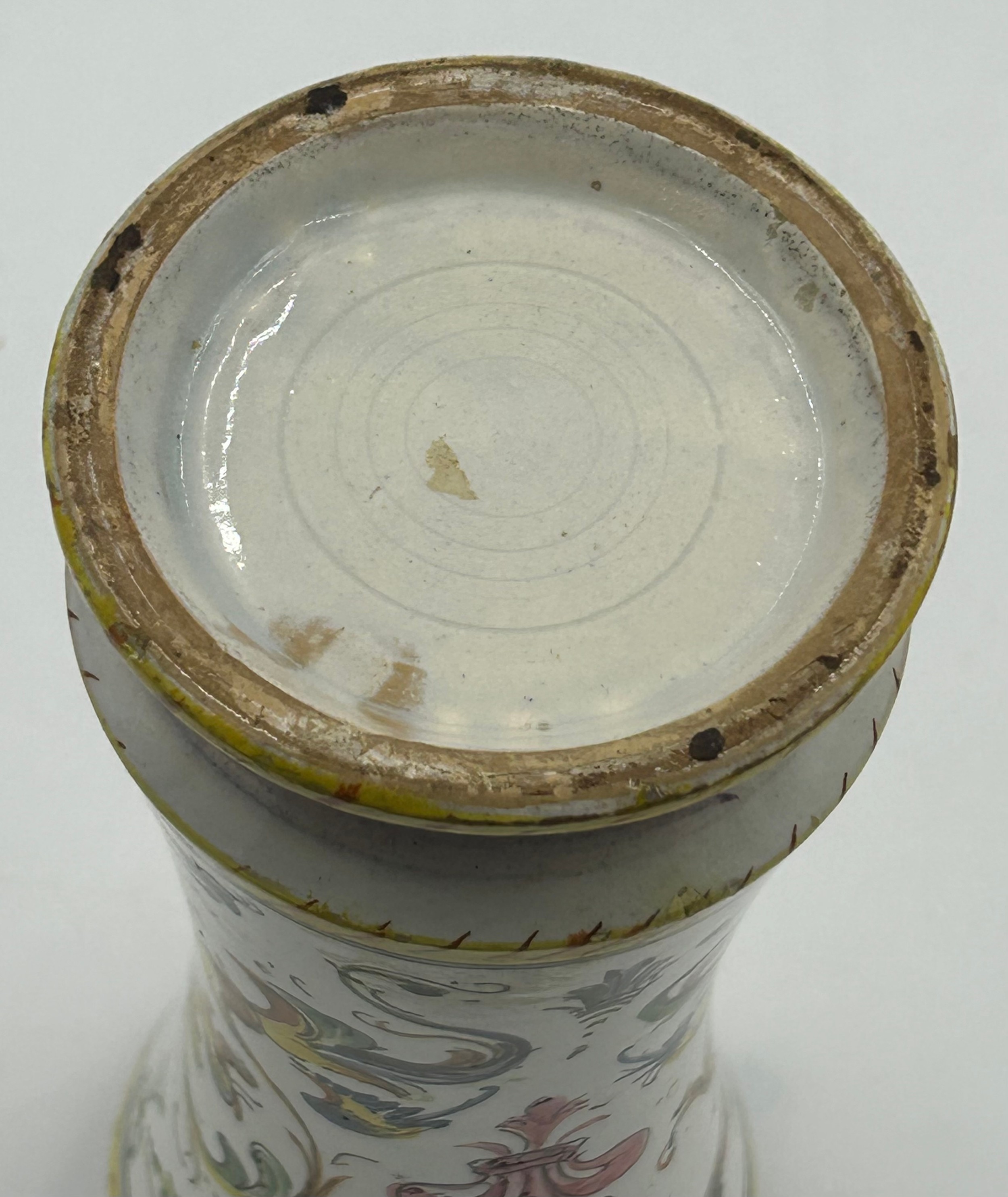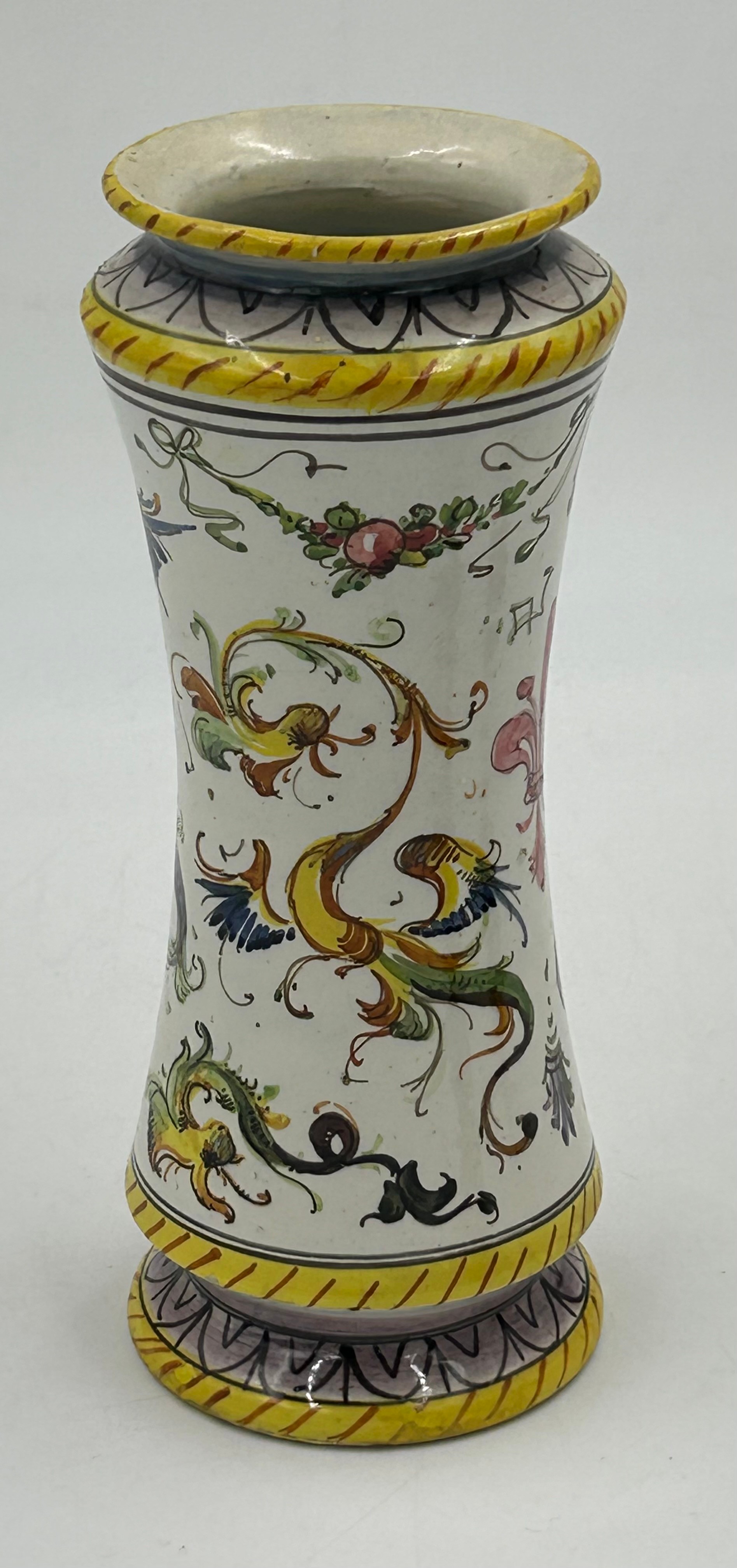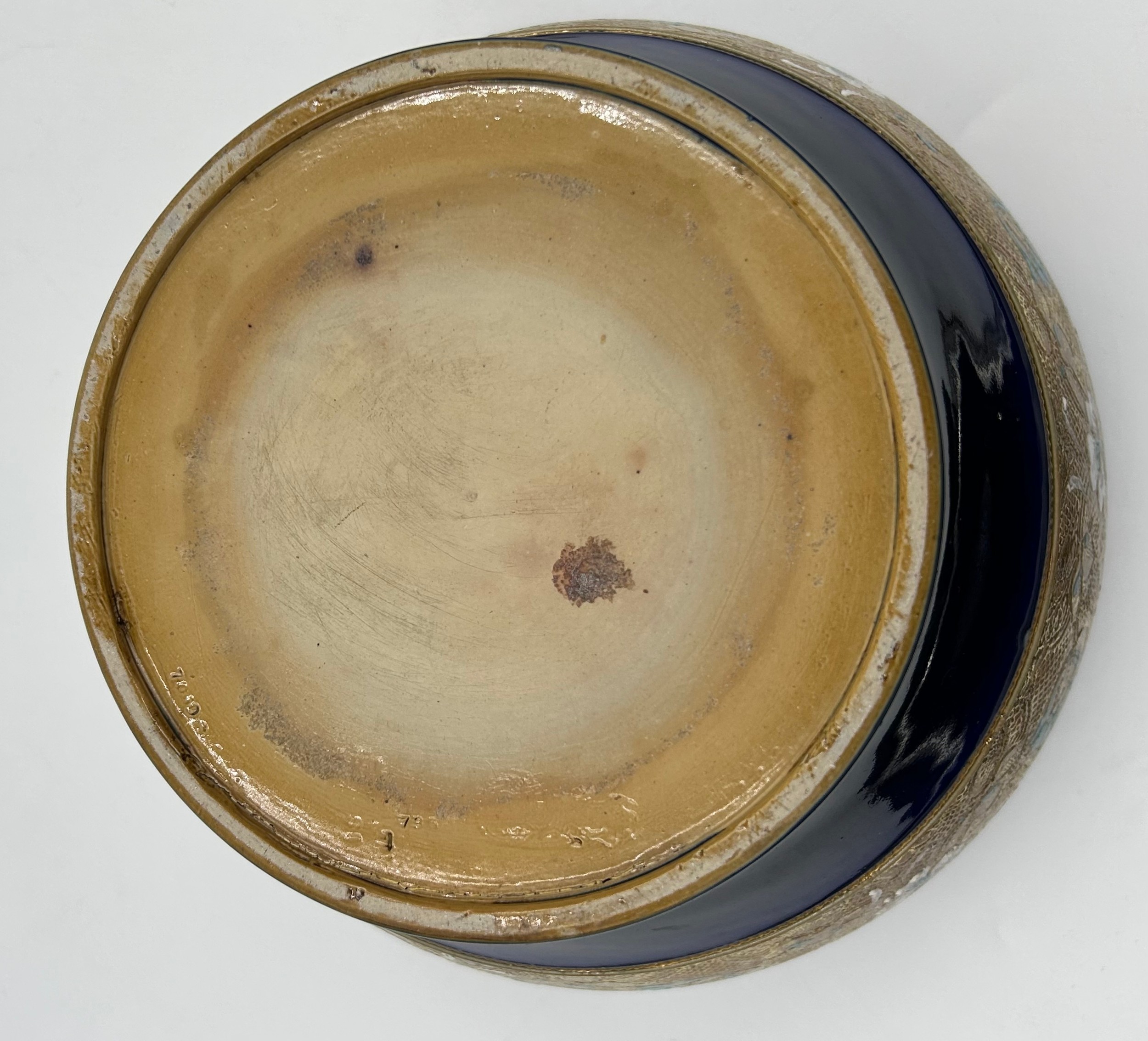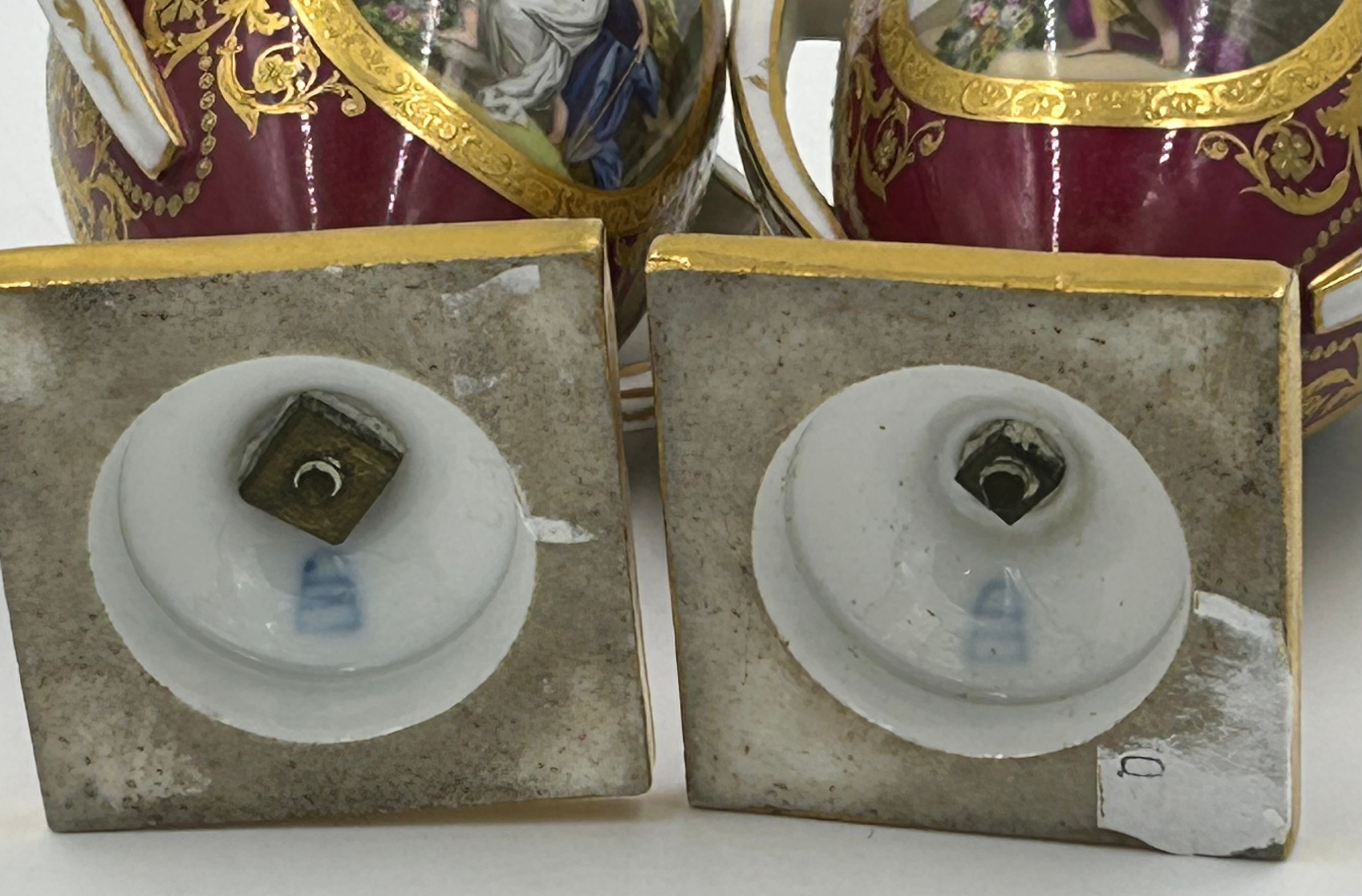 A Doulton Lambeth stoneware chine jardiniere, decorated with flowers, impressed marks to base, 21cm d x 19cm h together with a pair of Royal Vienna twin handled vases with panels depicting classical figures and gilt embellishment and beehive marks to the base, 11cm h and a continental vase 21cm h.