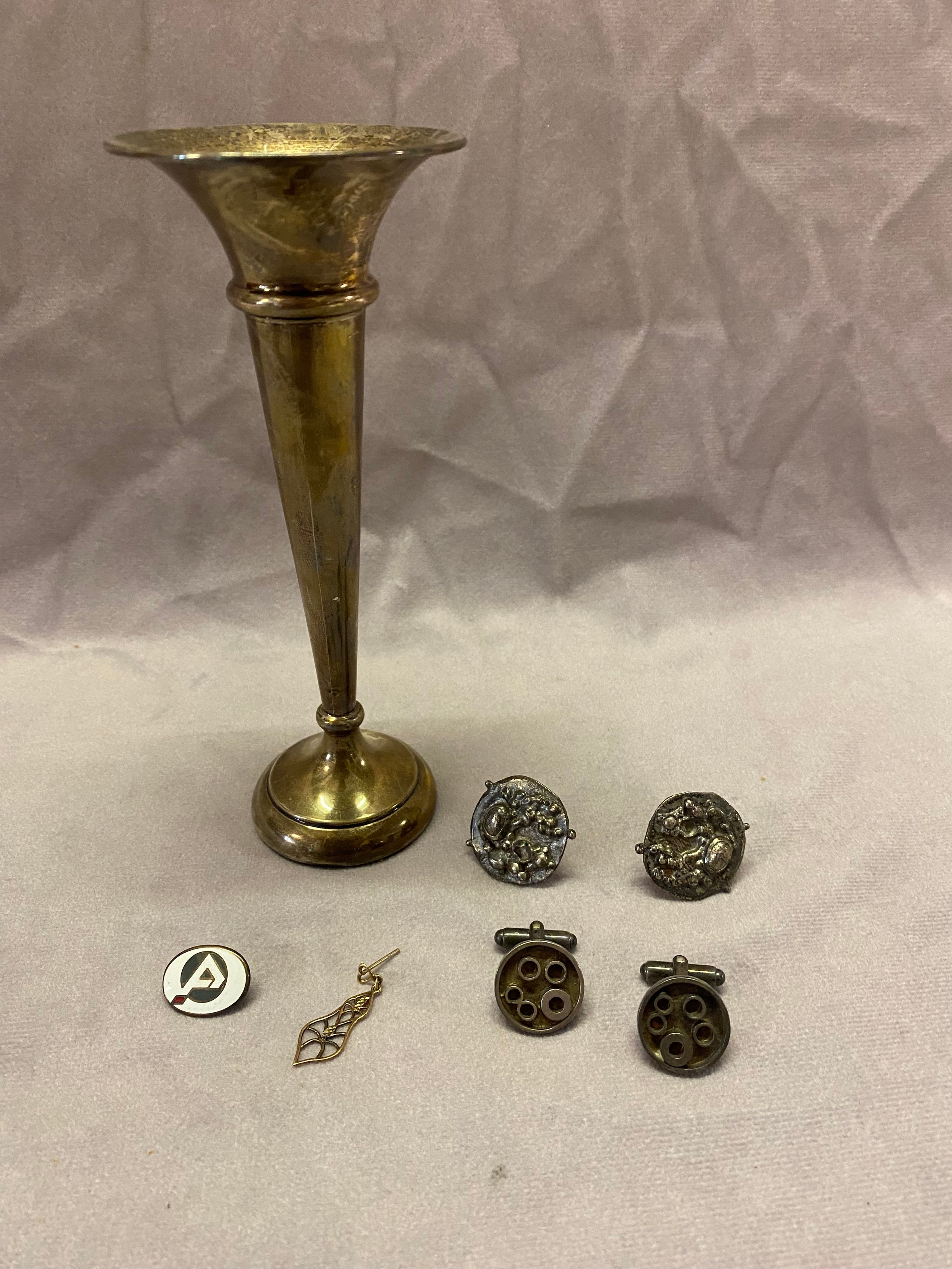 Two pairs of cufflinks, a dress stud, a 9ct. gold earring and a silver spill vase