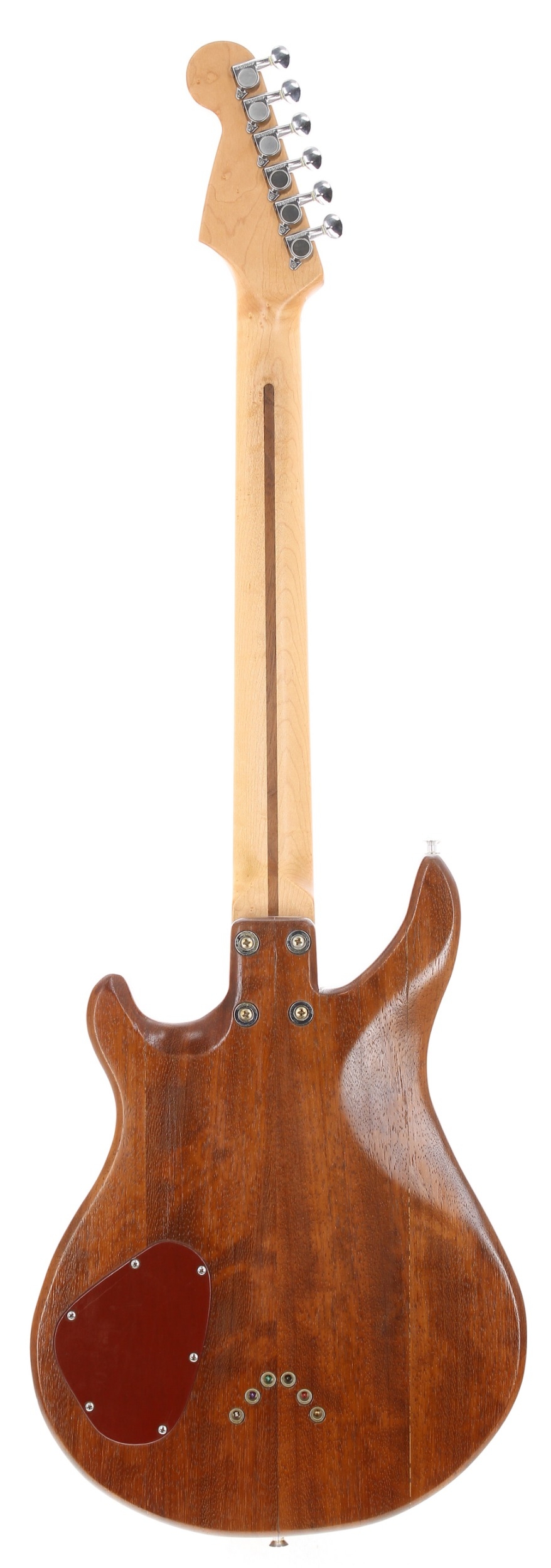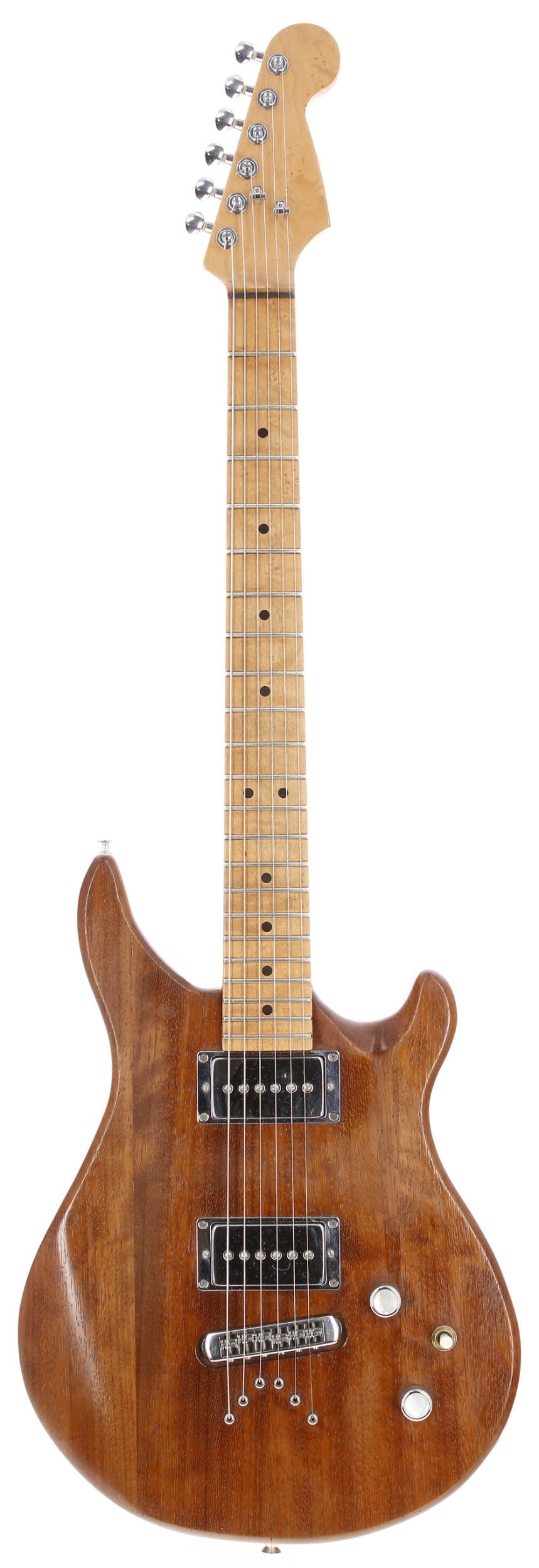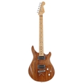 Vendor made Patrick Eggle inspired custom electric guitar, made in UK; Body: Patrick Eggle style varnished body, natural Tung oil finished Iroko; Neck: Music Craft birds eye maple neck; Frets: good; Electrics: working, Bare Knuckle Pickup Mississippi Queen Alnico IV pickups with Switchcraft electrics; Hardware: Schaller bridge, Gotoh locking tuners, carbonfibre nut, Music Craft knobs; Case: gig bag; Overall condition: good
