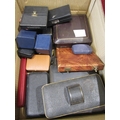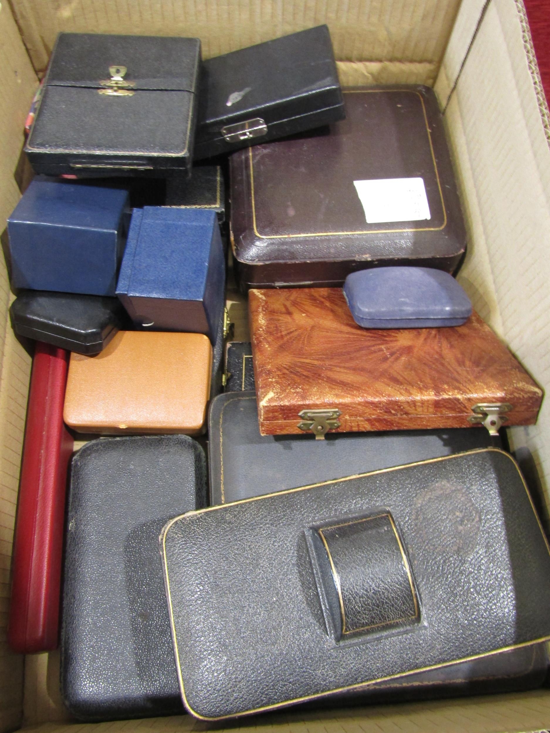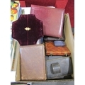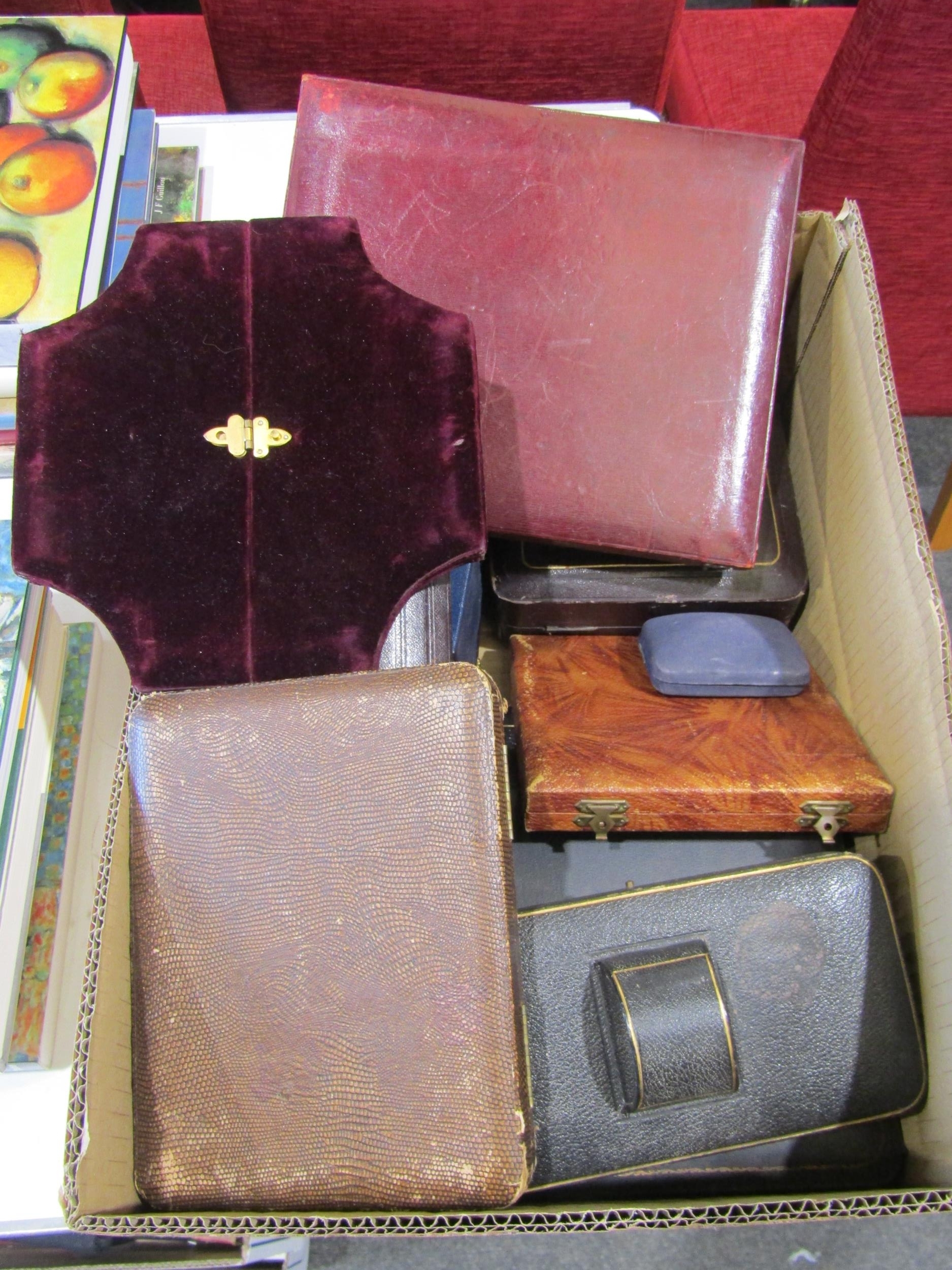 A box containing vintage cases for silver flatware, cruets etc