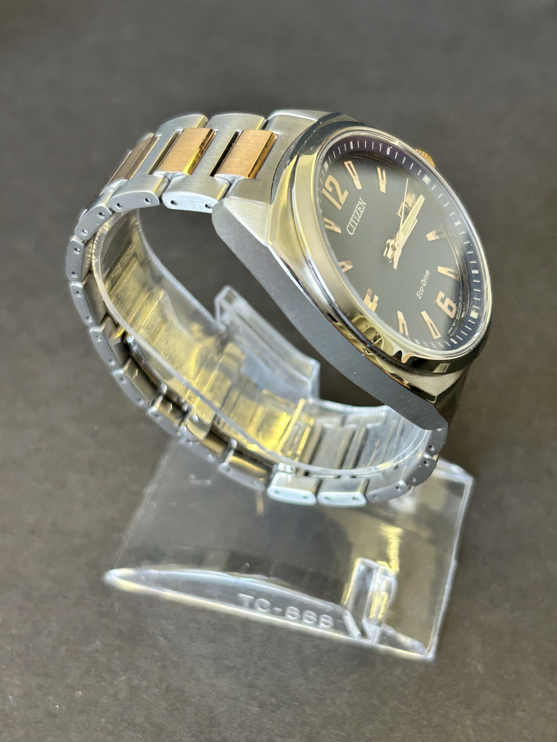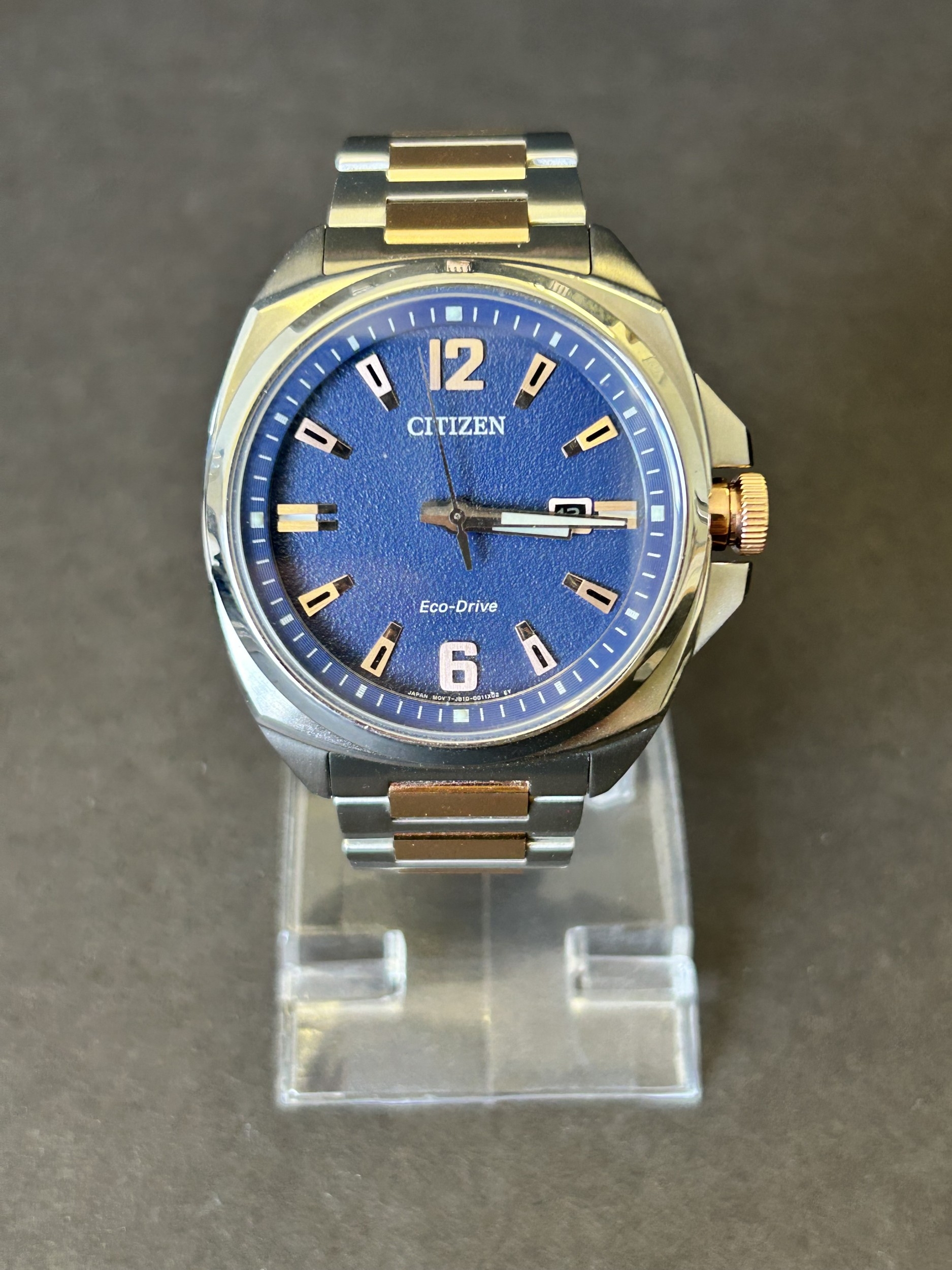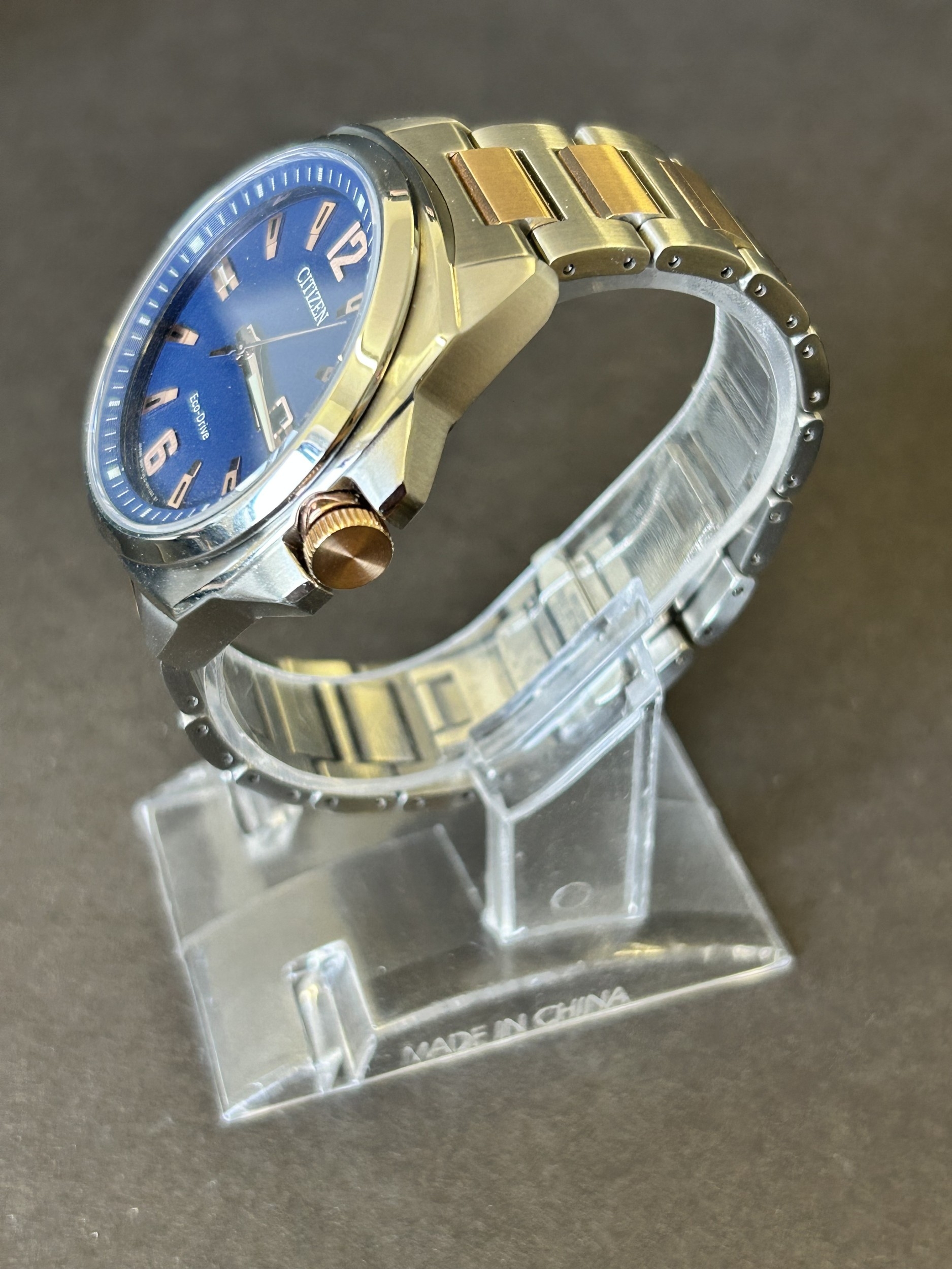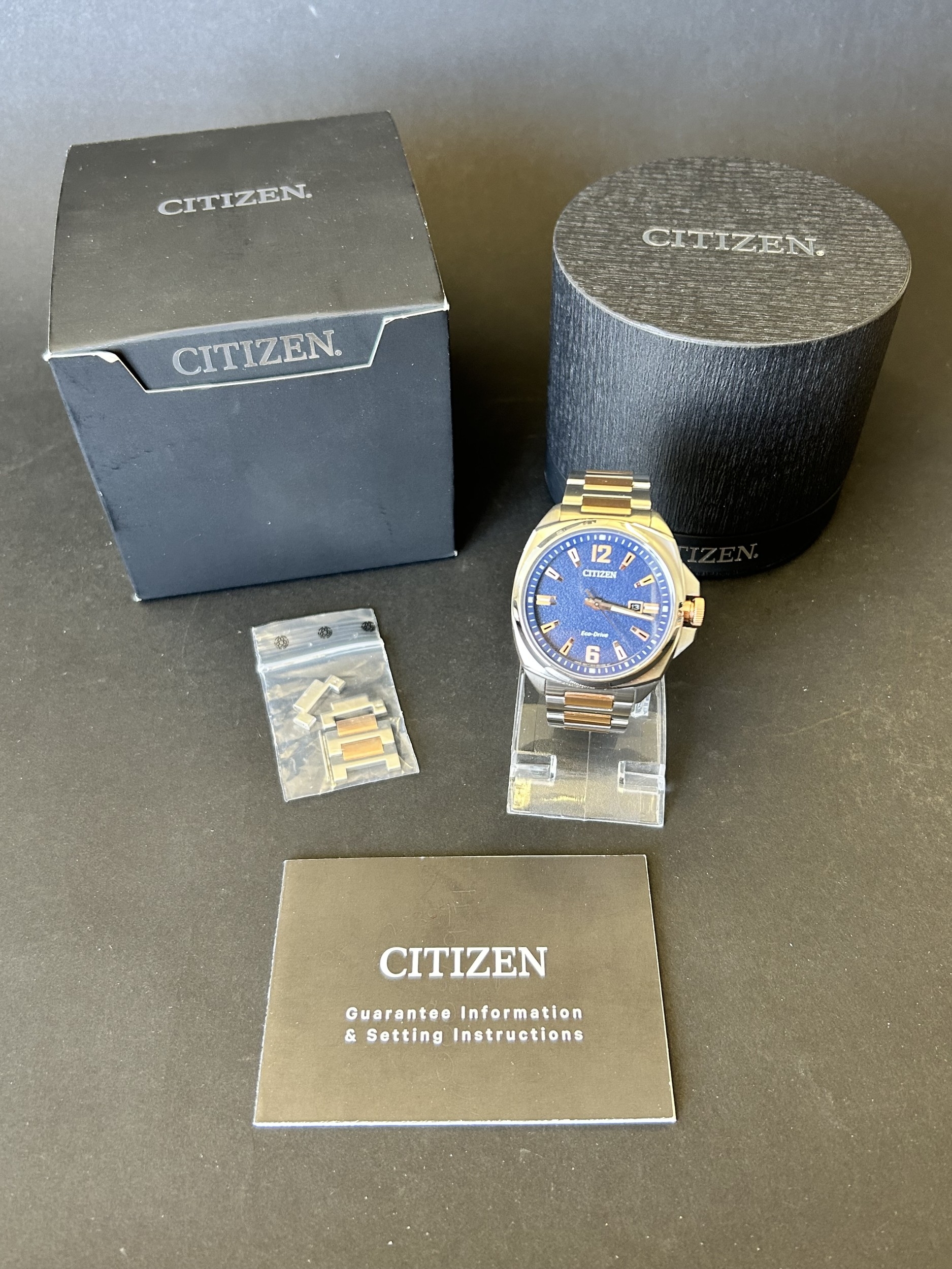 A gentlemans Citizen Eco-Drive two tone blue dial wristwatch, boxed with certificate etc (runs and ticks)