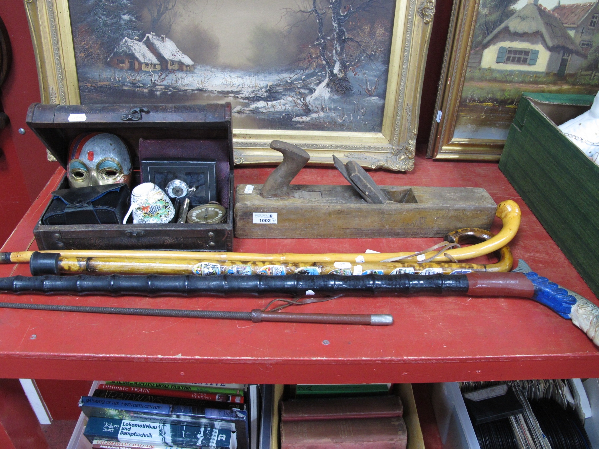 Three Walking Canes, horse crop, plane, coinage, camera, box etc.