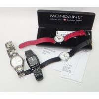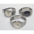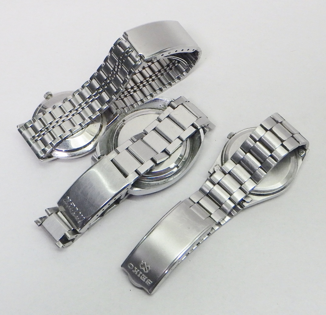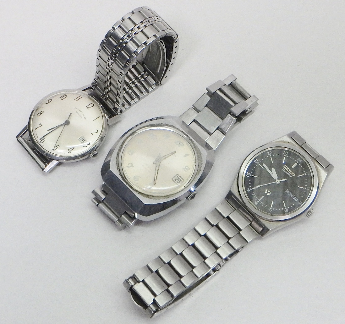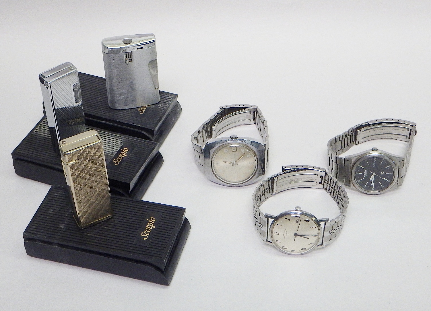 A Favre Leuba Daymatic automatic wristwatch c1960s, presented in a chromed case with a steel back, 33mm across / 40mm lug to lug; a Seiko Quartz 8C23-6030 black dial bracelet watch c1975; a Soviet-era Sekonda automatic movement wristwatch; two Scorpio cigarette lighters and another by Ronson.