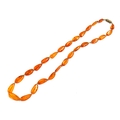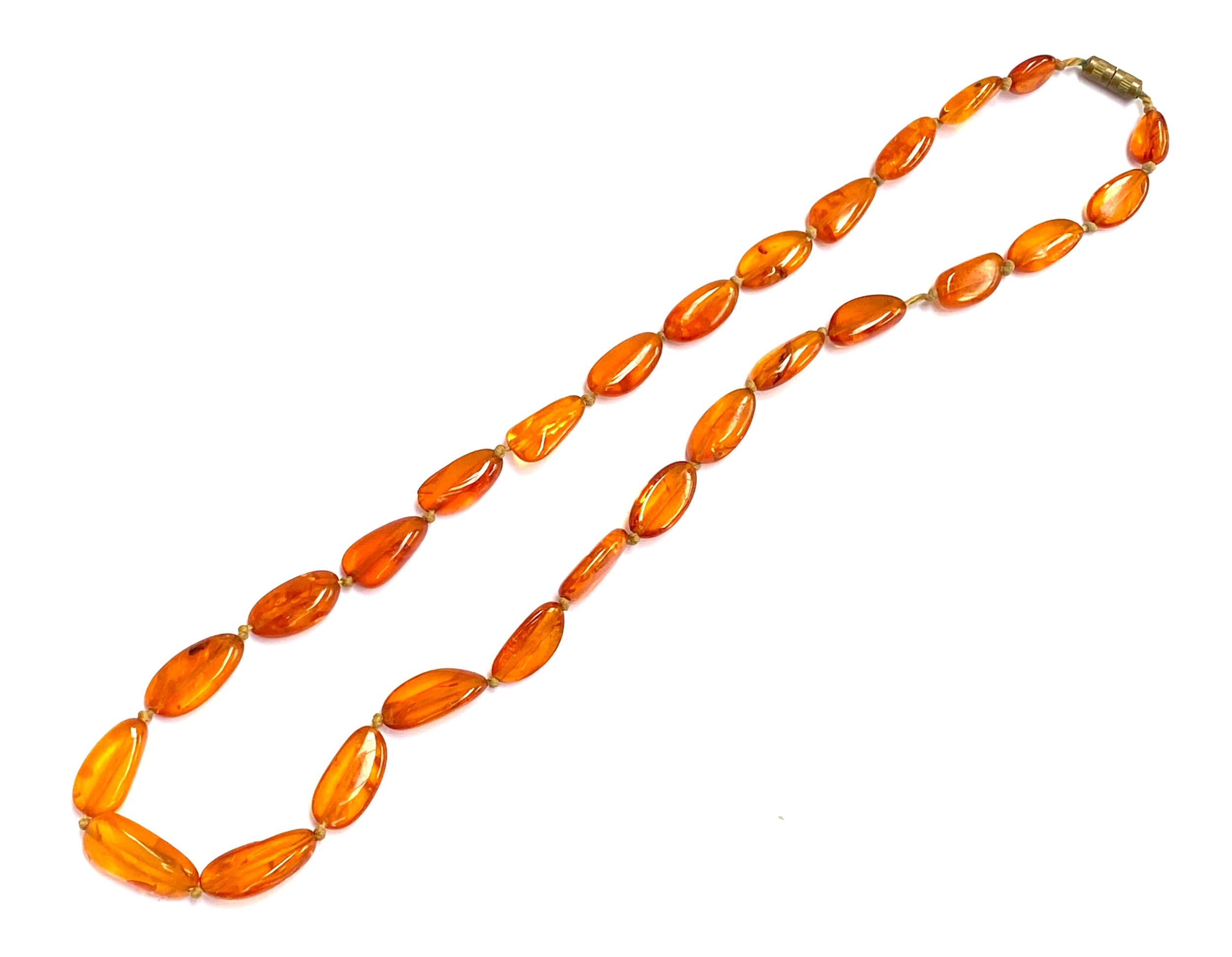 A vintage string of amber beads, knotted, the largest bead 2cmL, fastening with a screw barrel clasp, 11.5g