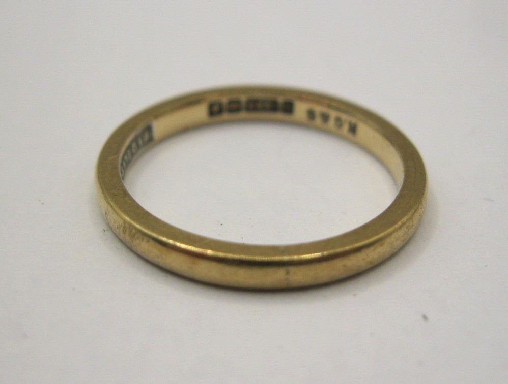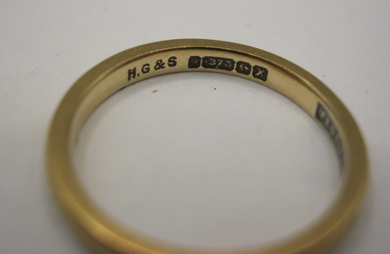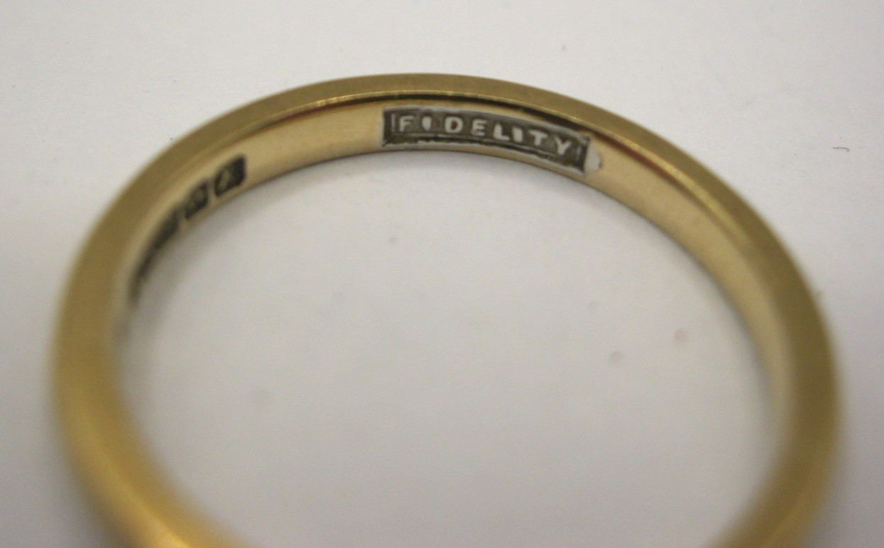 A plain 9 carat gold ring with British hallmarks and stamped FIDELITY inside, ring size I/J, approx. 1.7g