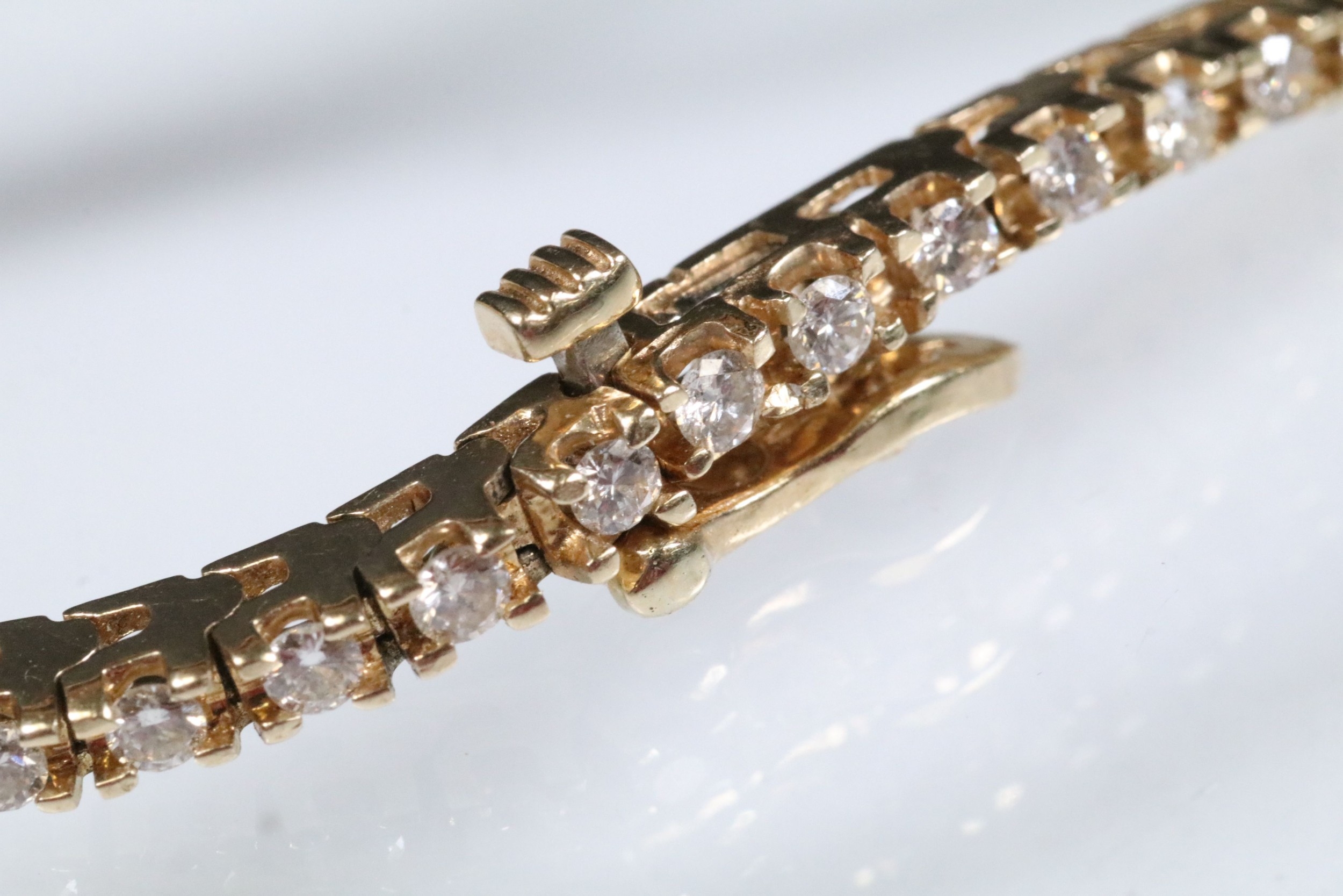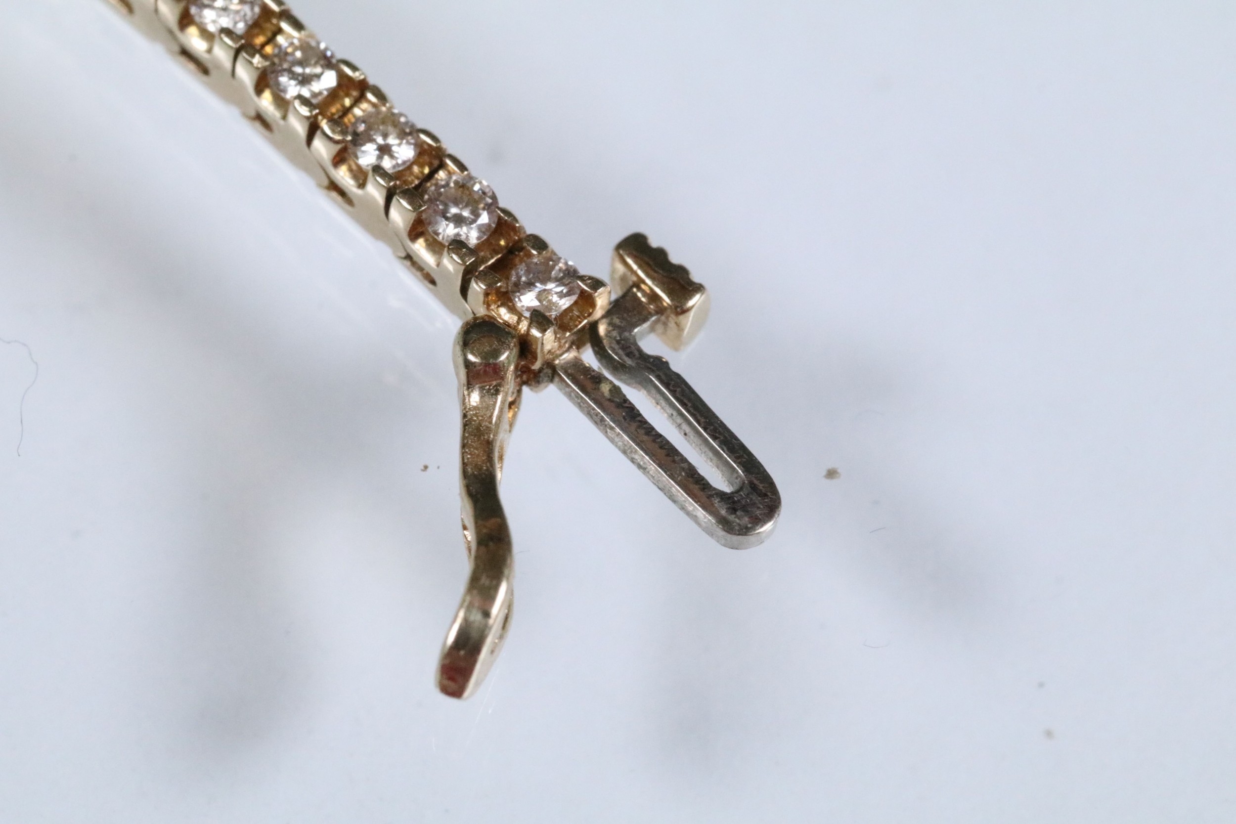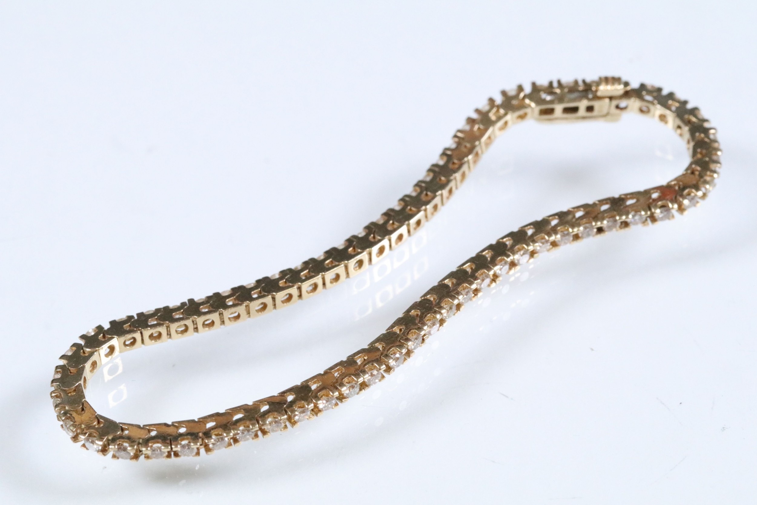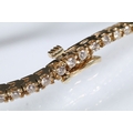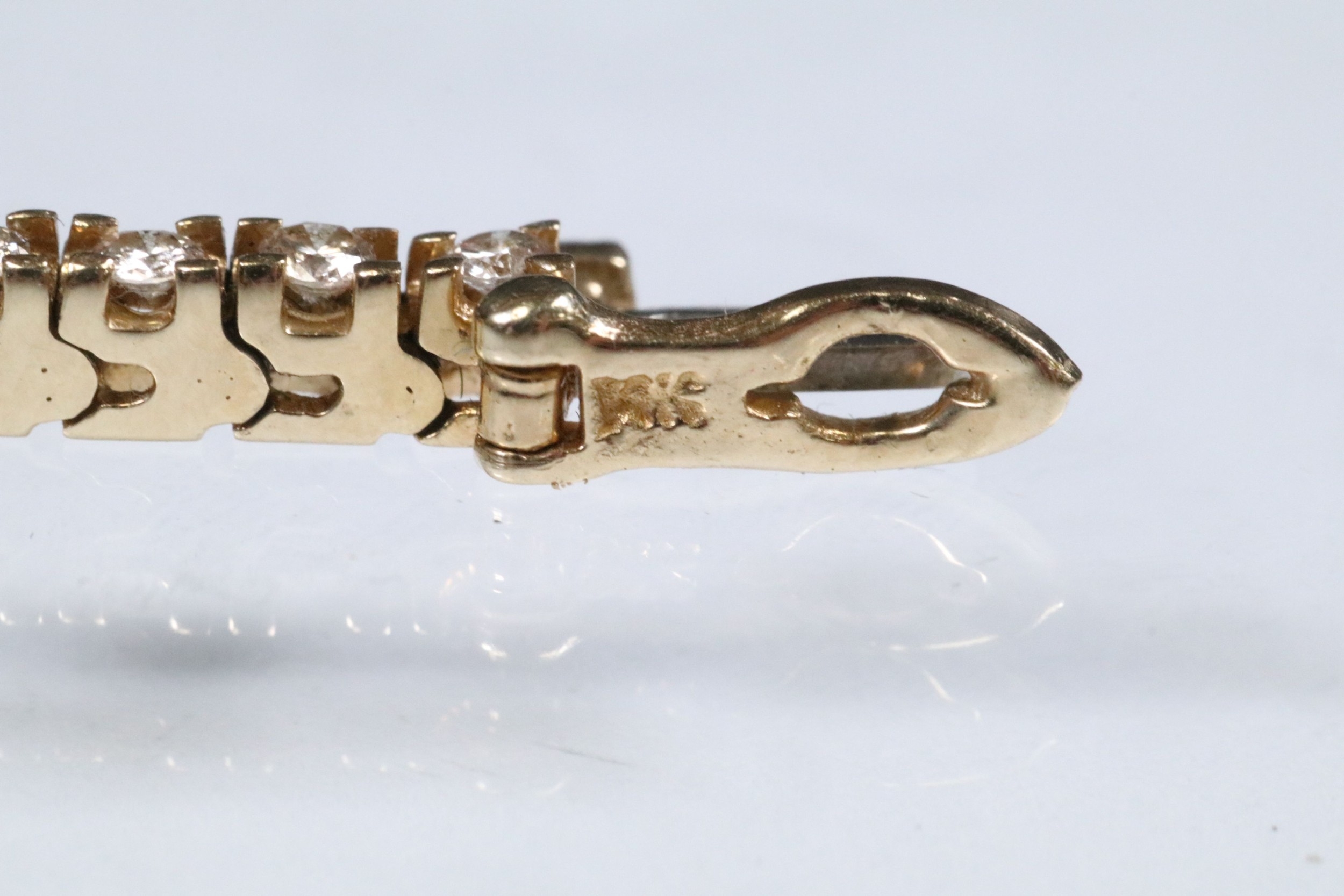 14ct gold and diamond line bracelet. The bracelet set with approx 61 round brilliant cut diamonds estimated 0.03ct each. Marked 14k to clasp. Measures 7 inches.