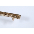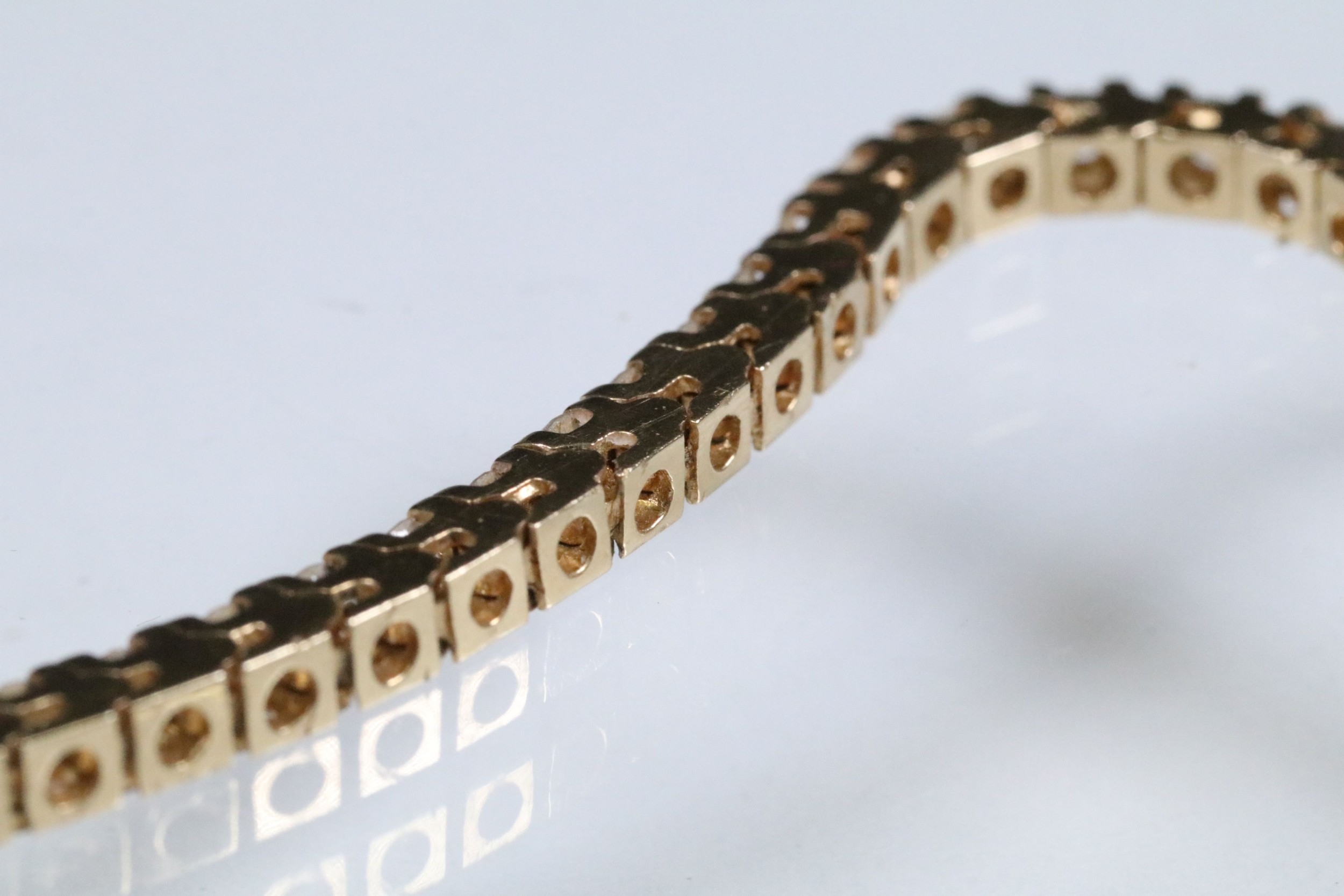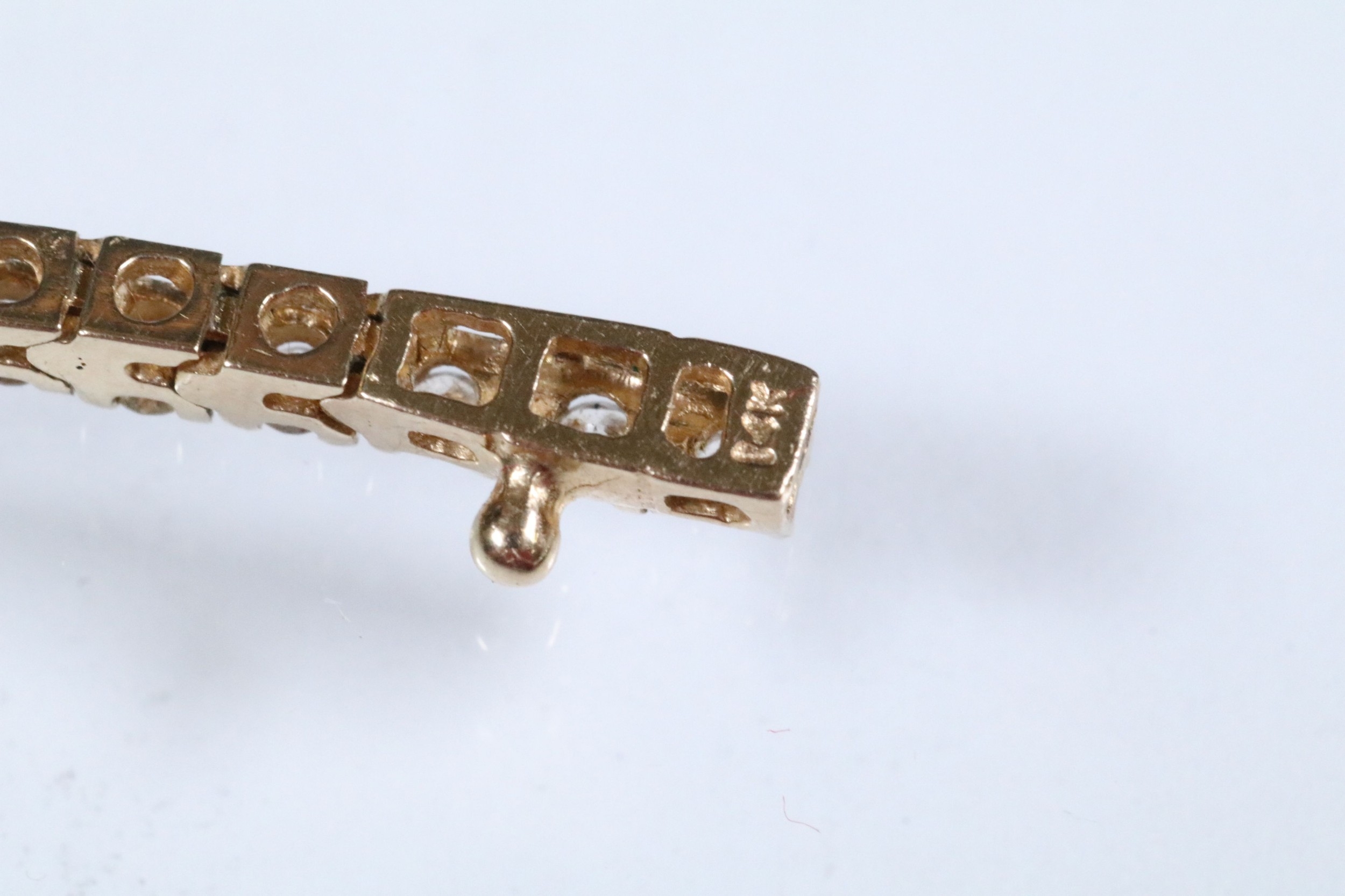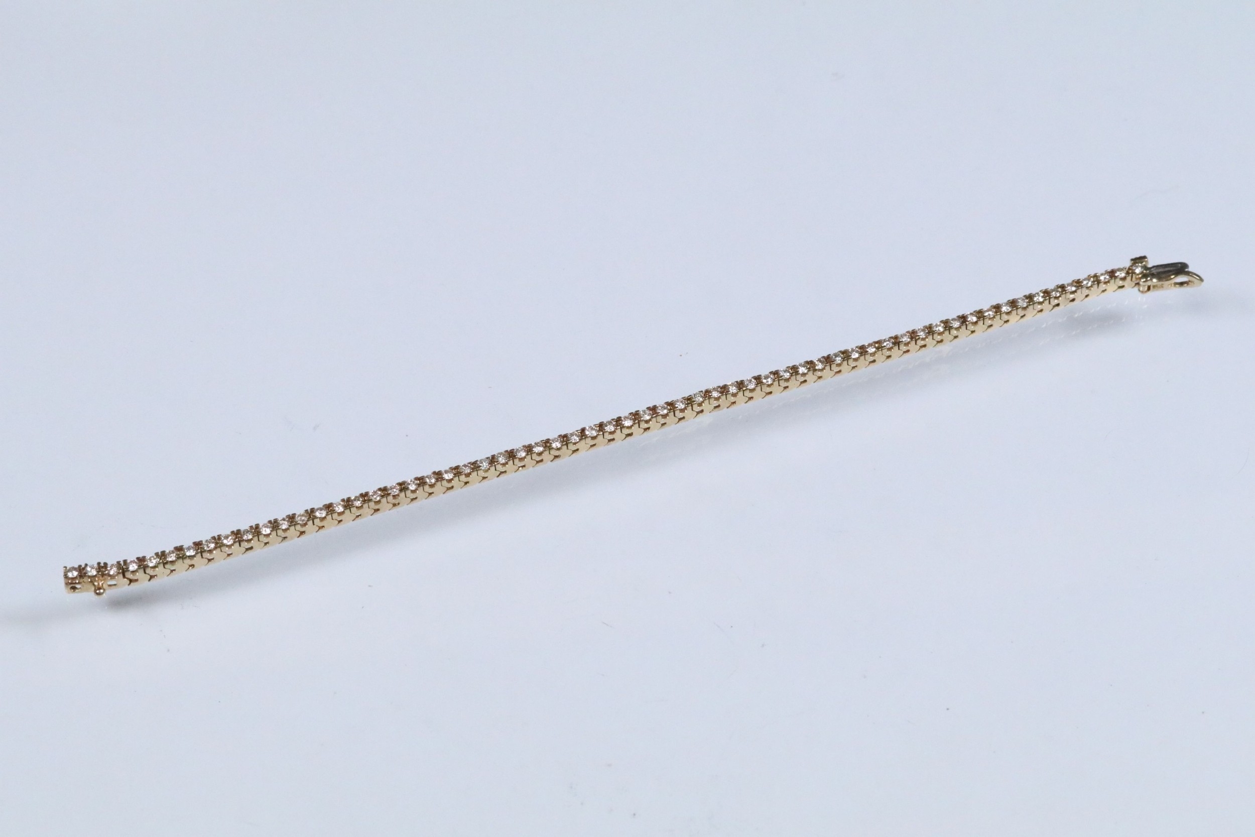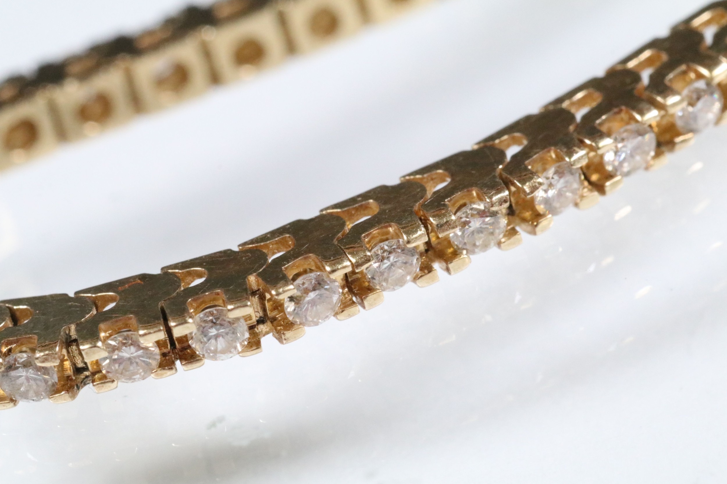 14ct gold and diamond line bracelet. The bracelet set with approx 61 round brilliant cut diamonds estimated 0.03ct each. Marked 14k to clasp. Measures 7 inches.