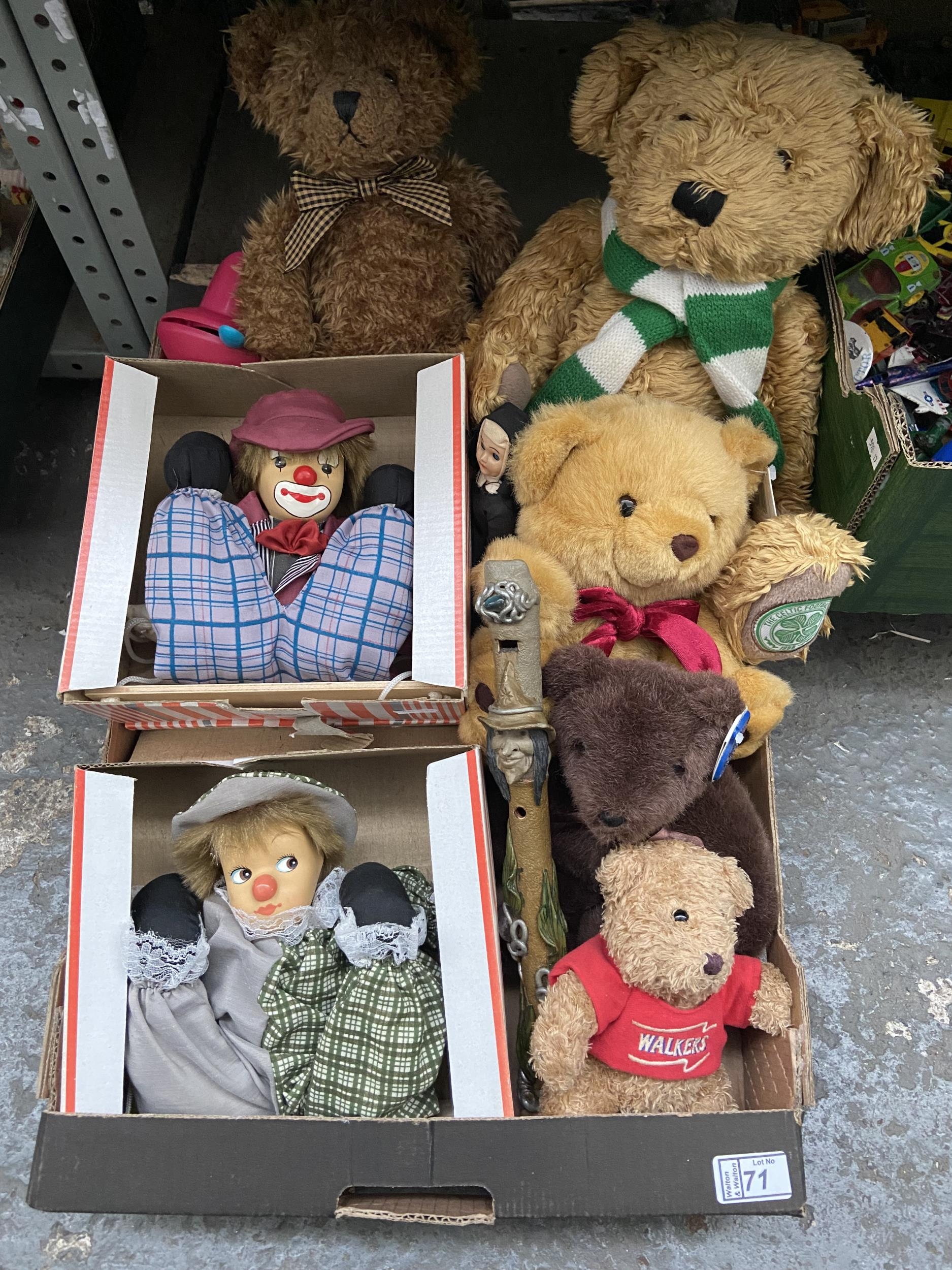 Box containing collectible Teddy Bears and clowns etc