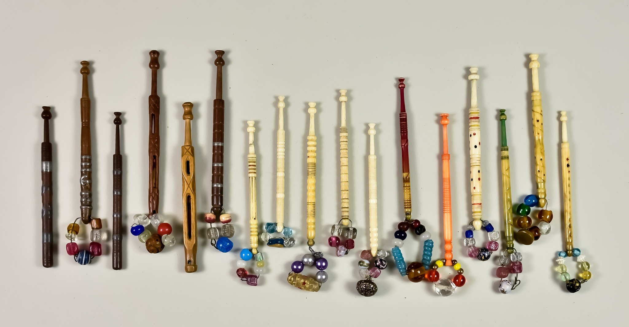 A Large Quantity of Bone and Wood Lace Bobbins, 19th/20th Century, including domino, slashed, coloured, wire wrapped, pewter inlaid, mother and babe, spiral carved, some with names/events, most with spangles, approximately 250+