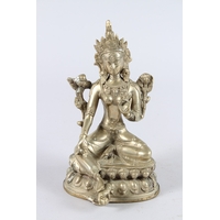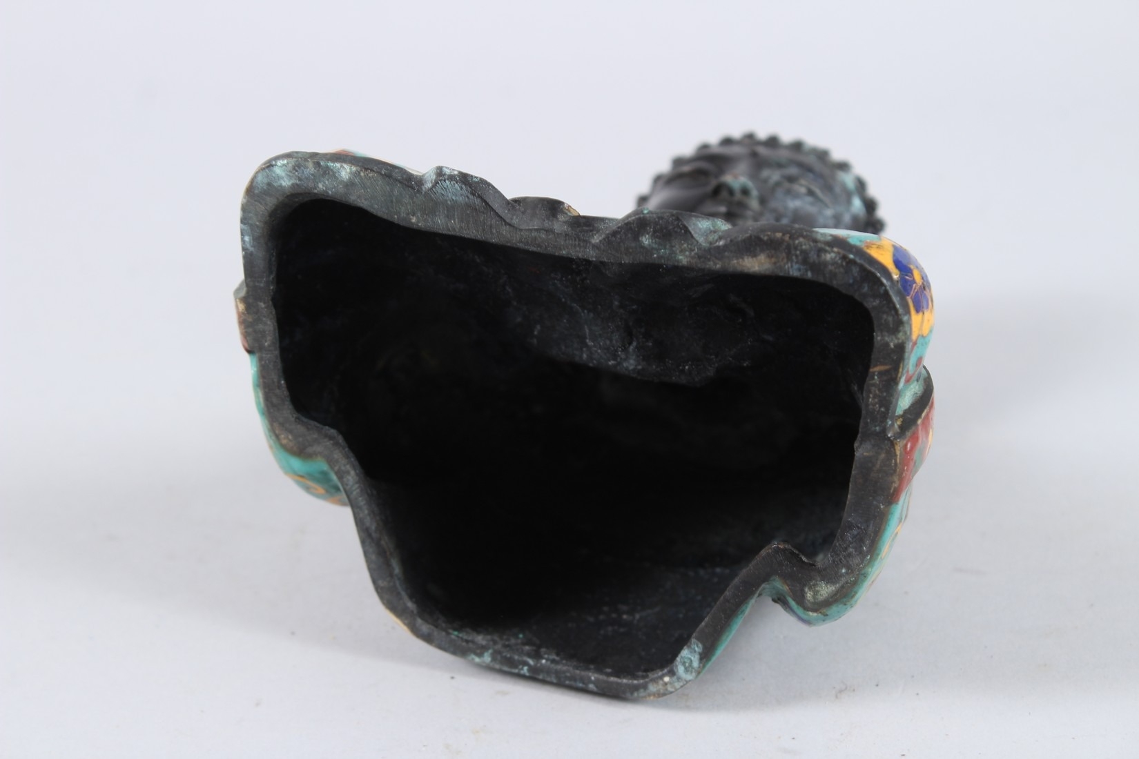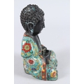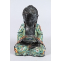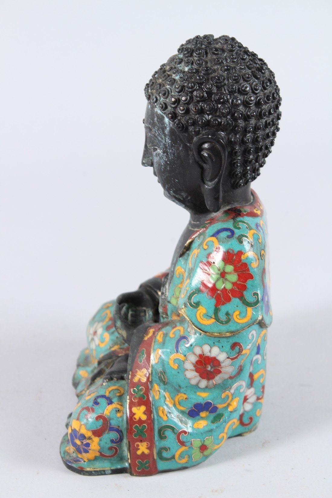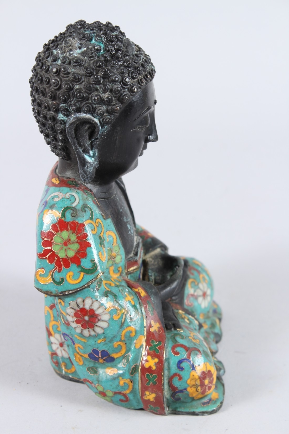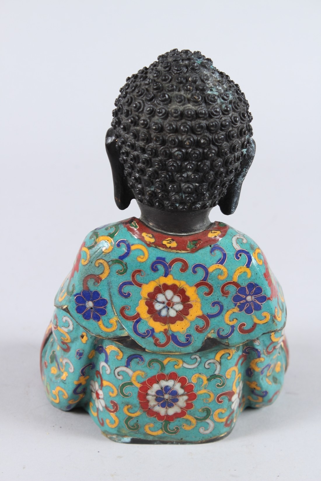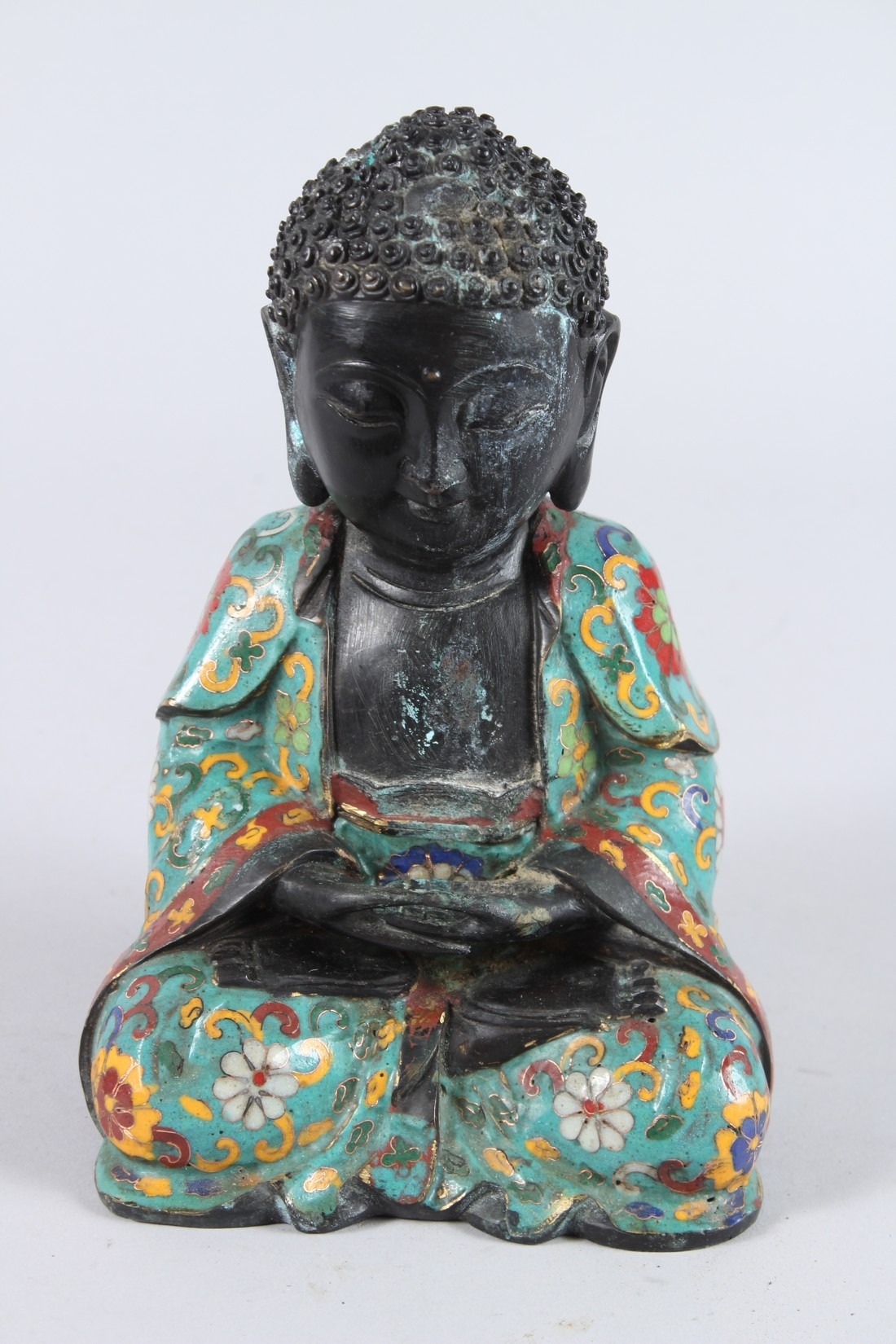 A CHINESE CLOISONNE FIGURE OF A SEATED BUDDHA, hands clasped together.