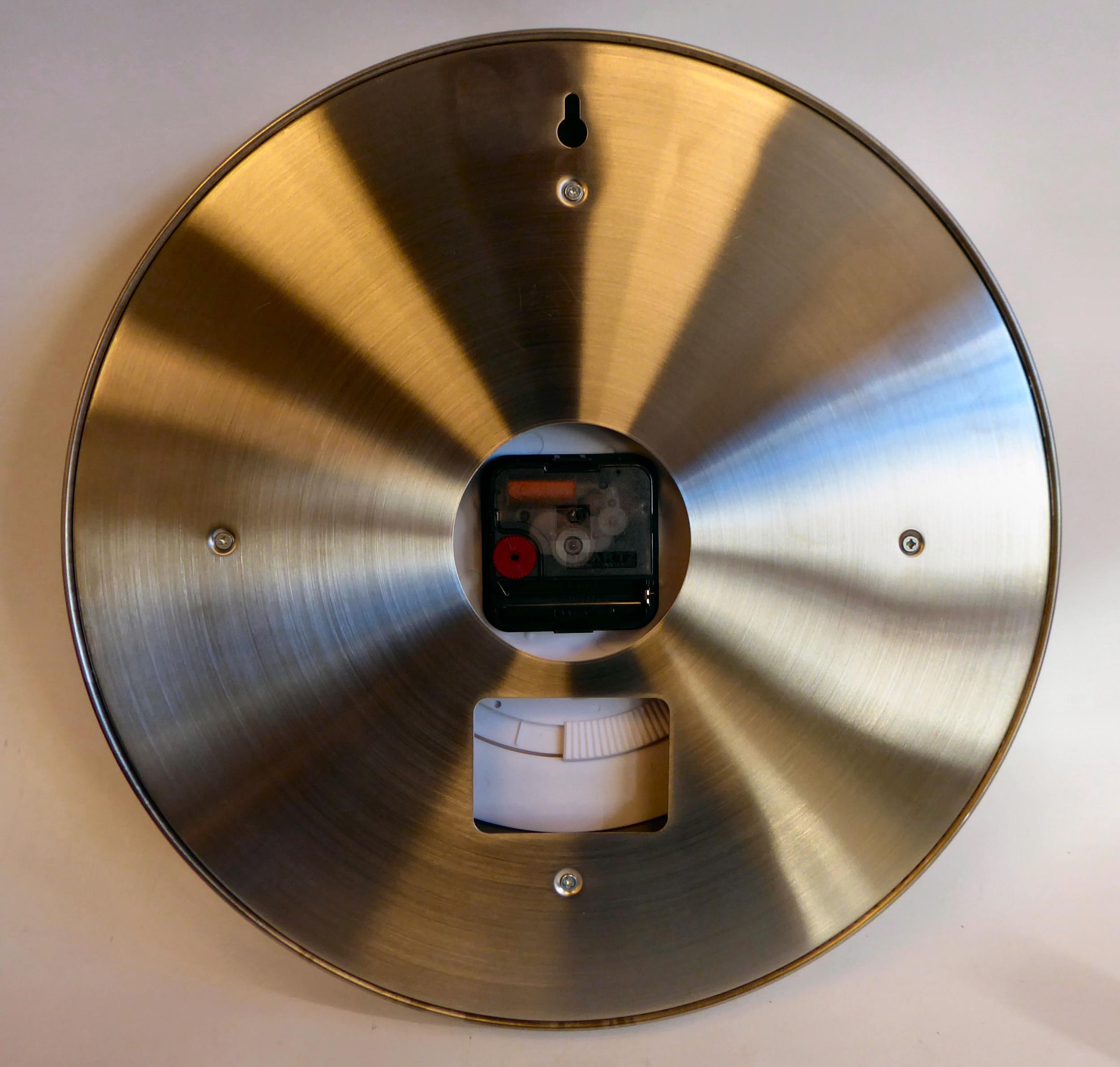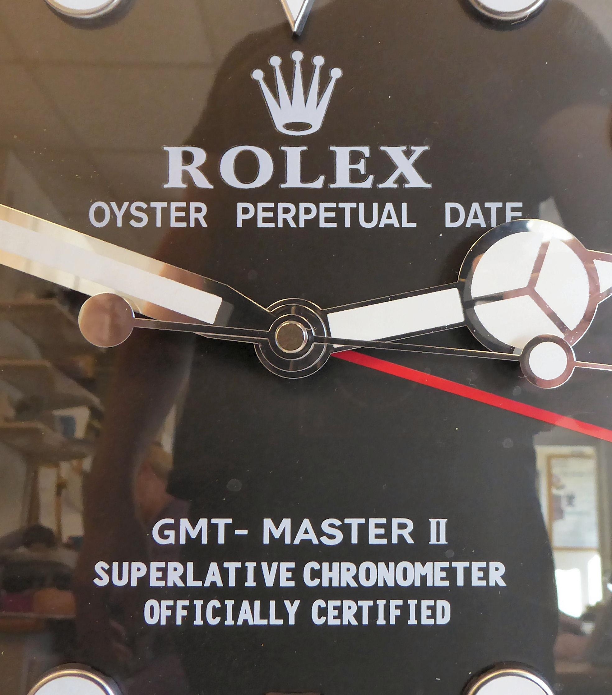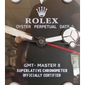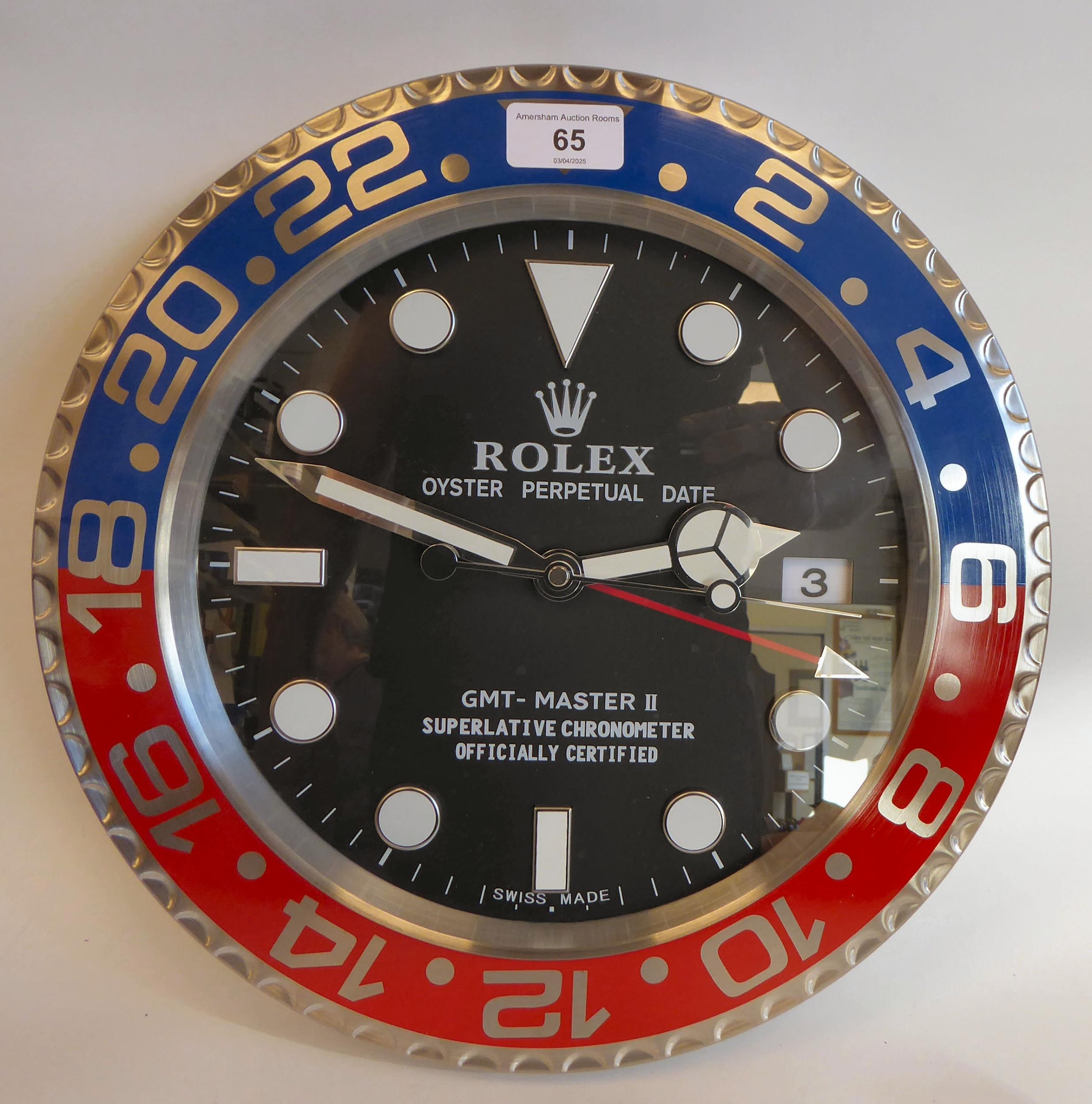 A dealer display advertising wall timepiece for 'Rolex Oyster Perpetual', faced by a black baton dial, incorporating a date aperture 13.5"dia