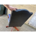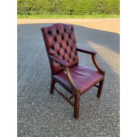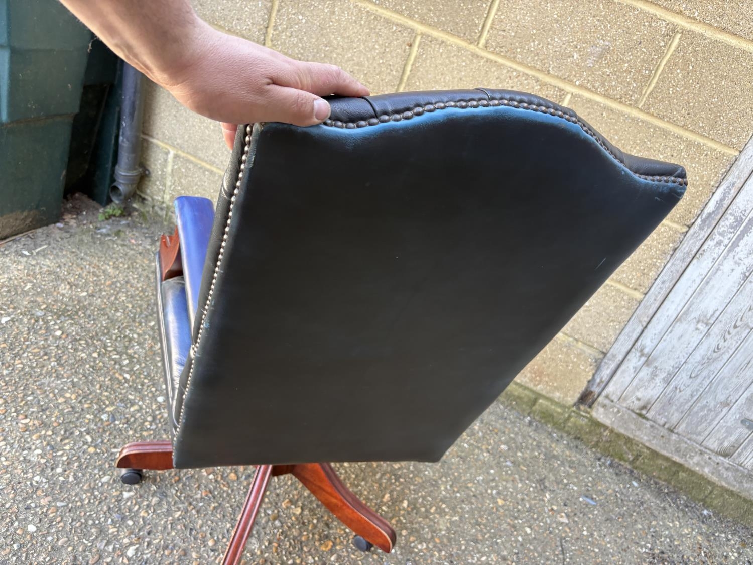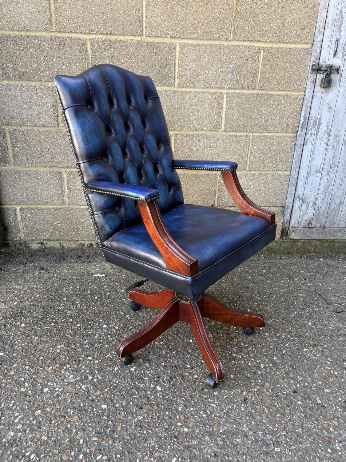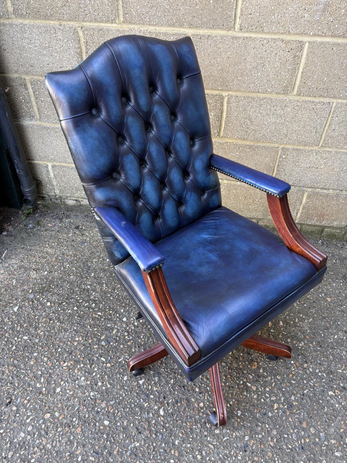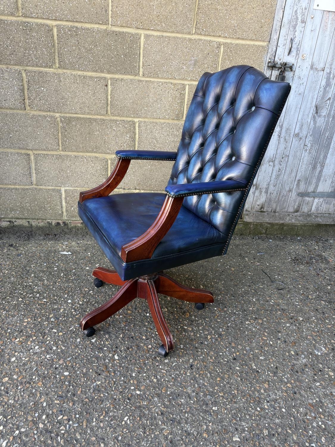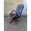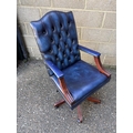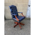 A blue leather chesterfield swivel desk chair