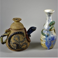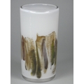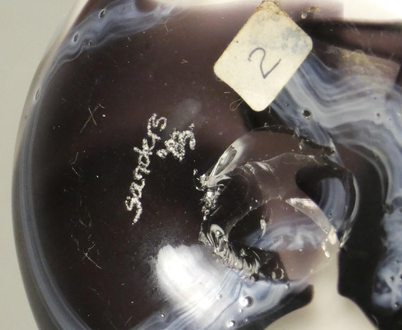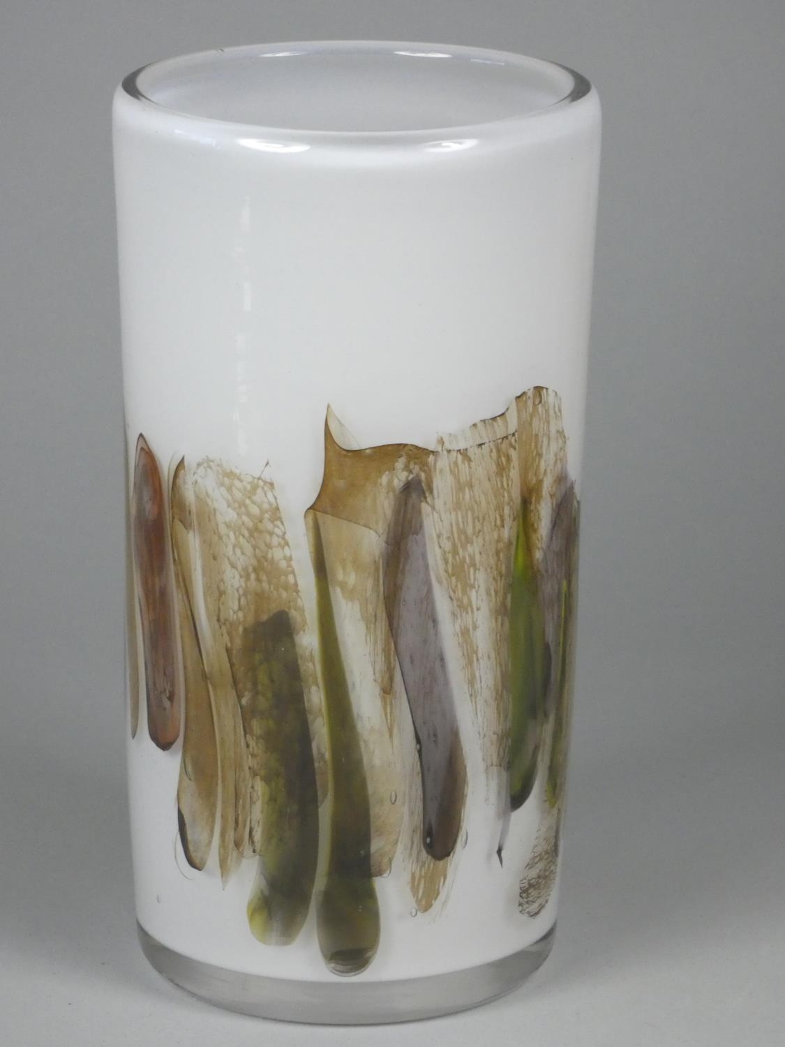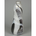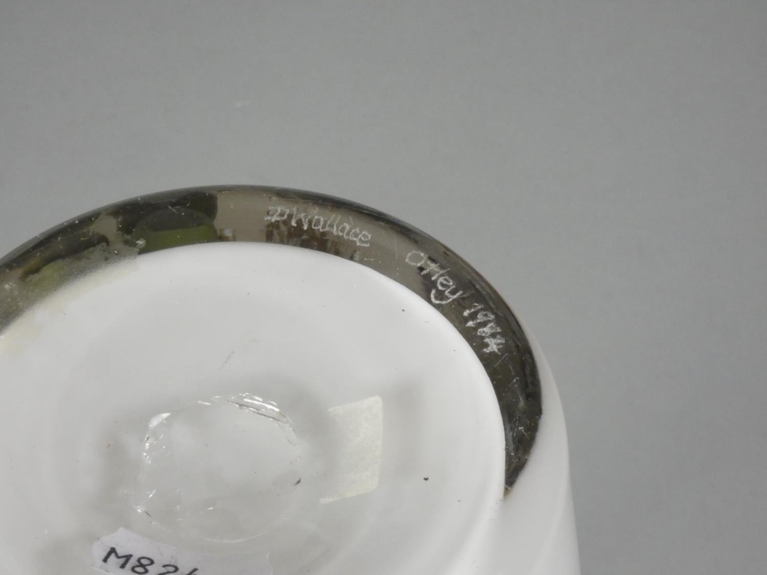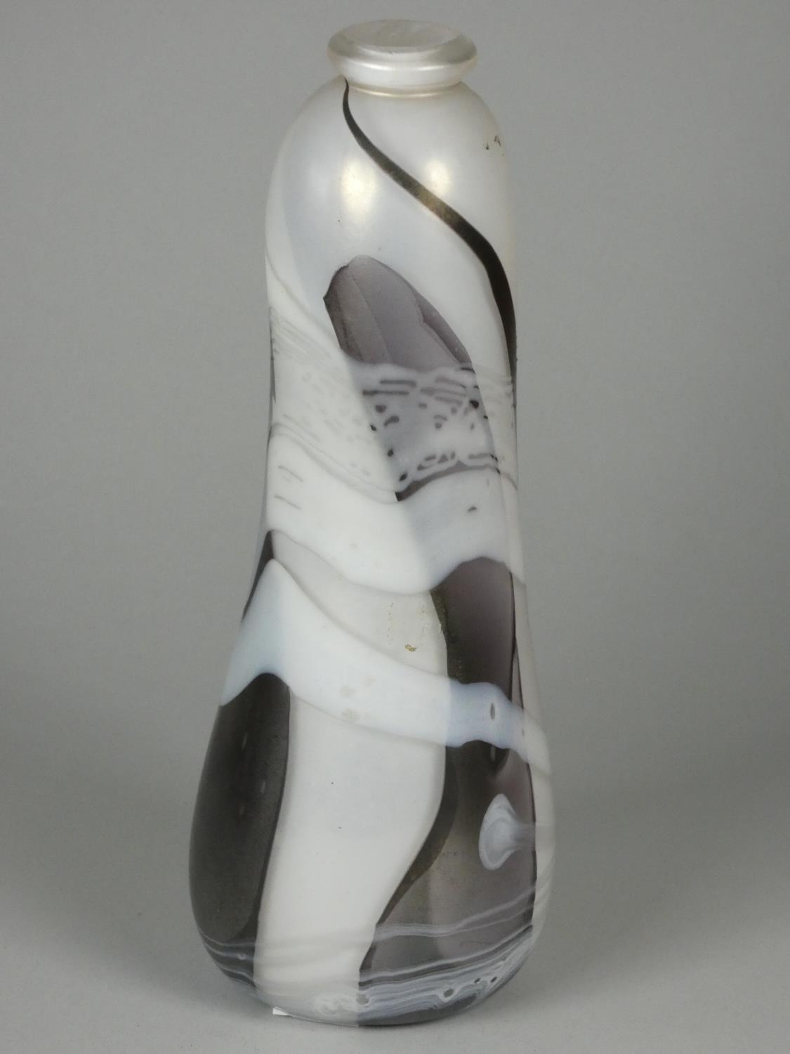 An Andrew Sanders, an iridescent black and white pearl baluster vase, engraved AH Sanders, '83, height 25 cm together with a David Wallace, white glass vase with earth tone pattern, engraved D WALLACE OTLEY 1984 on base, height 20.3cm