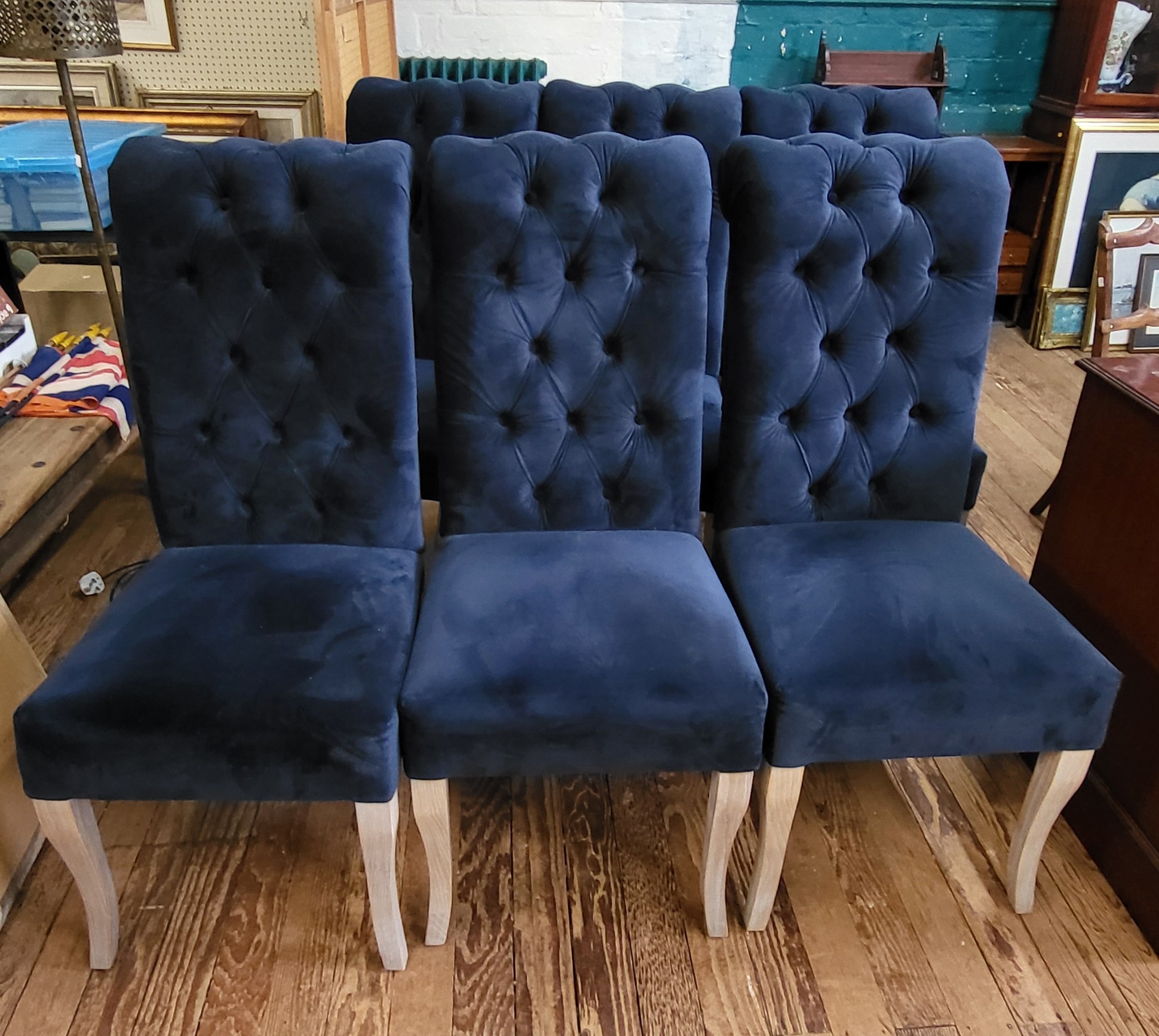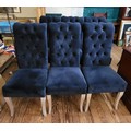 Six navy blue velour button back dining chairs with scroll top and grey ash legs. Backs measure 109cm.