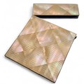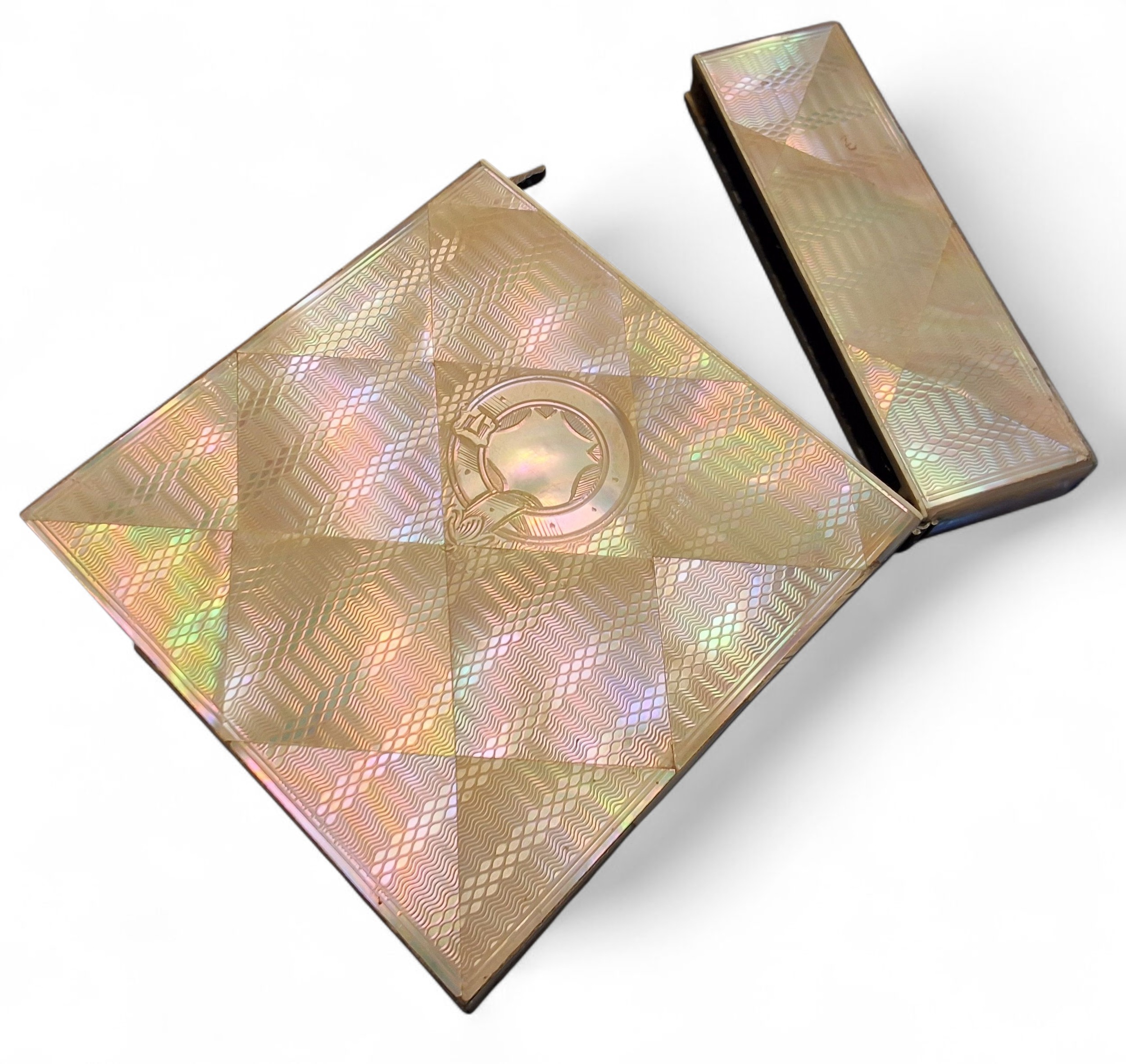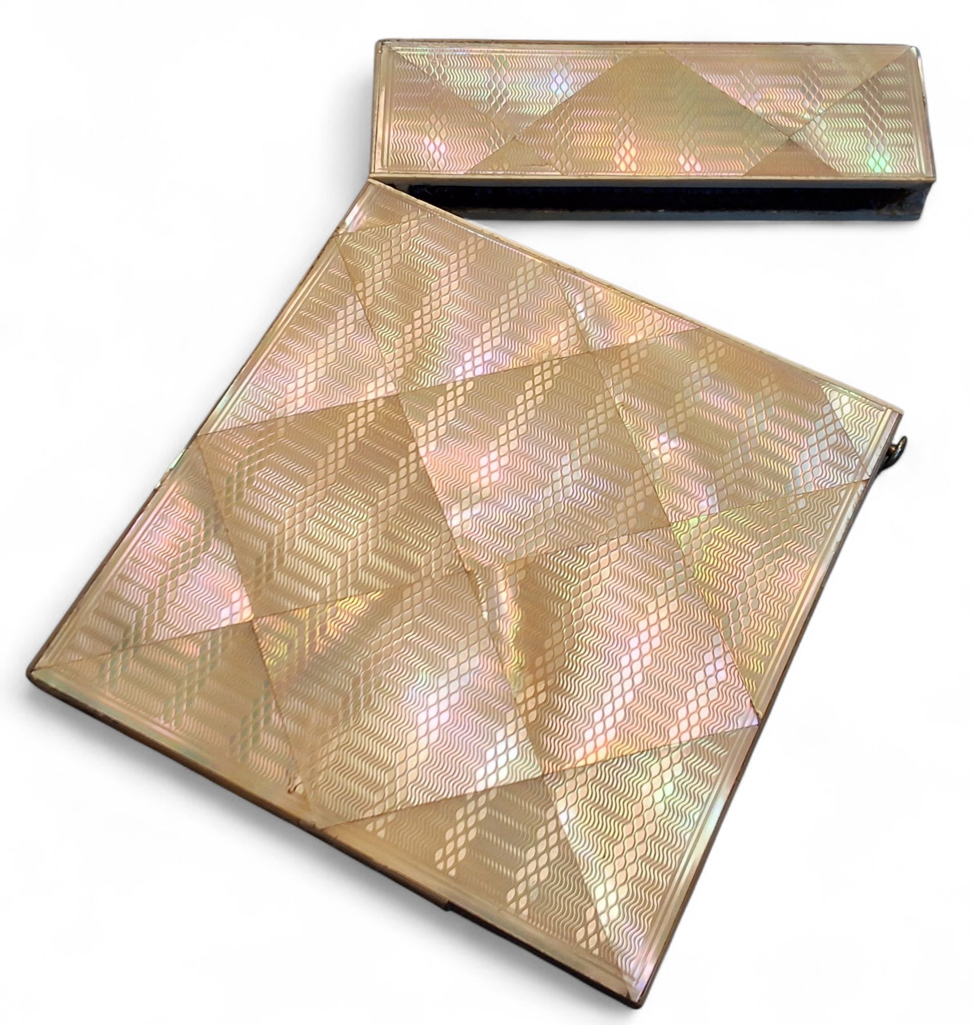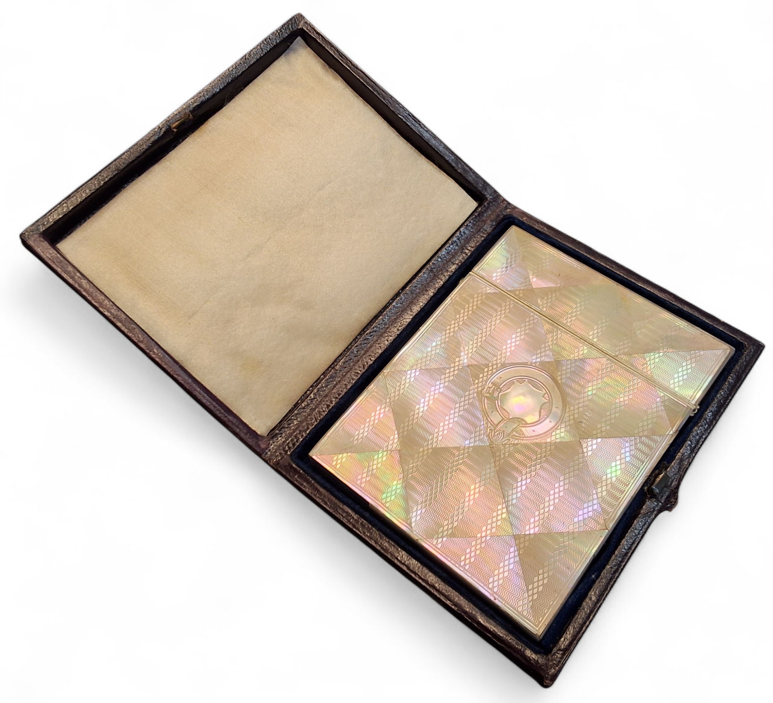 A Victorian mother of pearl card case, engine turned to front and back, vacant cartouche, in original Moroccan leather fitted box, c.1870