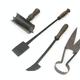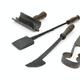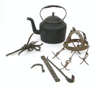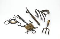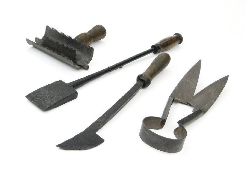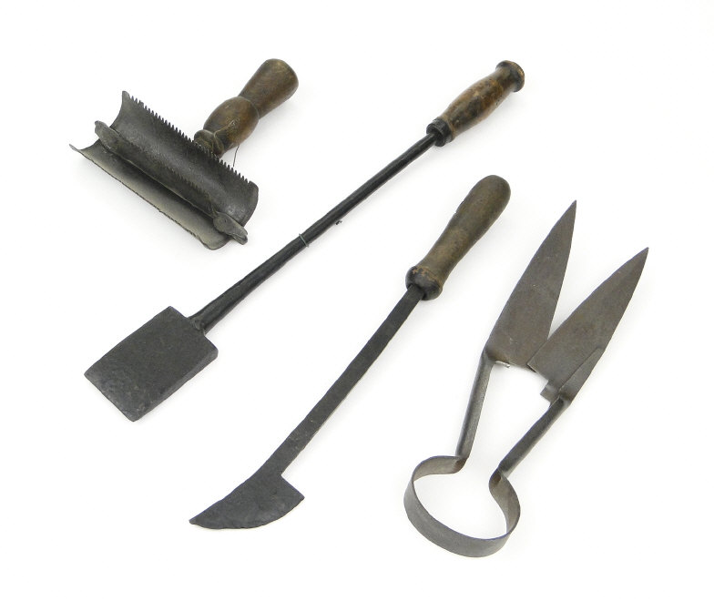 Four antique farming tools - a horse comb, two docking/branding irons and a pair of early sheep shears, the largest item 46cm in length