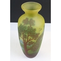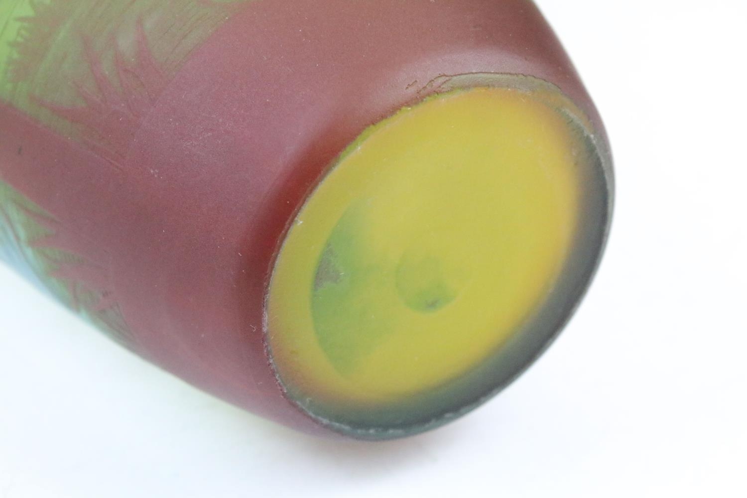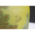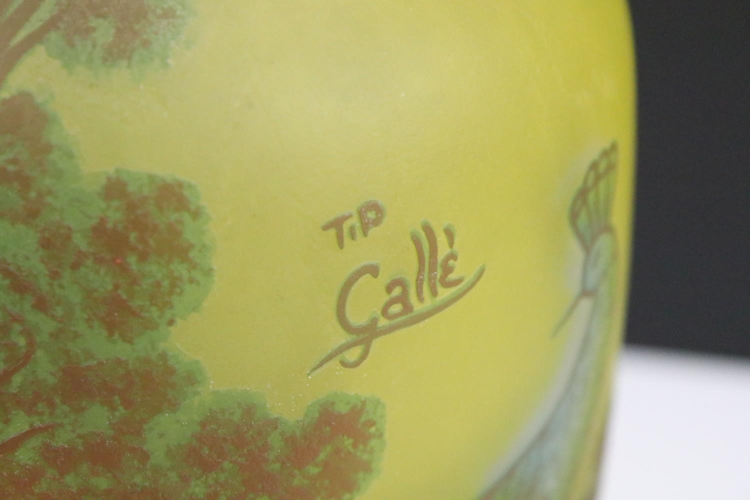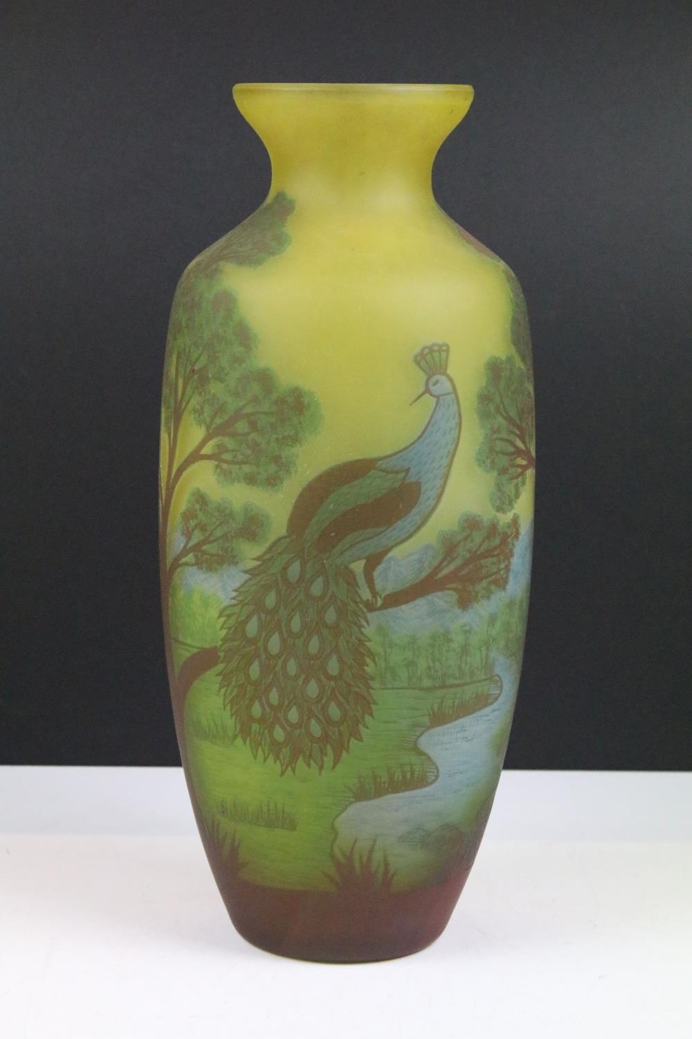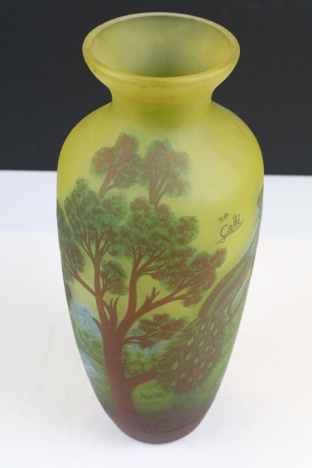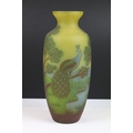 Galle Tip cameo glass vase having a yellow ground with a peacock in landscape design. Signed tip Galle. Measures 33cm tall.