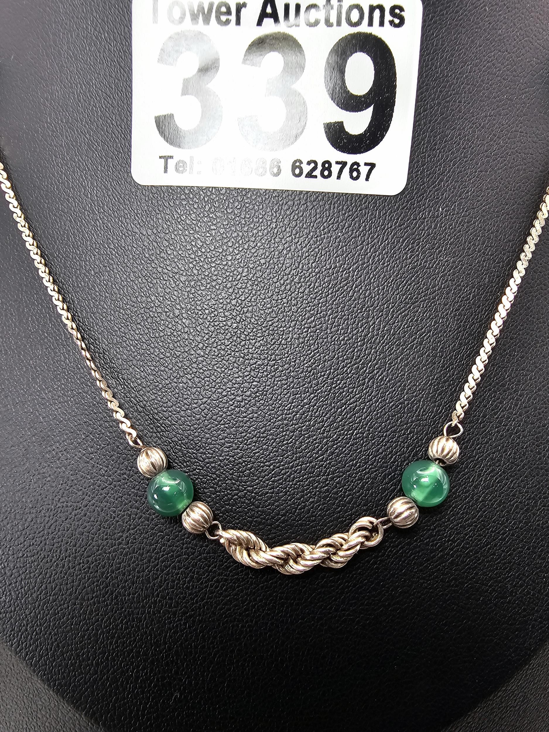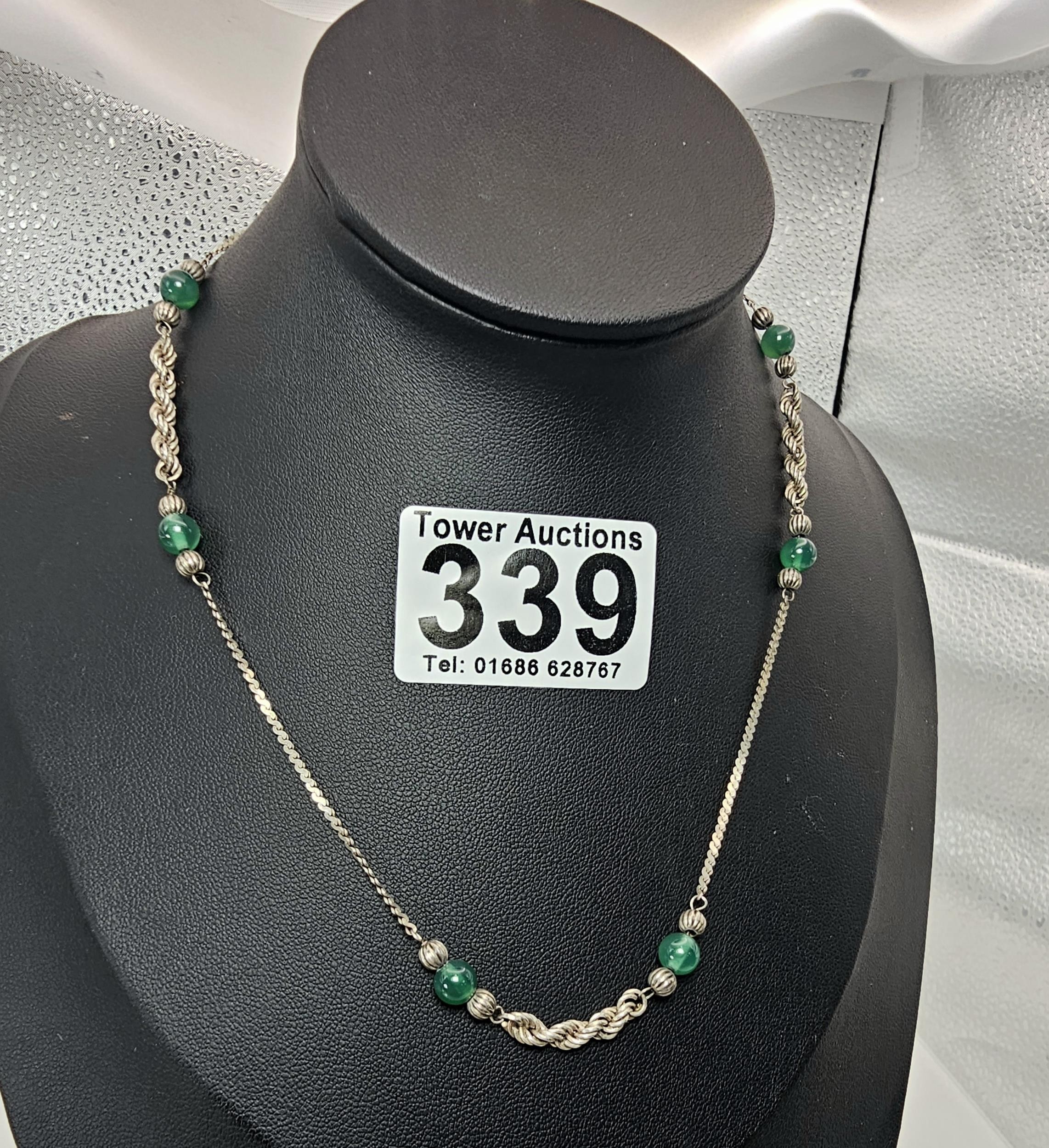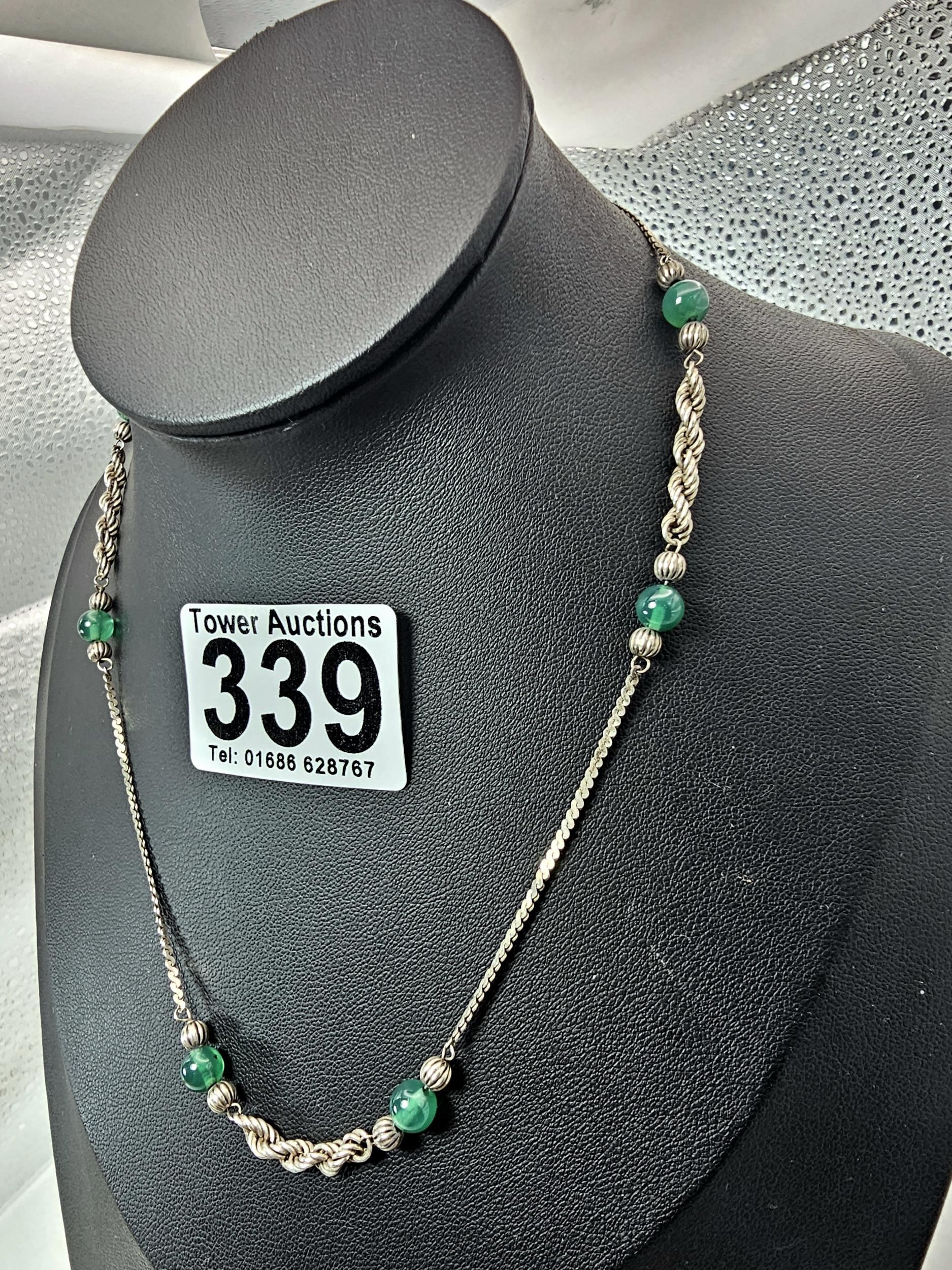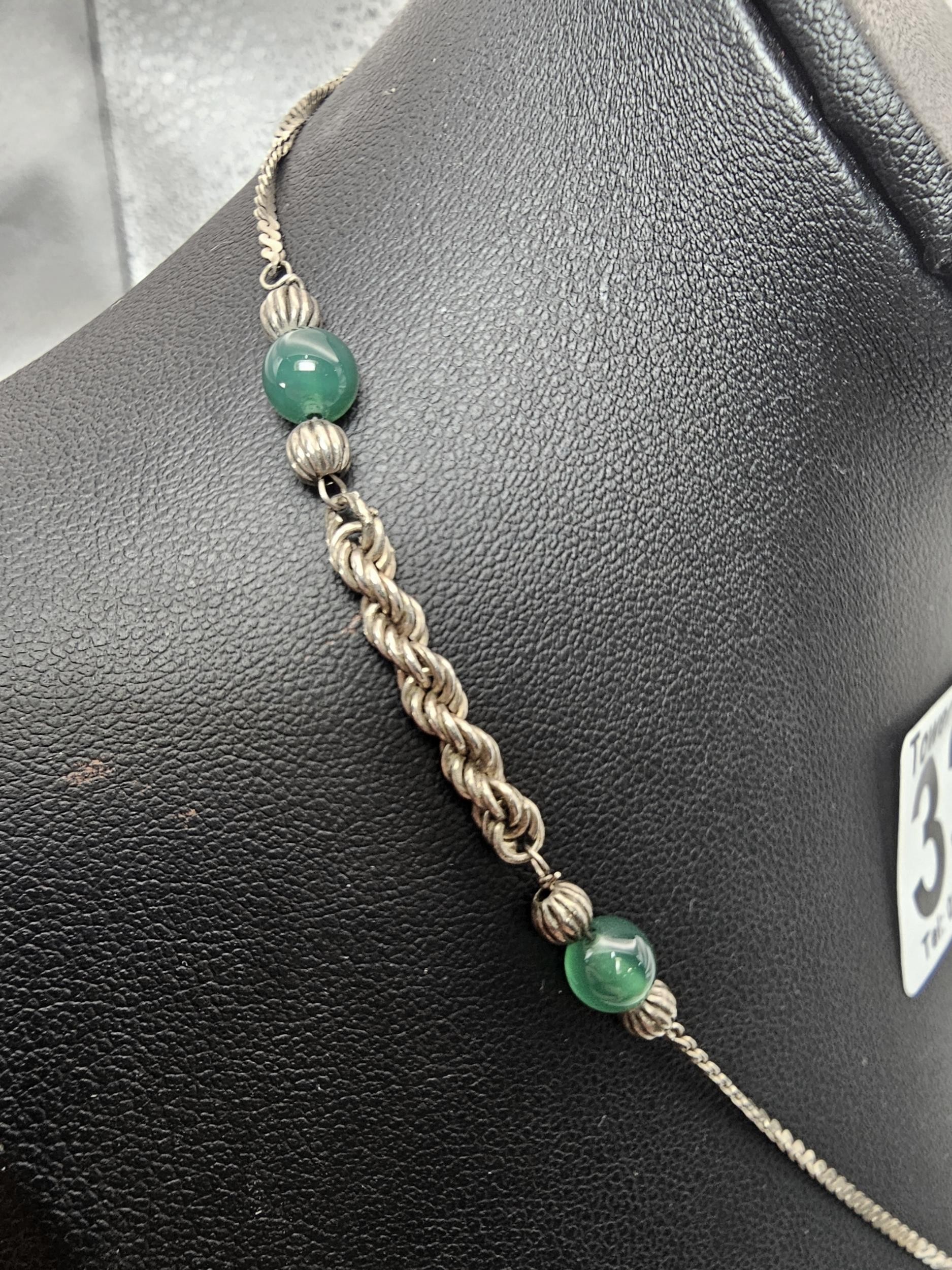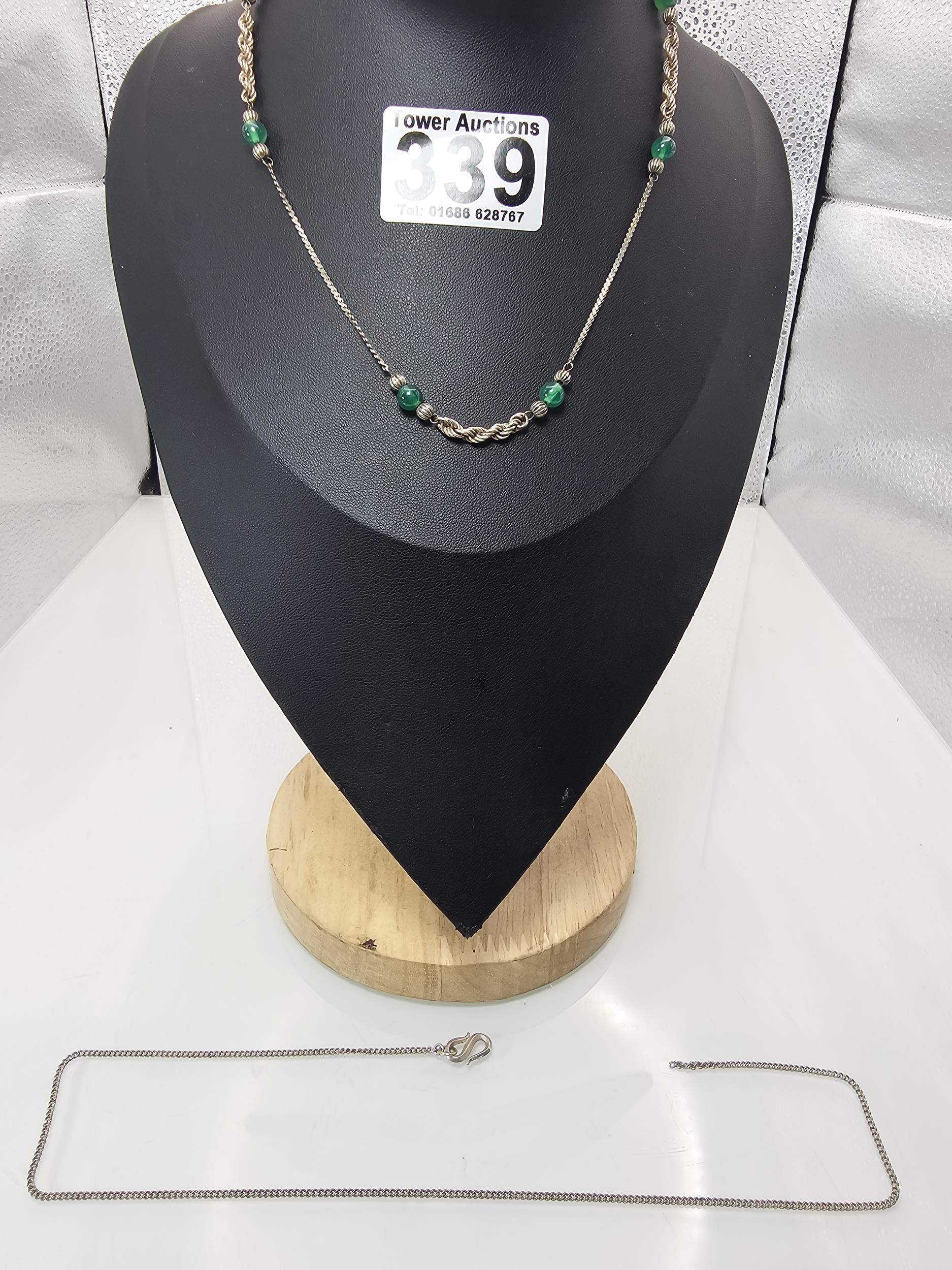 2x 925 Silver necklaces to include an interesting silver necklace with an middle eastern design featuring green onyx beads. The other necklace has a chunky hallmarked silver pendant on a 16inch silver chain, however this necklace is missing a hoop for the clasp. The other is in good order. Total weight of the tow silver necklaces is 14.1g