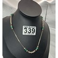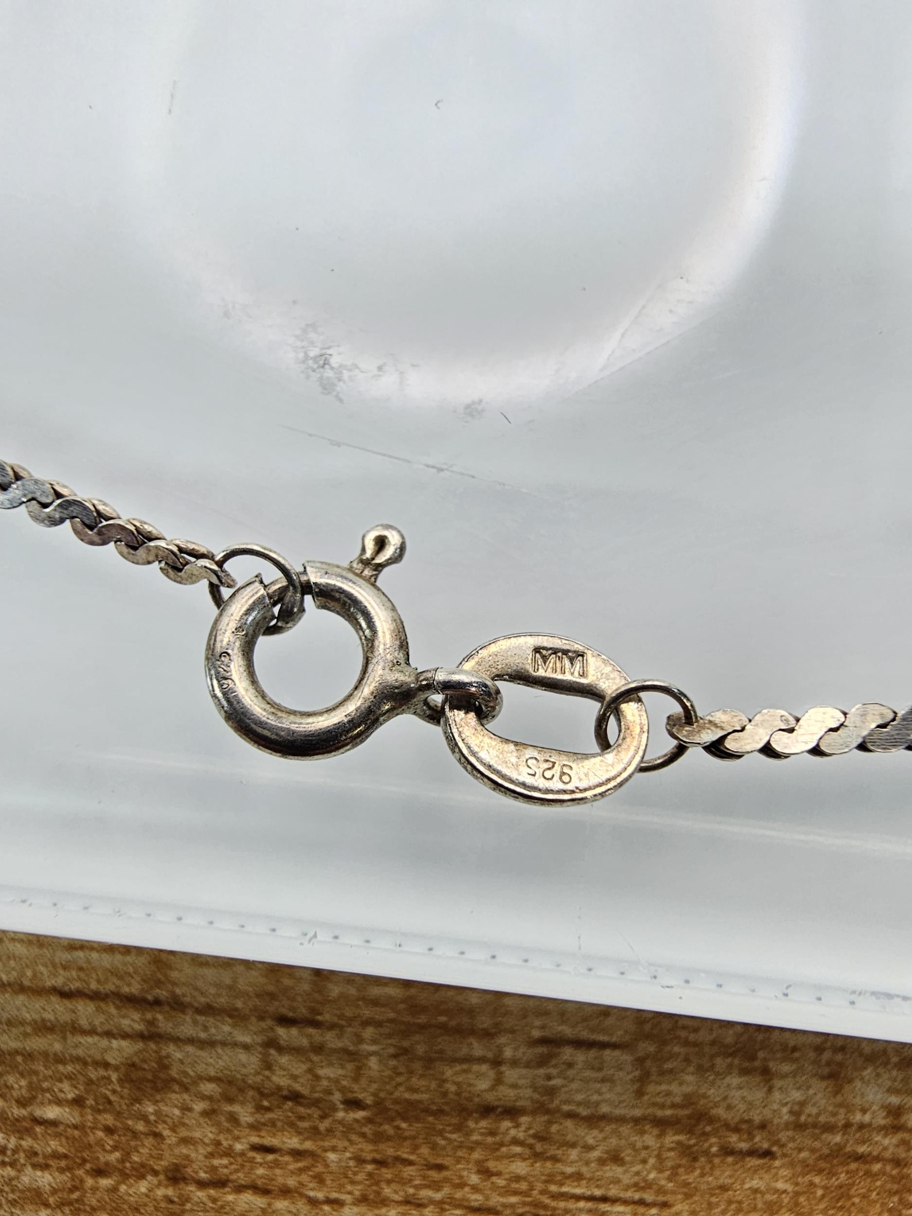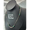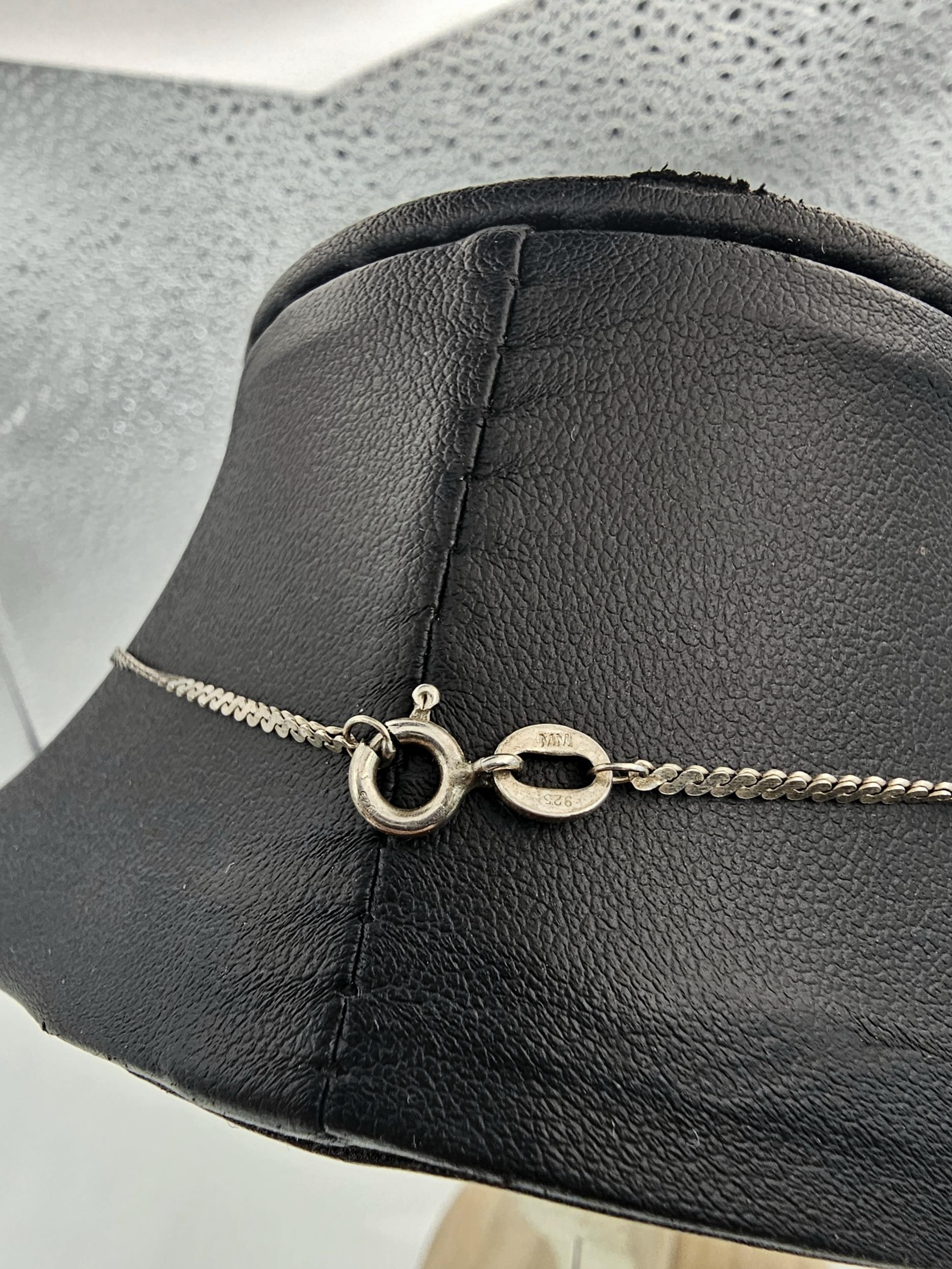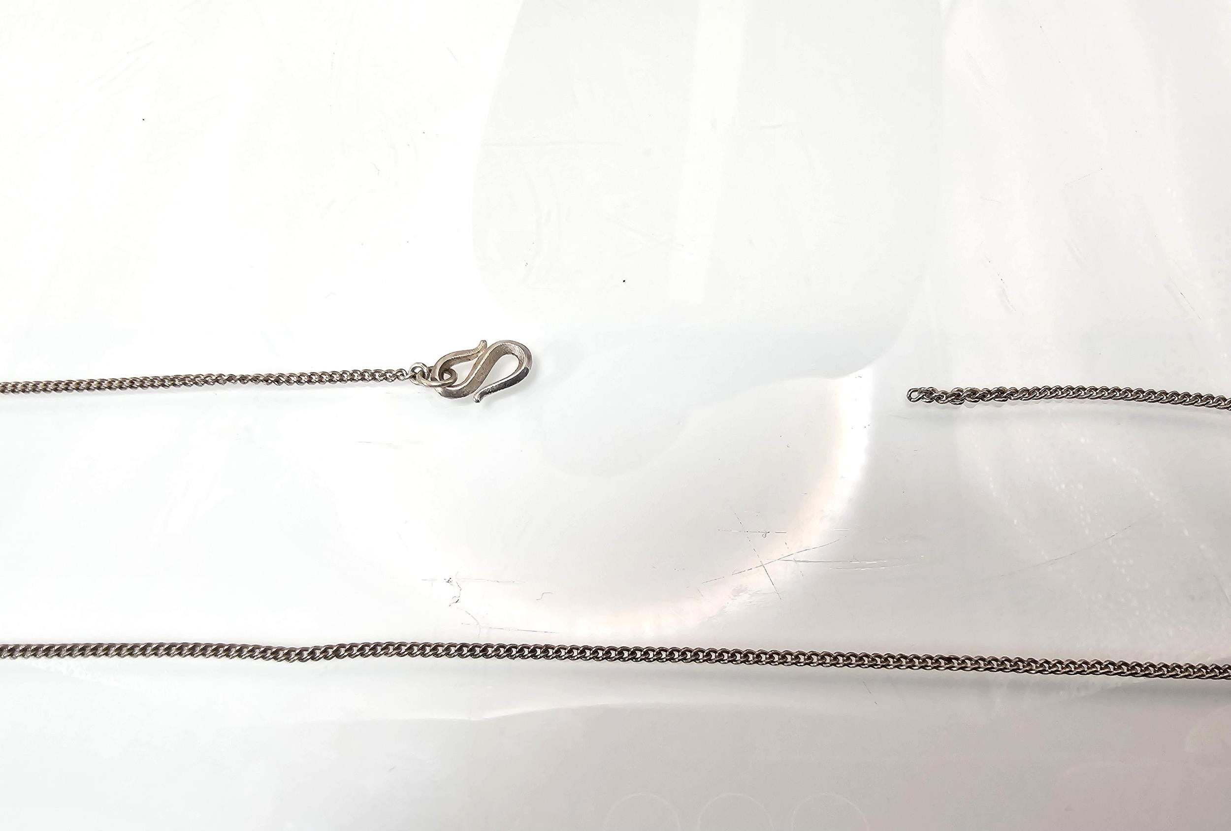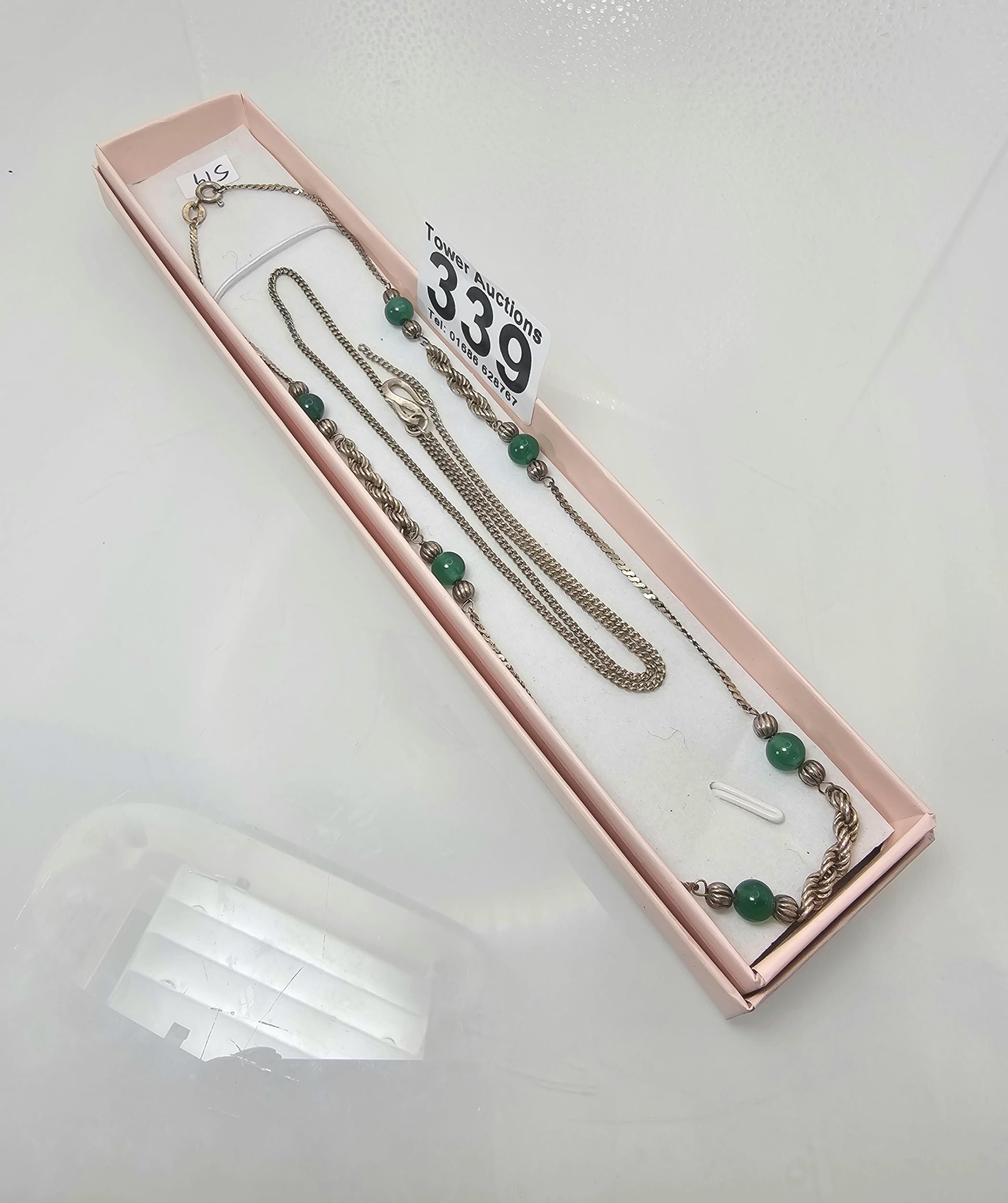 2x 925 Silver necklaces to include an interesting silver necklace with an middle eastern design featuring green onyx beads. The other necklace has a chunky hallmarked silver pendant on a 16inch silver chain, however this necklace is missing a hoop for the clasp. The other is in good order. Total weight of the tow silver necklaces is 14.1g