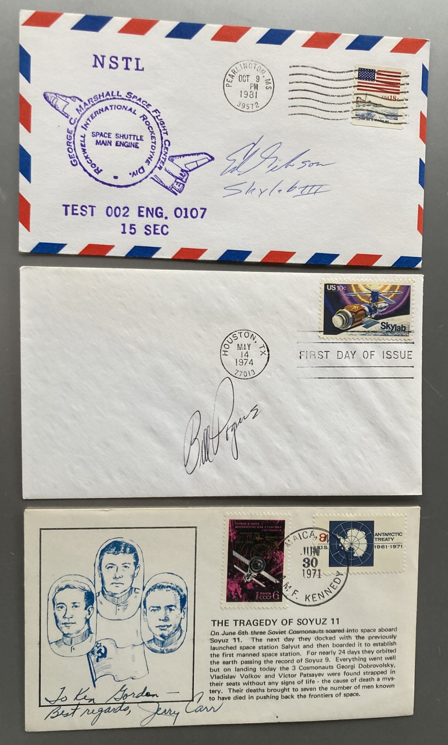 NASA Prime Crew of Third Manned Skylab Mission signed on three Space FDCs Gerald P. Carr, Edward G. Gibson and William Pogue. Carr is signed to Ken on a very rare Soyuz 11 Tragedy FDC. Single Vendor autograph collection. Good condition. All autographs come with a Certificate of Authenticity. We combine postage on multiple winning lots and can ship worldwide. UK postage from £5.99, EU from £7.99, Rest of World from £9.99