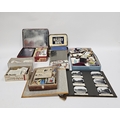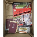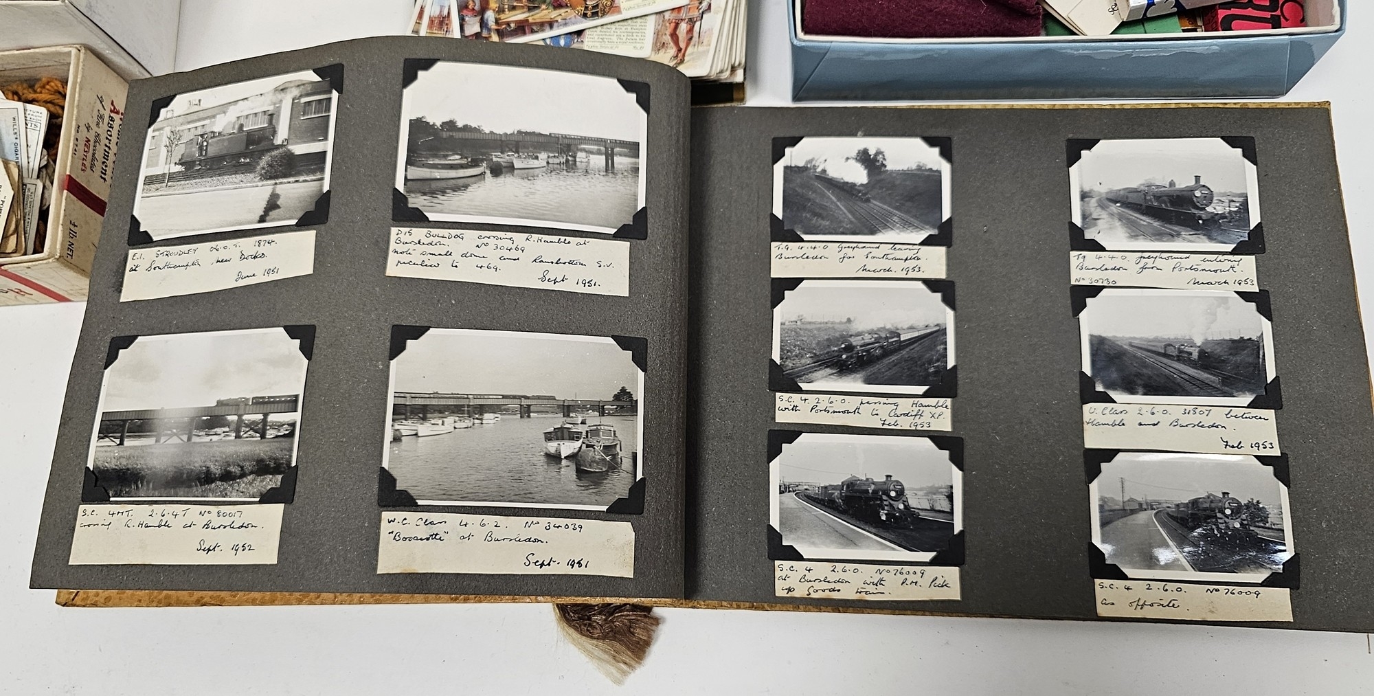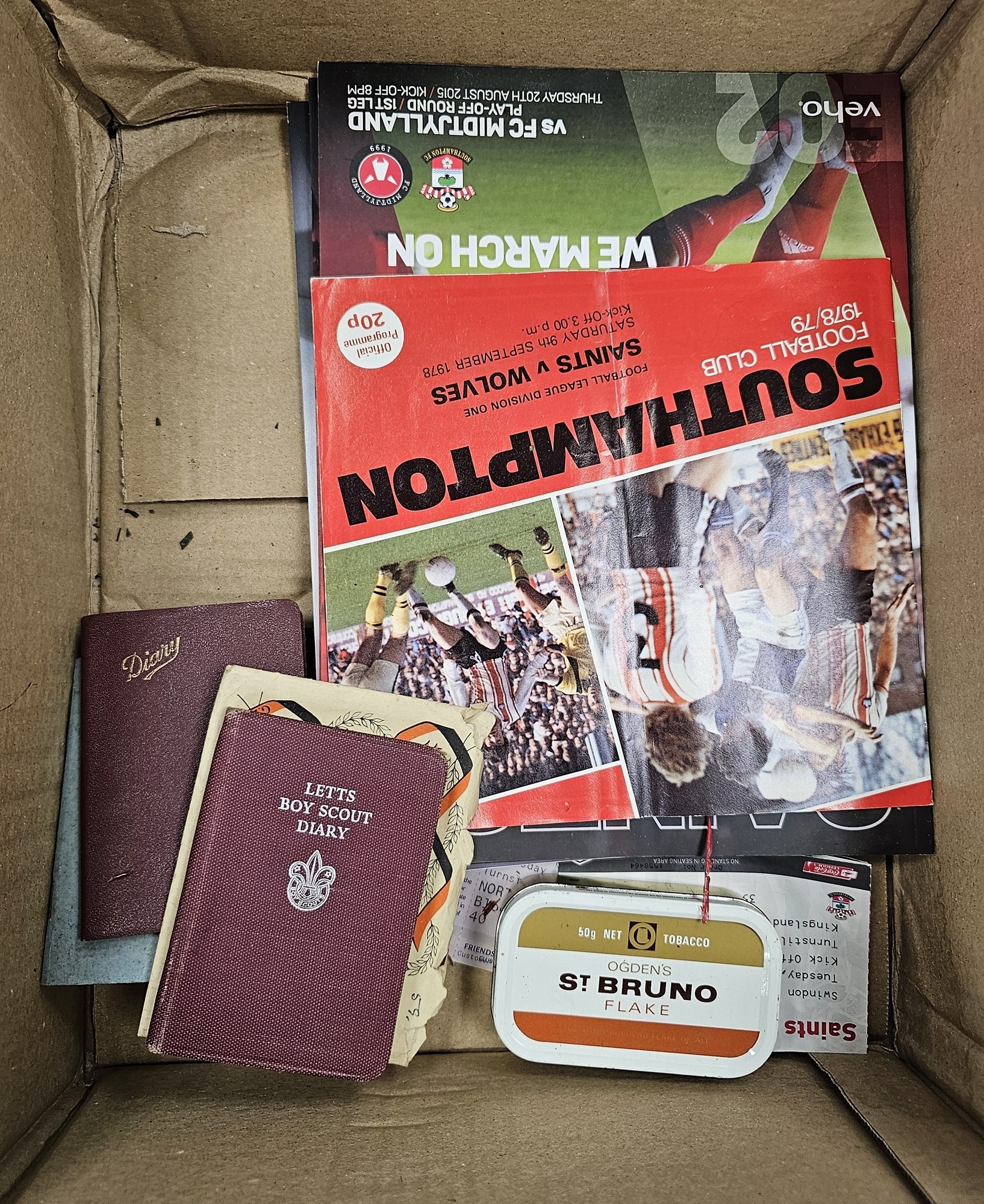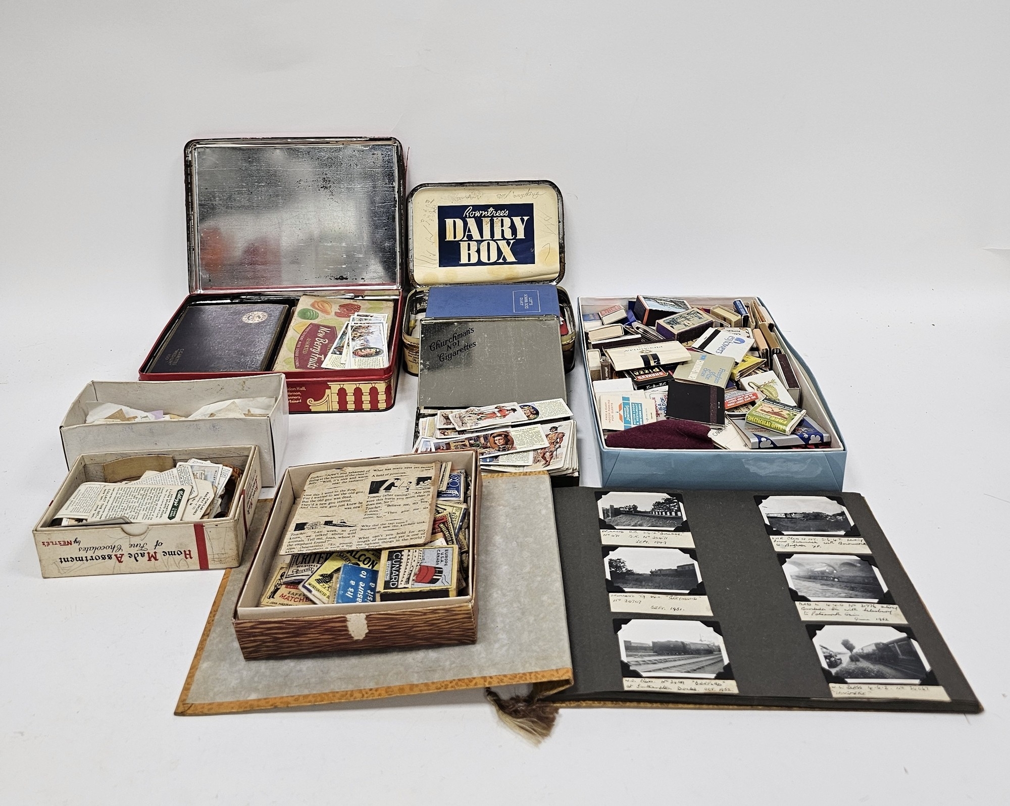 Mixed lot of ephemera and sporting items including cigarette and tea cards, photograph album partly filled with 1950's black and white photographs of trains, various stamps on paper, various matchboxes, Southampton Football Club programmes and match tickets, and other items