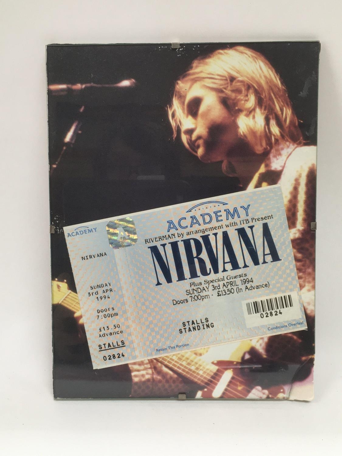 A rare and genuine unused ticket for Nirvana at the Brixton Academy on 3rd April 1994, number 02824, presented in a frame with an image of frontman Kurt Cobain.