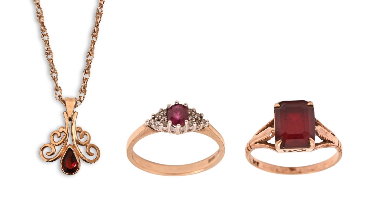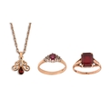 Two gold rings and a pendant and chain, variously gem set, 8g