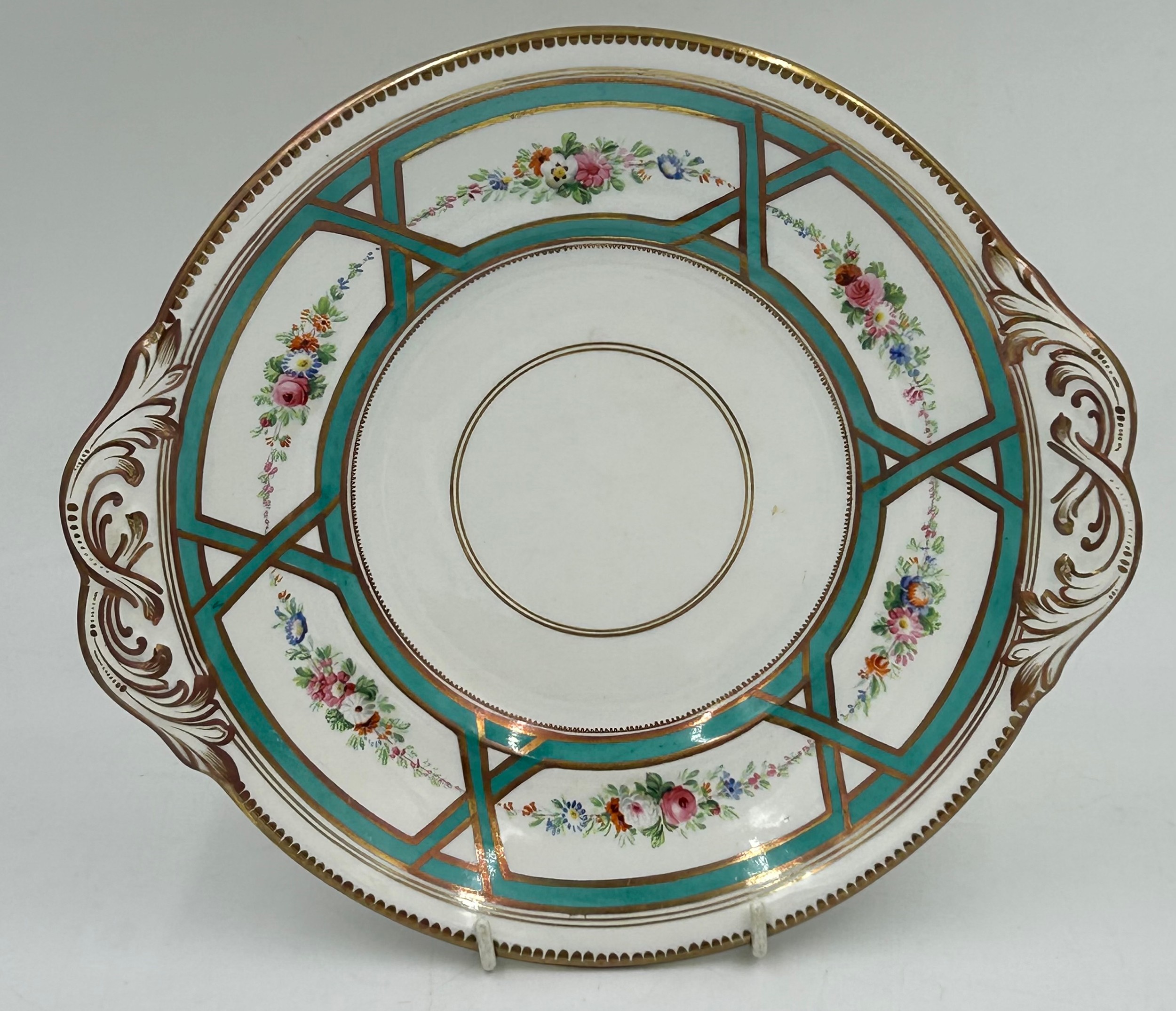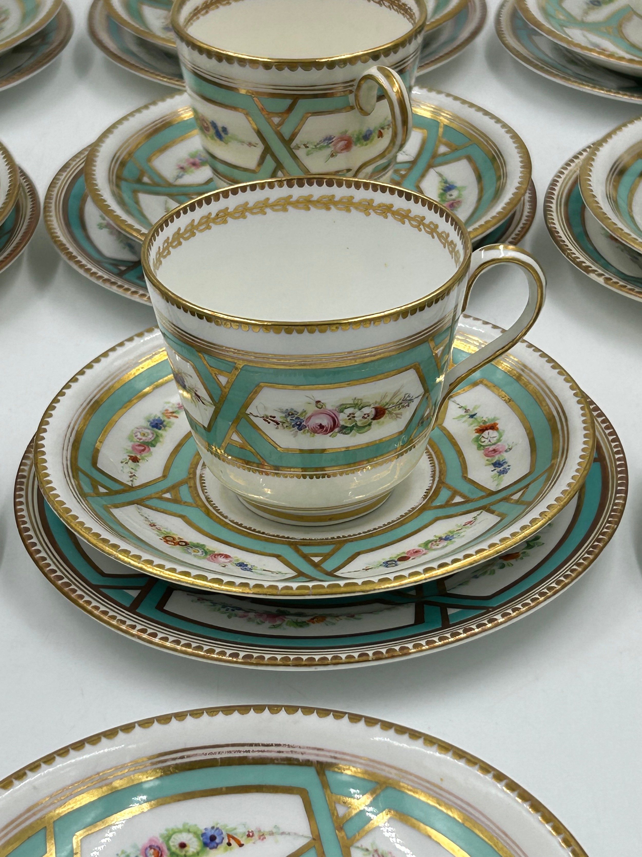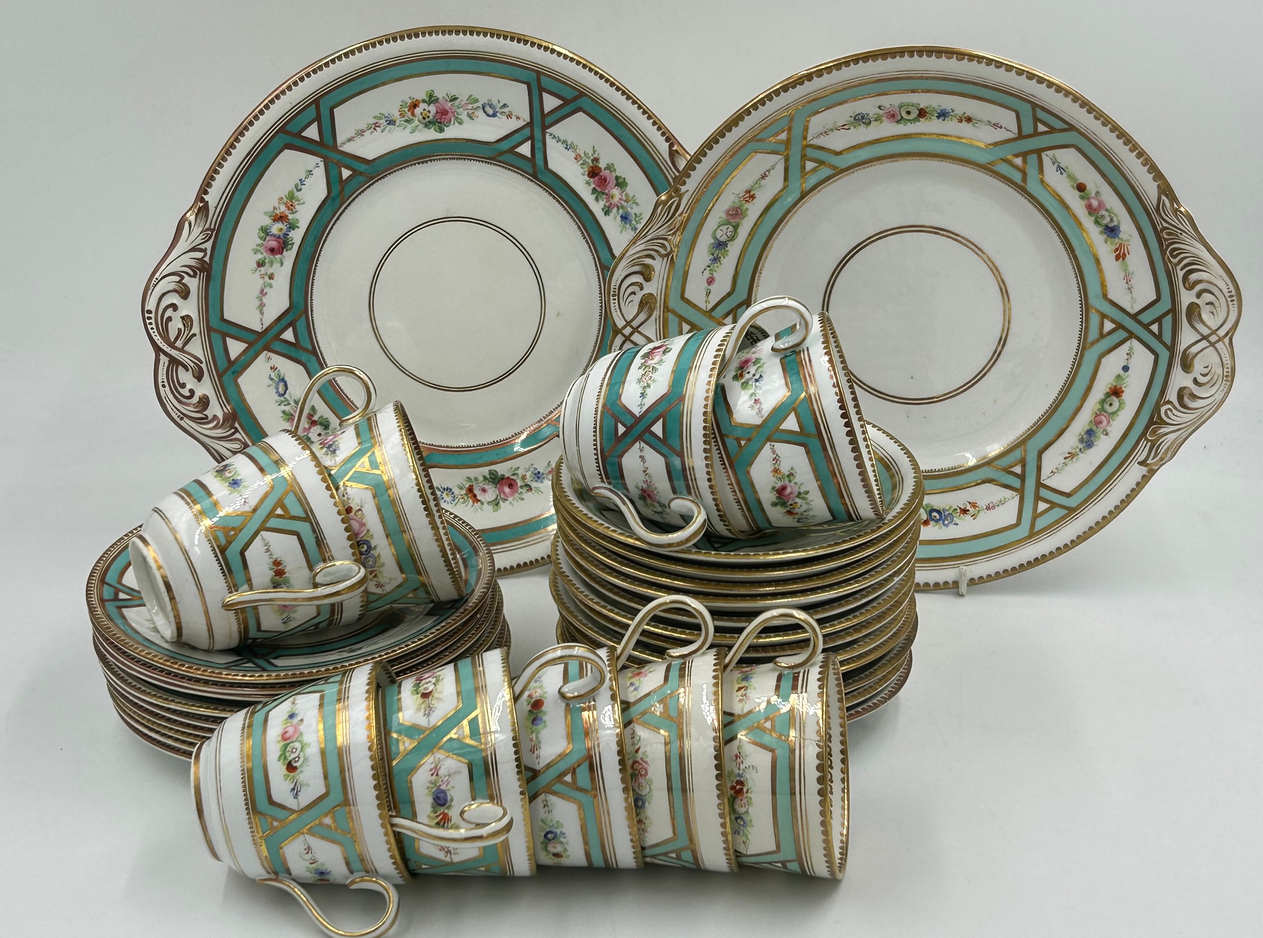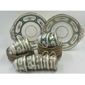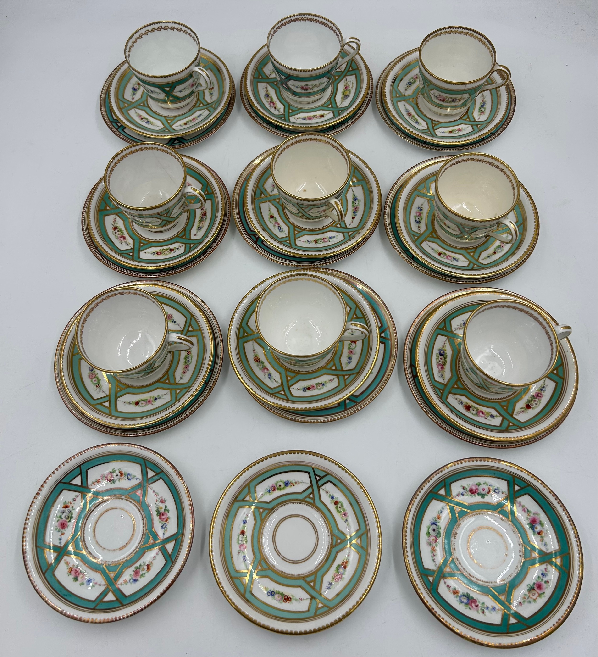 3 x cups with hairline cracks. Slight crackle to all, loss to gilt to some. Hairline crack to tea plate.