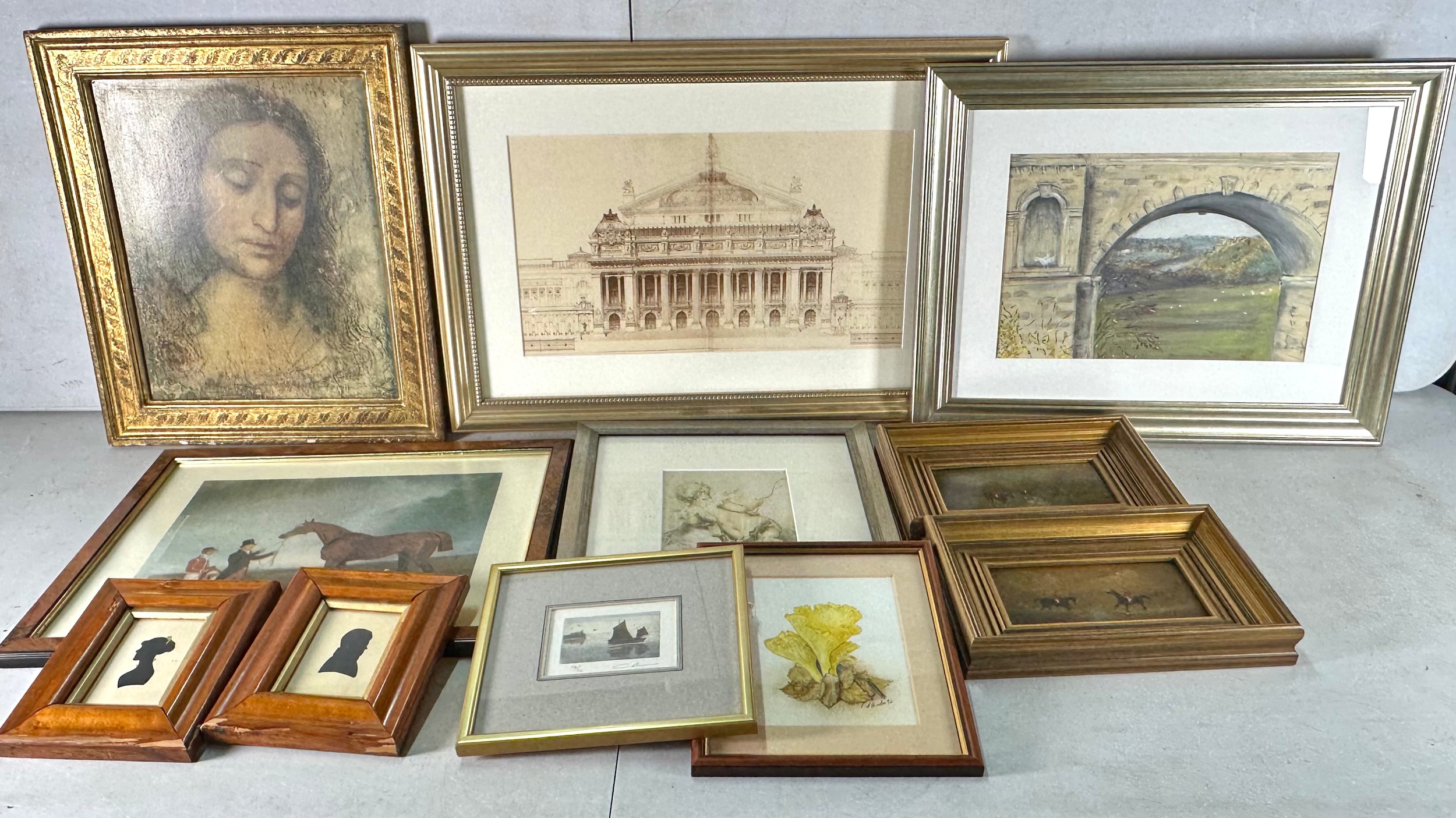 Two small framed silhouettes, two pictures of huntsman on horses, together with a quantity of framed prints
