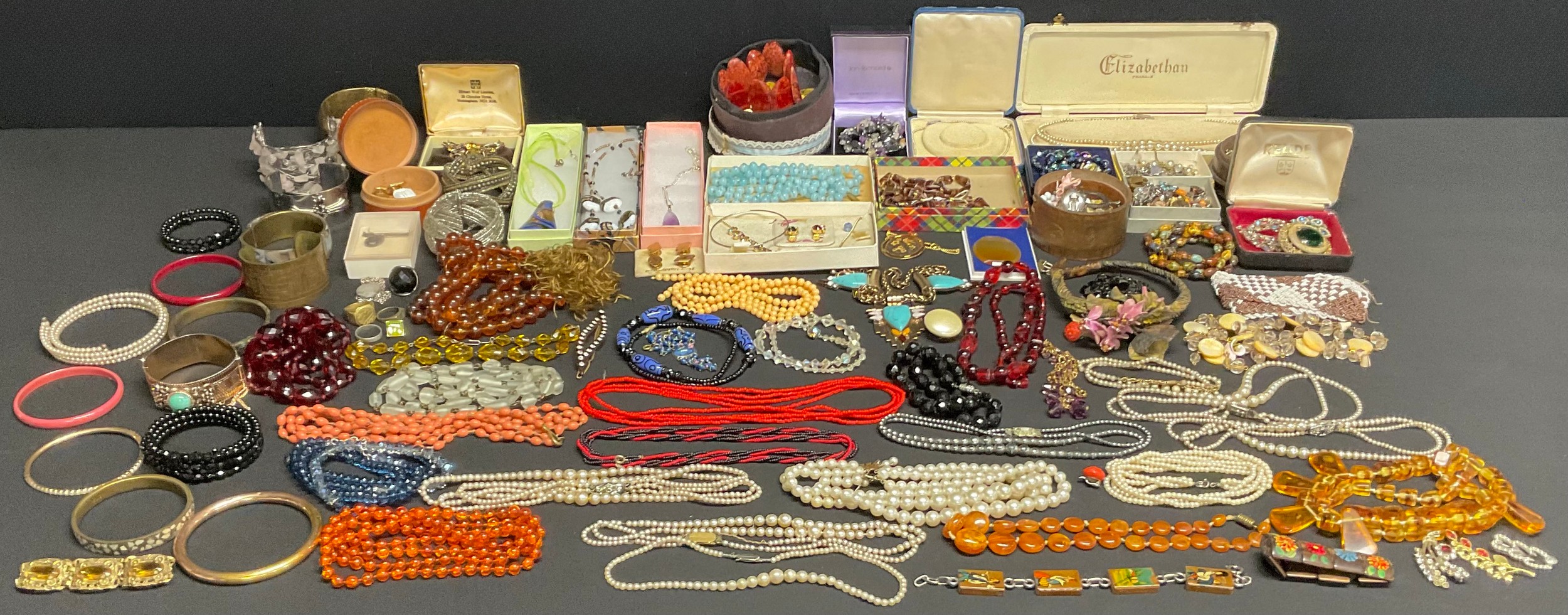 to include simulated pearl necklaces, bangles, bracelets, plastic, glass and base metal necklaces, clip on earrings and costume rings
